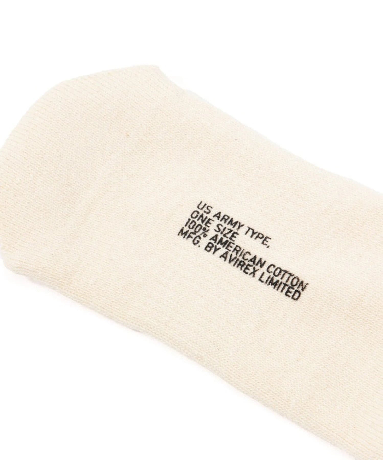 AVIREXらしさを感じさせるデザインに仕上げたソックス。足底にはミリタリーテイストを感じさせるステンシルプリントを施し、さりげないアクセントをプラスしています。素材にはUSAコットンを使用し、程よい厚みと快適な履き心地を実現。スニーカーやブーツとも相性が良く、デイリーなカジュアルスタイリングに気軽に取り入れられるアイテムです。シンプルながらもブランドらしさが光るため、自分用はもちろん、ちょっとしたギフトにもおすすめの一足。