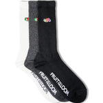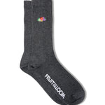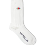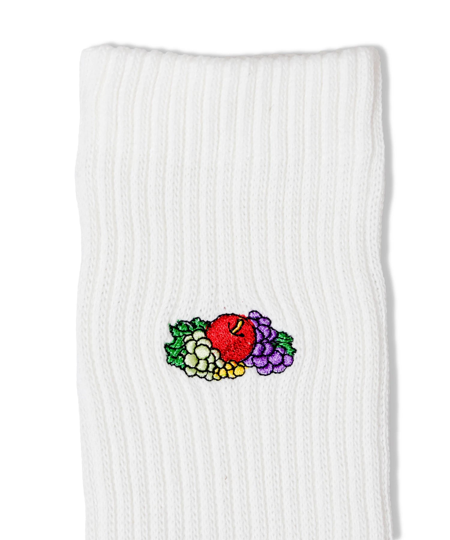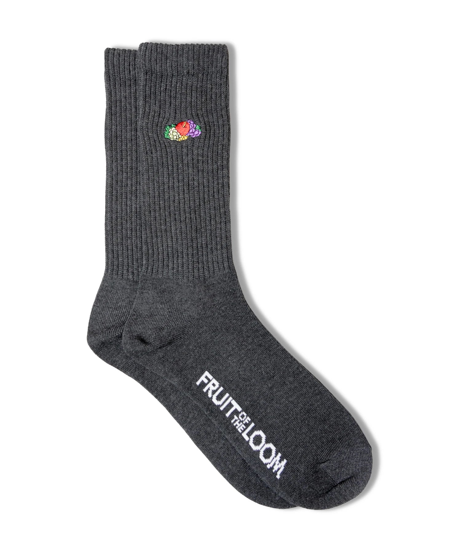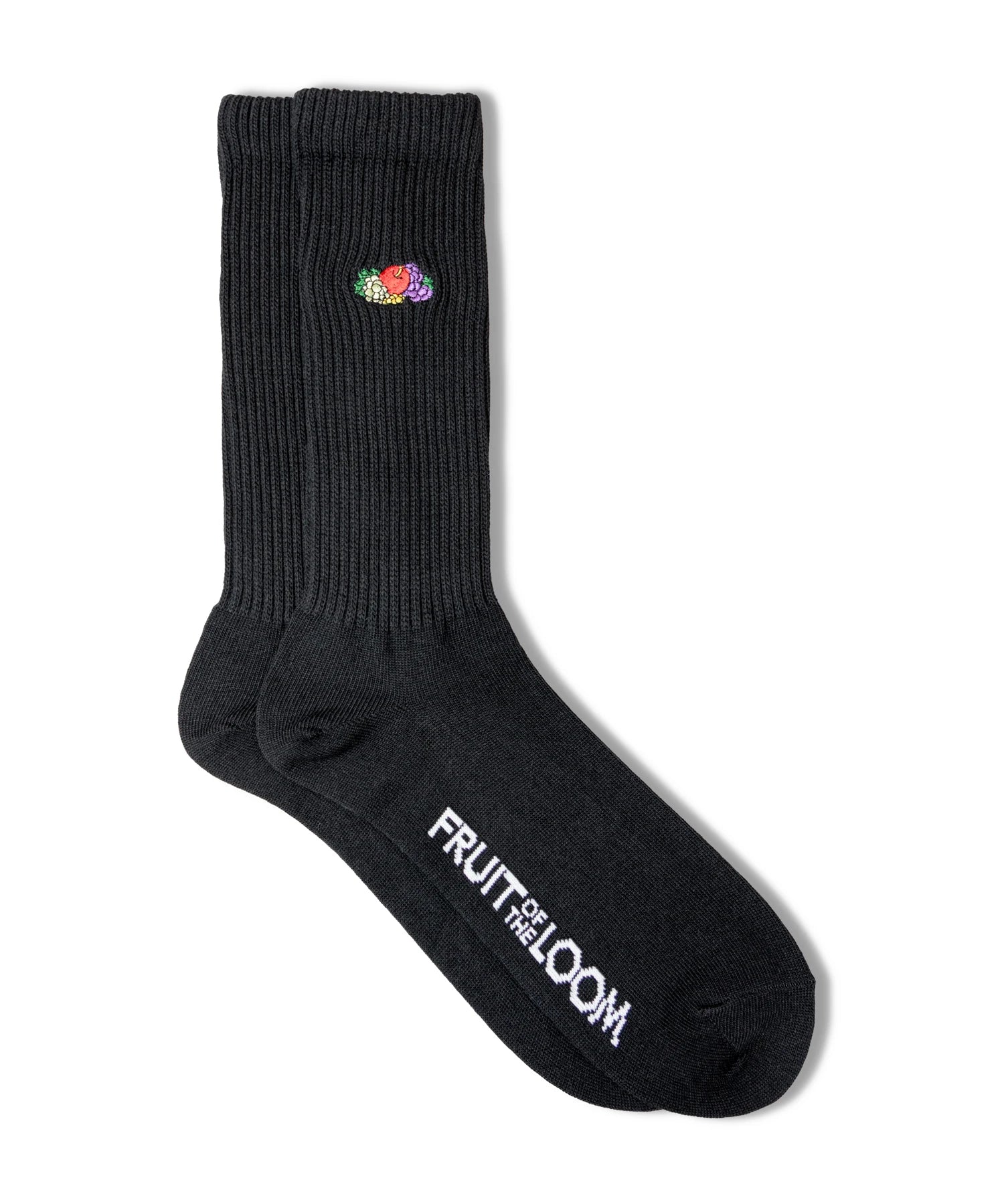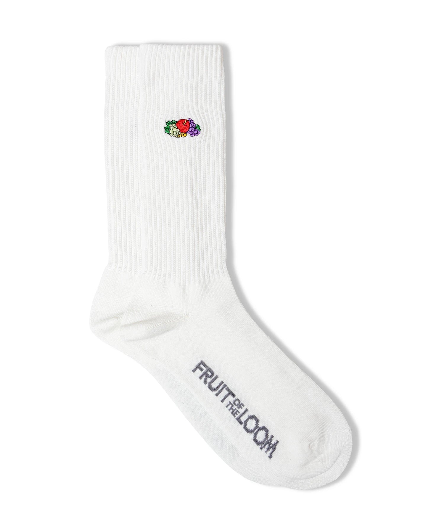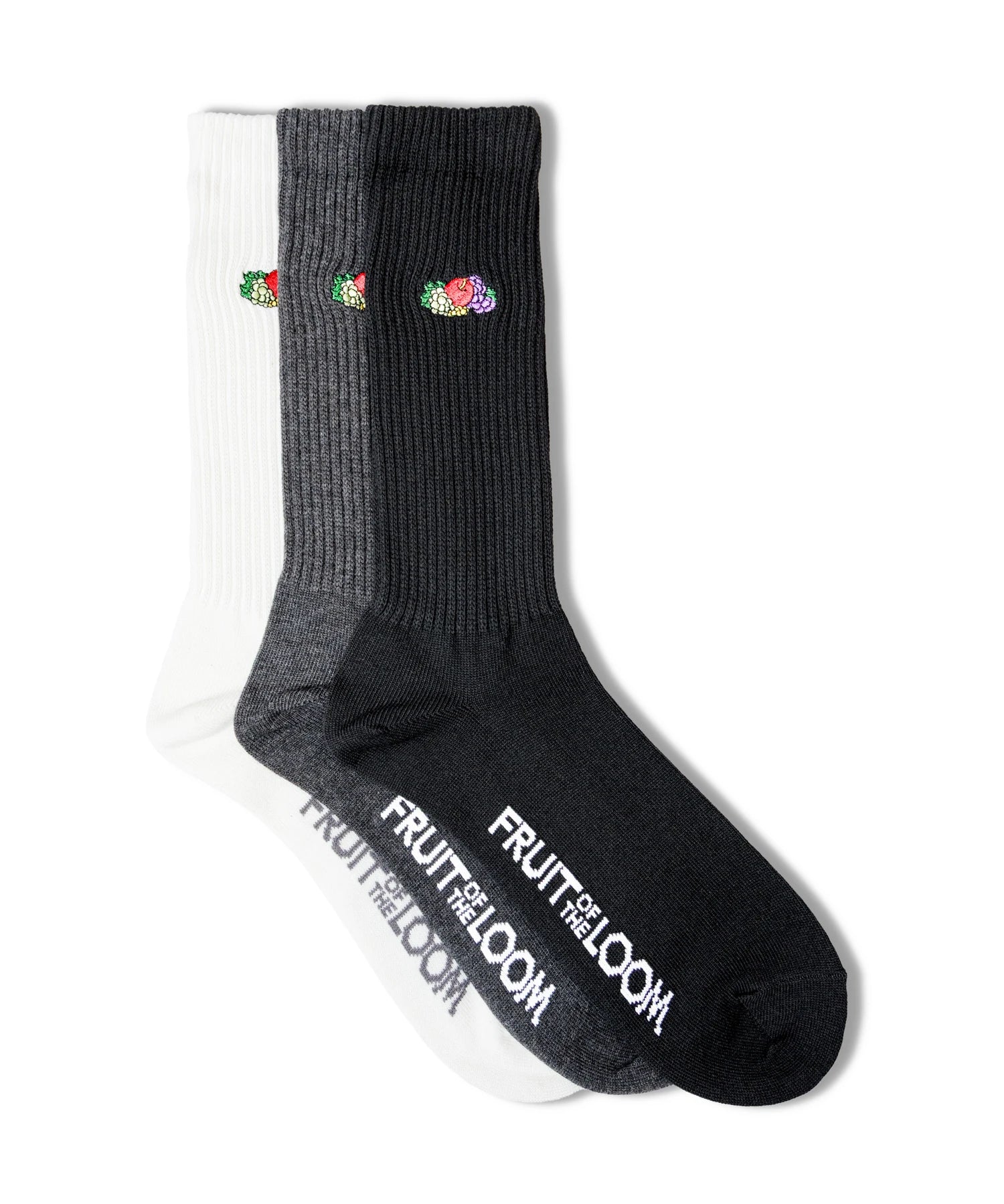 FRUIT OF THE LOOM ロゴ刺繍 クルー ソックス 3足セットの登場。 FRUIT OF THE LOOM(フルーツオブザルーム)より、ベーシックなカラーリングとハイクオリティな仕上がりのソックス3足セットが登場しました。 生地は肌触りの良いソフトな素材感で、伸縮性も良く足にフィットする快適な履き心地。底部分のクッションはパイル生地を使用しているので、クッション性と吸水性に優れており、優しく足を包み込み心地よい着用感です。 丈感は、どのコーデイネートにも合わせやすいクルー丈で、通年を通してスニーカーやサンダルに合わせて楽しんで頂けます。底部分のネームロゴとリブ部分のフルーツロゴの刺繍が良いアクセントに。