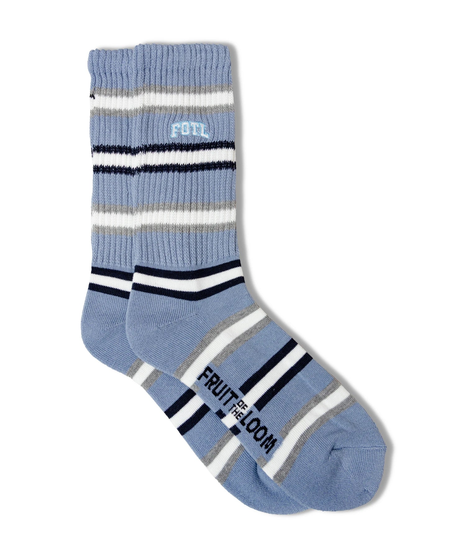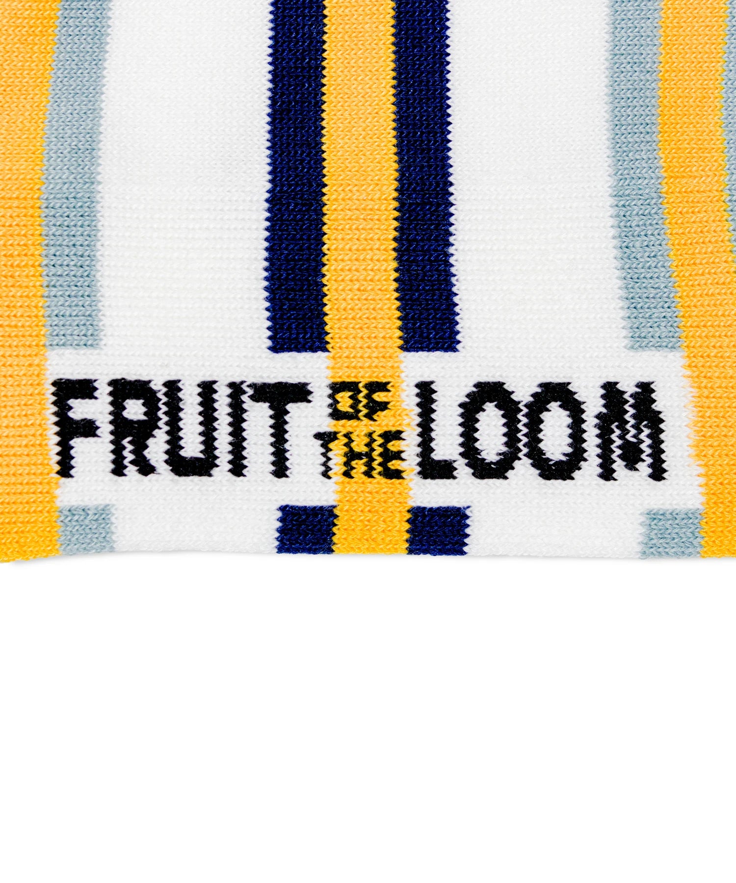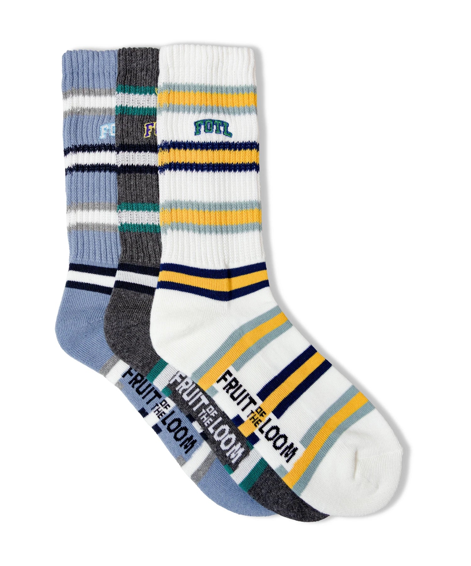 FRUIT OF THE LOOMマルチボーダークルー ソックス3足セットの登場。 締め付けを感じないゆったりとした着用感が特徴で、ルーズに履きこなすことができます。クッション性とコンプレッション機能が備わったソックス、刺繡ロゴもアクセントに。肌触りのよいソフトタッチな素材感で、伸縮性も良く足に気持ちよくフィット。