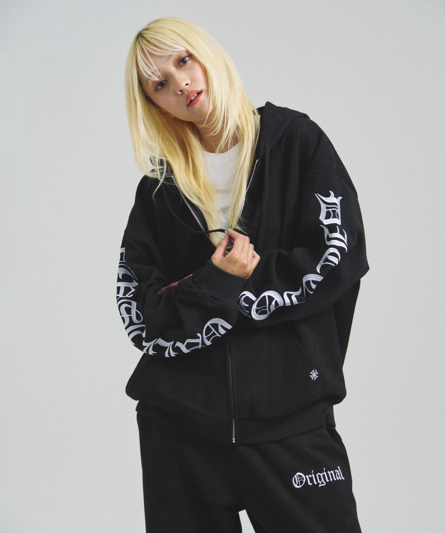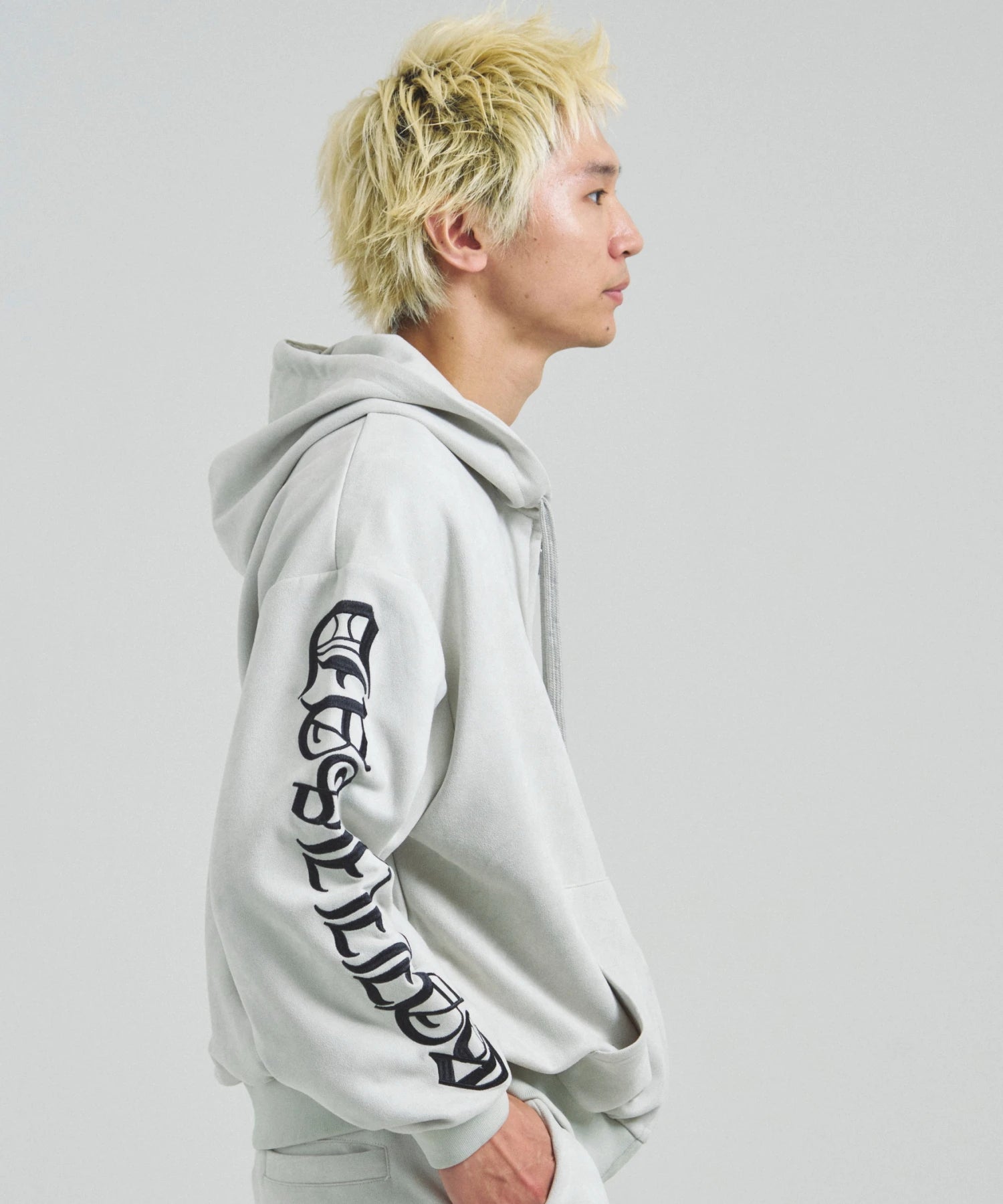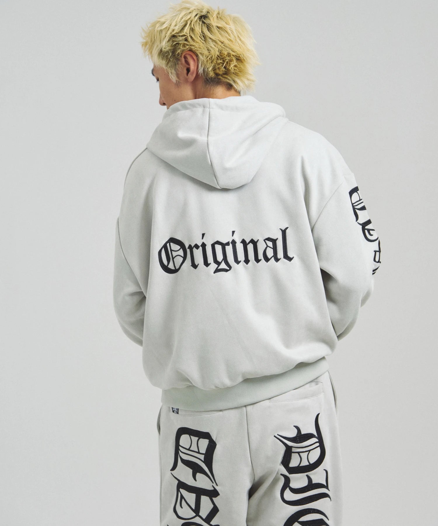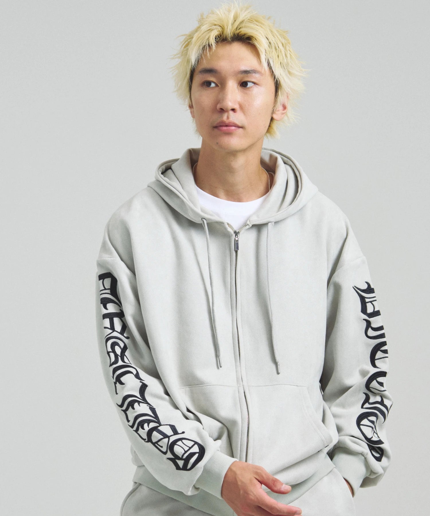 GALLIS ADDICTIONから大胆なOLD ENGLISHロゴ刺繍が存在感を放つジップフーディ。袖から背面にかけて施された迫力ある刺繍デザインが、ストリートスタイルに映える仕上がりです。柔らかく伸縮性のあるスウェードライク素材を使用し、快適な着心地とトレンド感を両立。男女問わずユニセックスで着用可能なリラックスシルエット。