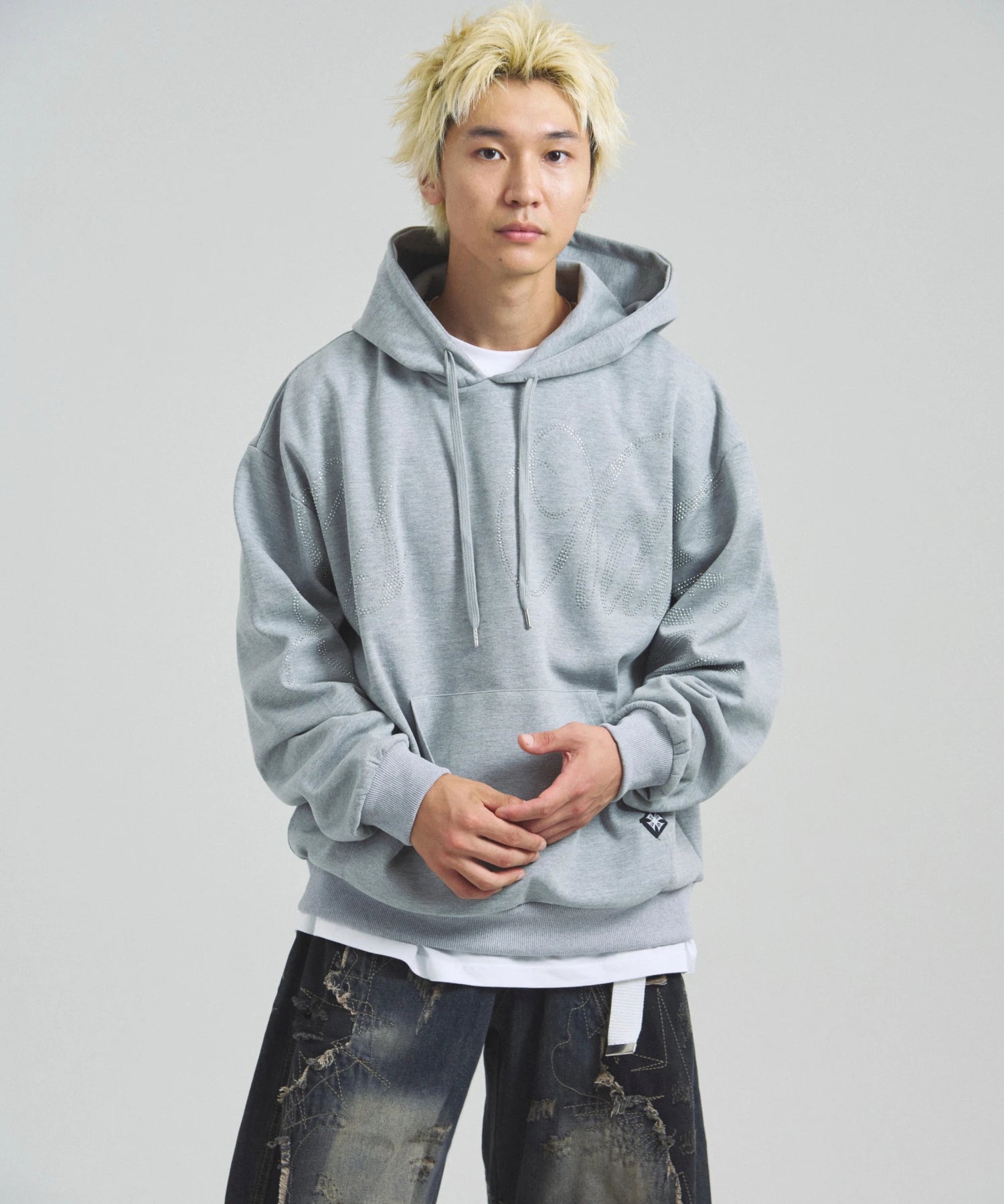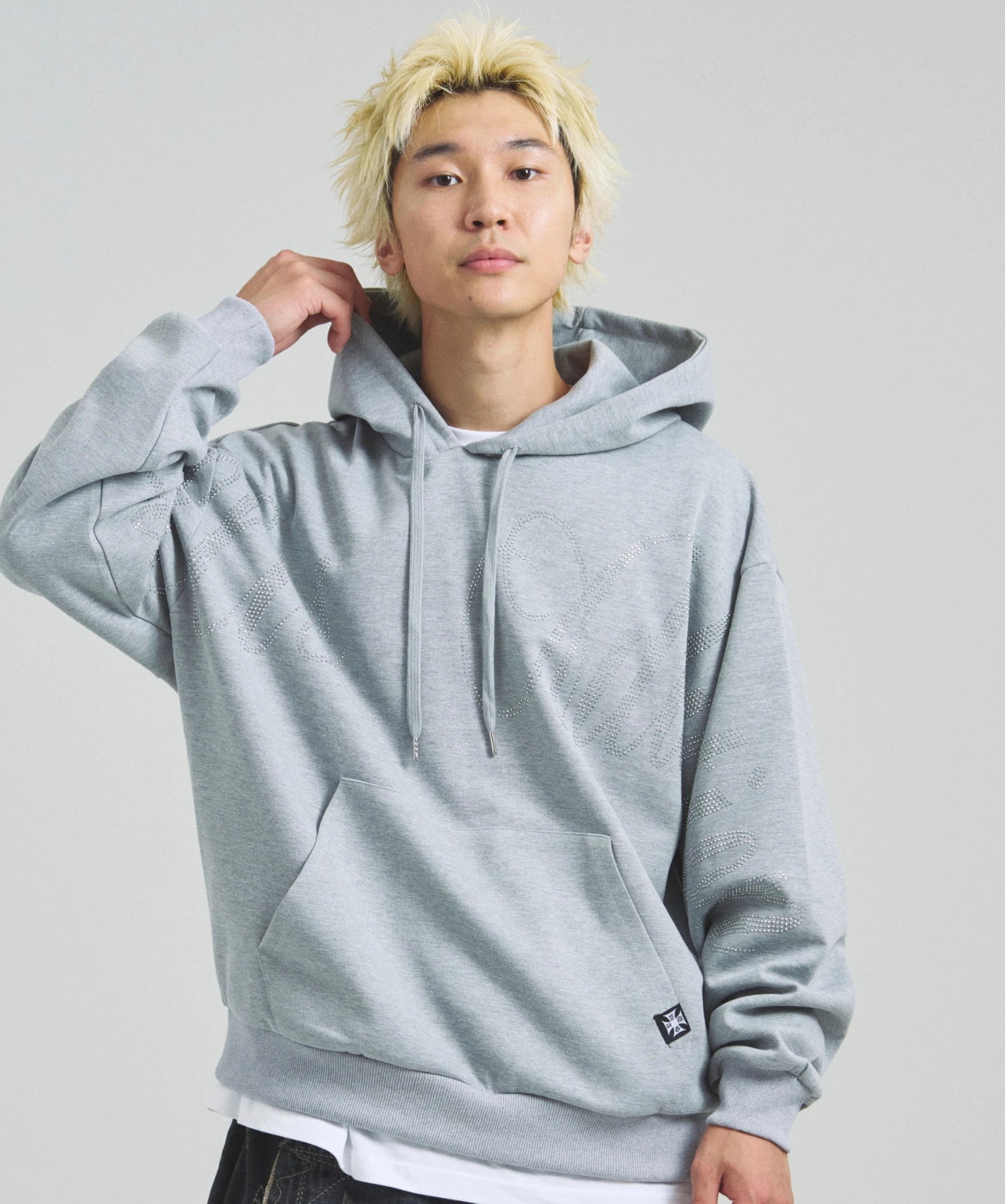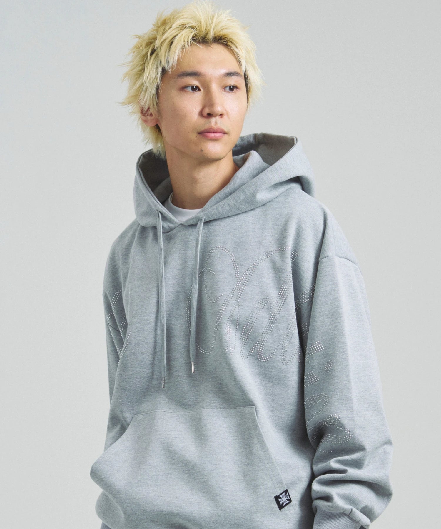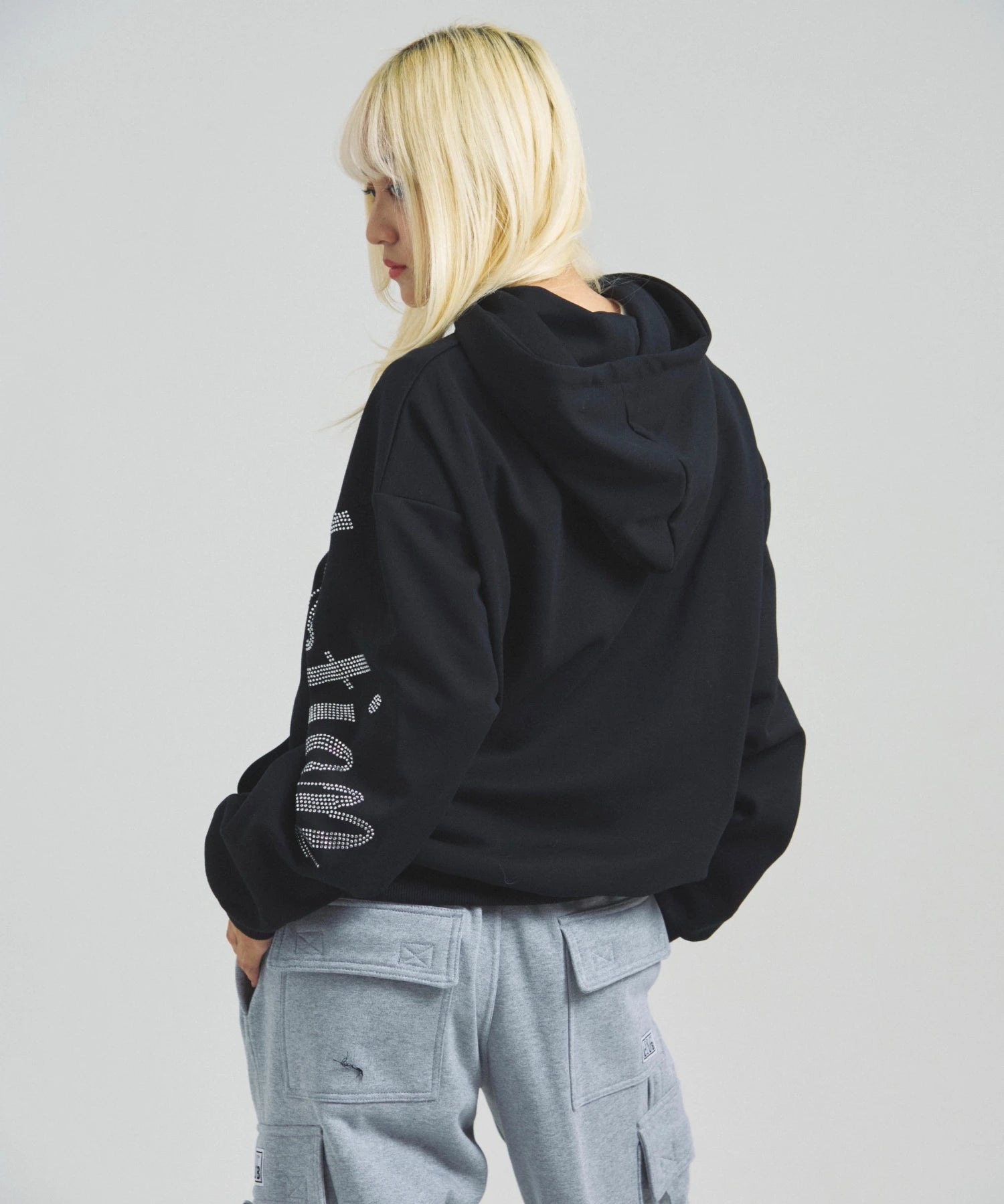 GALLIS ADDICTIONからフロントから袖にかけて大胆にあしらったラインストーンロゴが存在感抜群のフーディー。