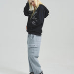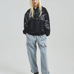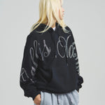 ・フロントから袖まで繋がるビッグロゴデザイン・煌めくラインストーンでストリート感をプラス・ユニセックス仕様のリラックスシルエット・程よい厚みと柔らかな風合いで、快適な着心地を実現