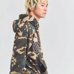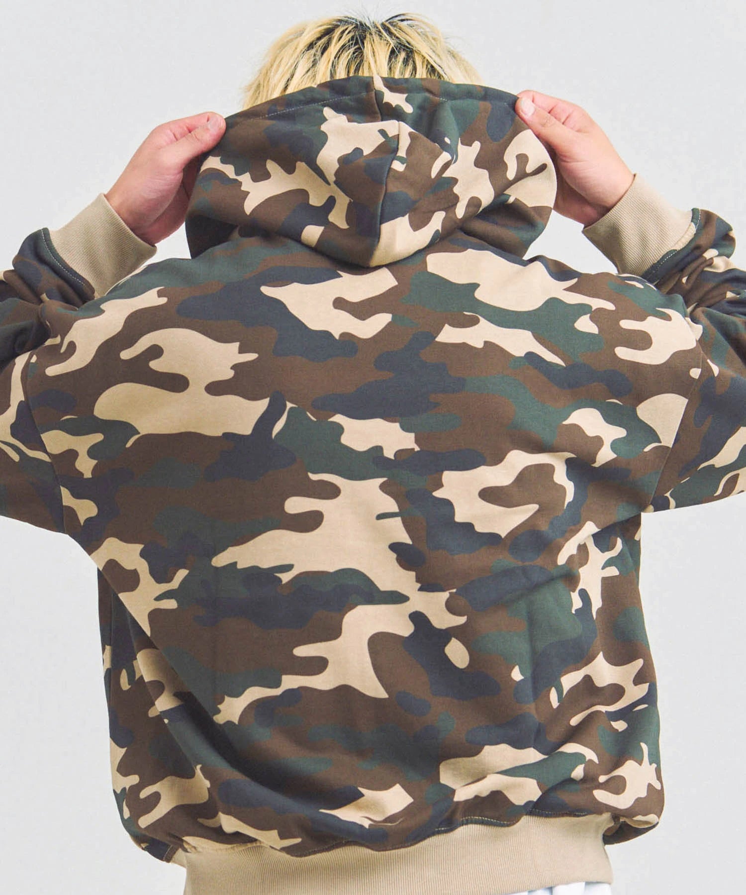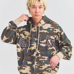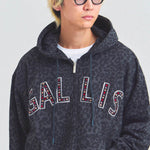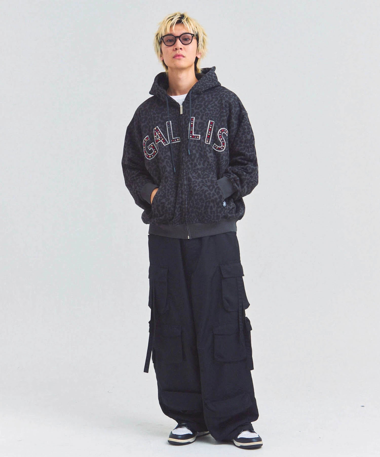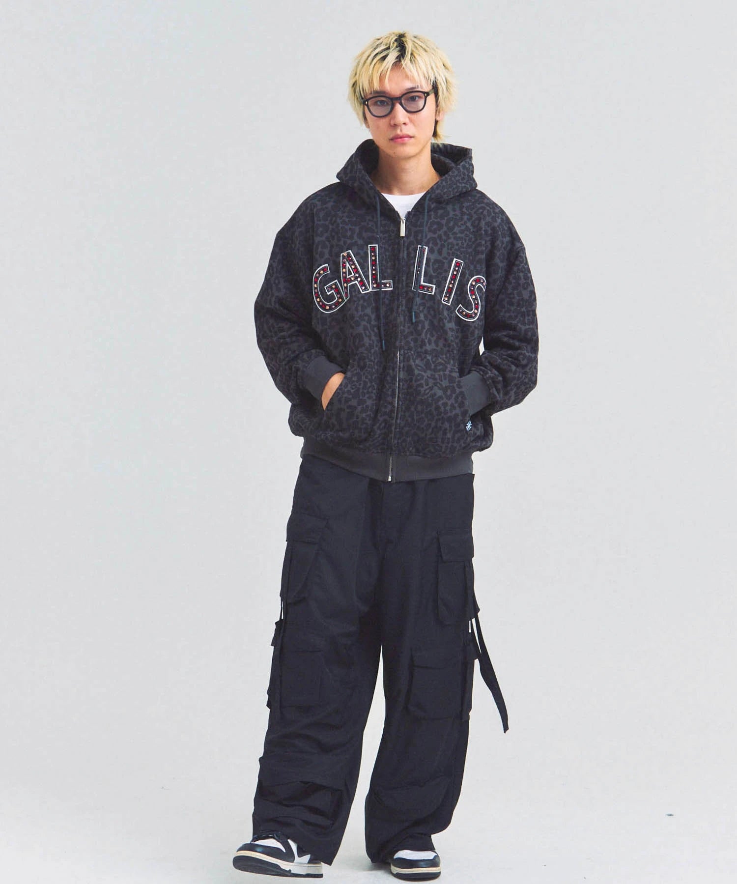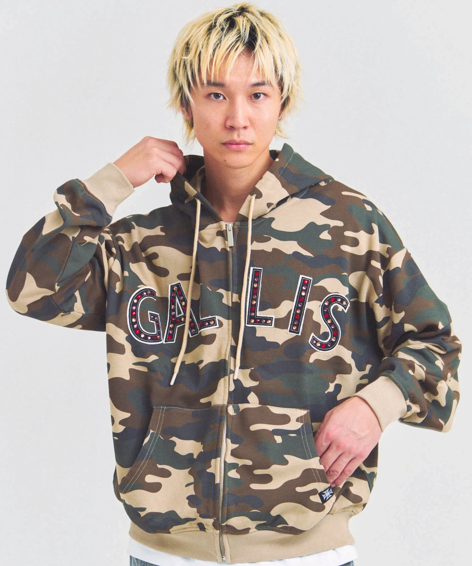 GALLIS ADDICTIONのストリートジップフーディ。カモフラージュ柄とレオパード柄の大胆な総柄デザインに "GALLIS" のロゴをストーンで表現。羽織るだけでストリートコーデの主役に。ゆったりとしたシルエットで、TシャツやロンTとのレイヤードも自由自在。メンズ・レディース問わずユニセックスで着用可能。休日のカジュアルスタイル、フェス、ライブ、街歩きなど幅広いシーンで活躍します。