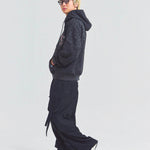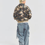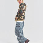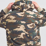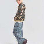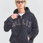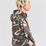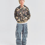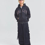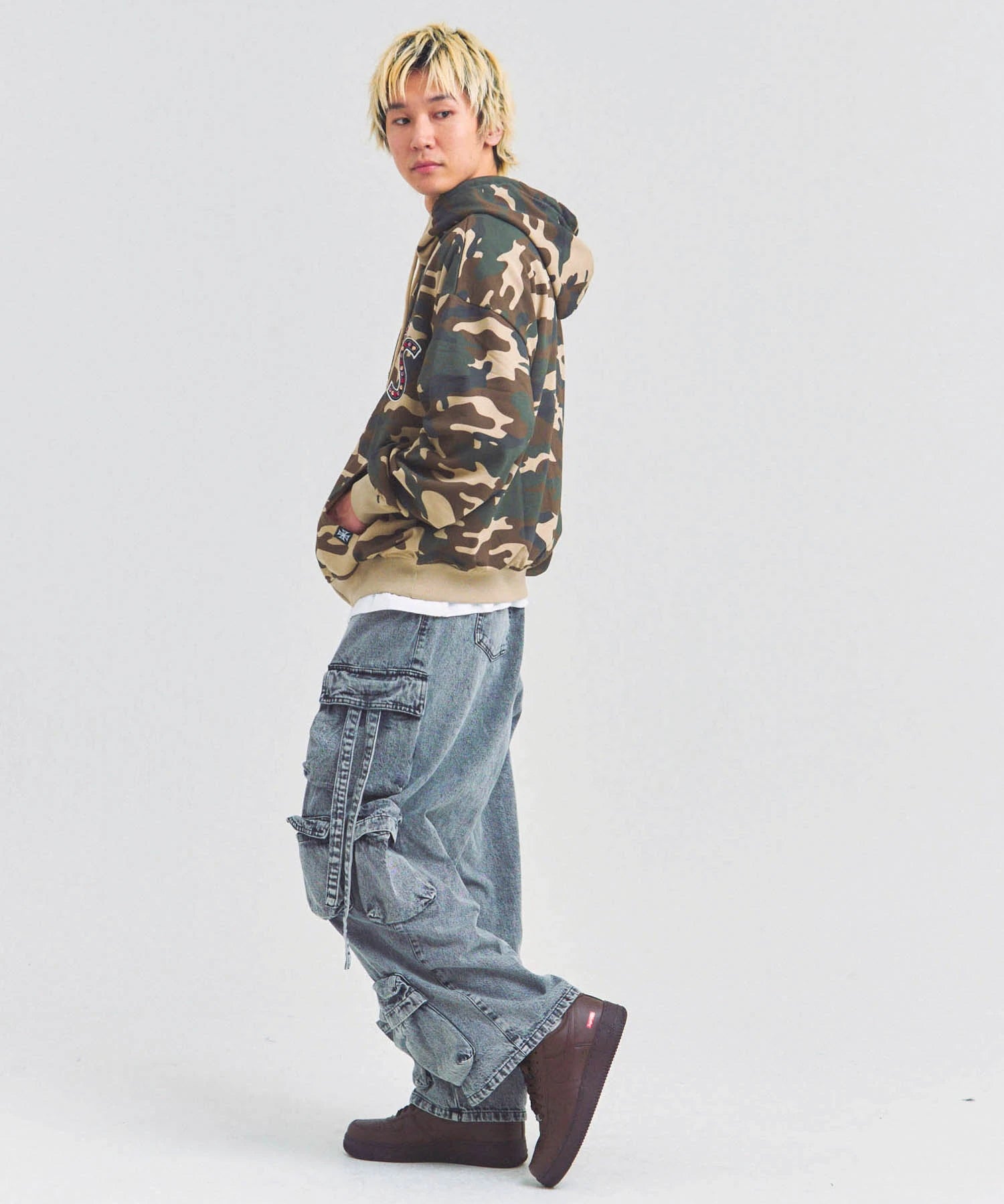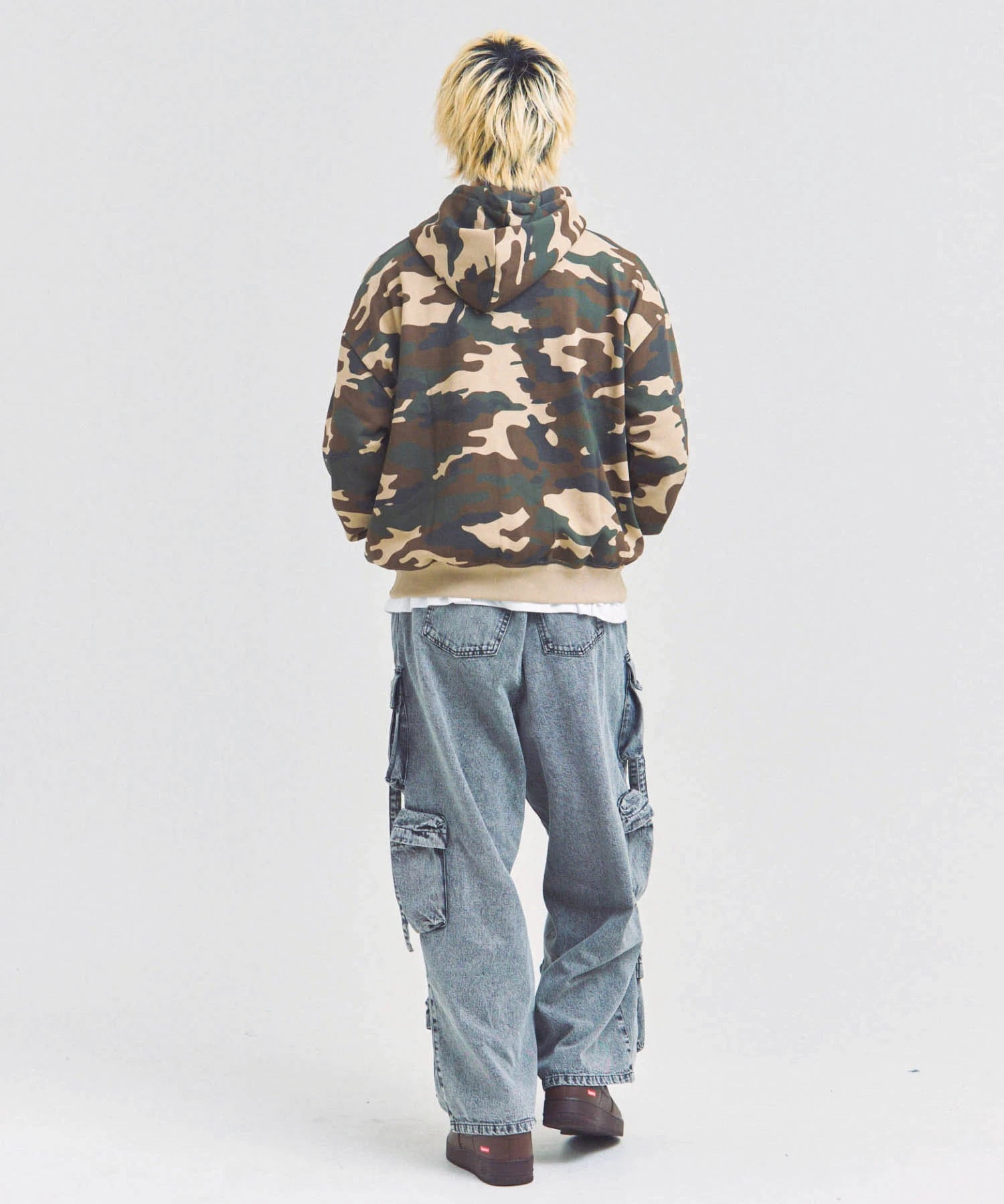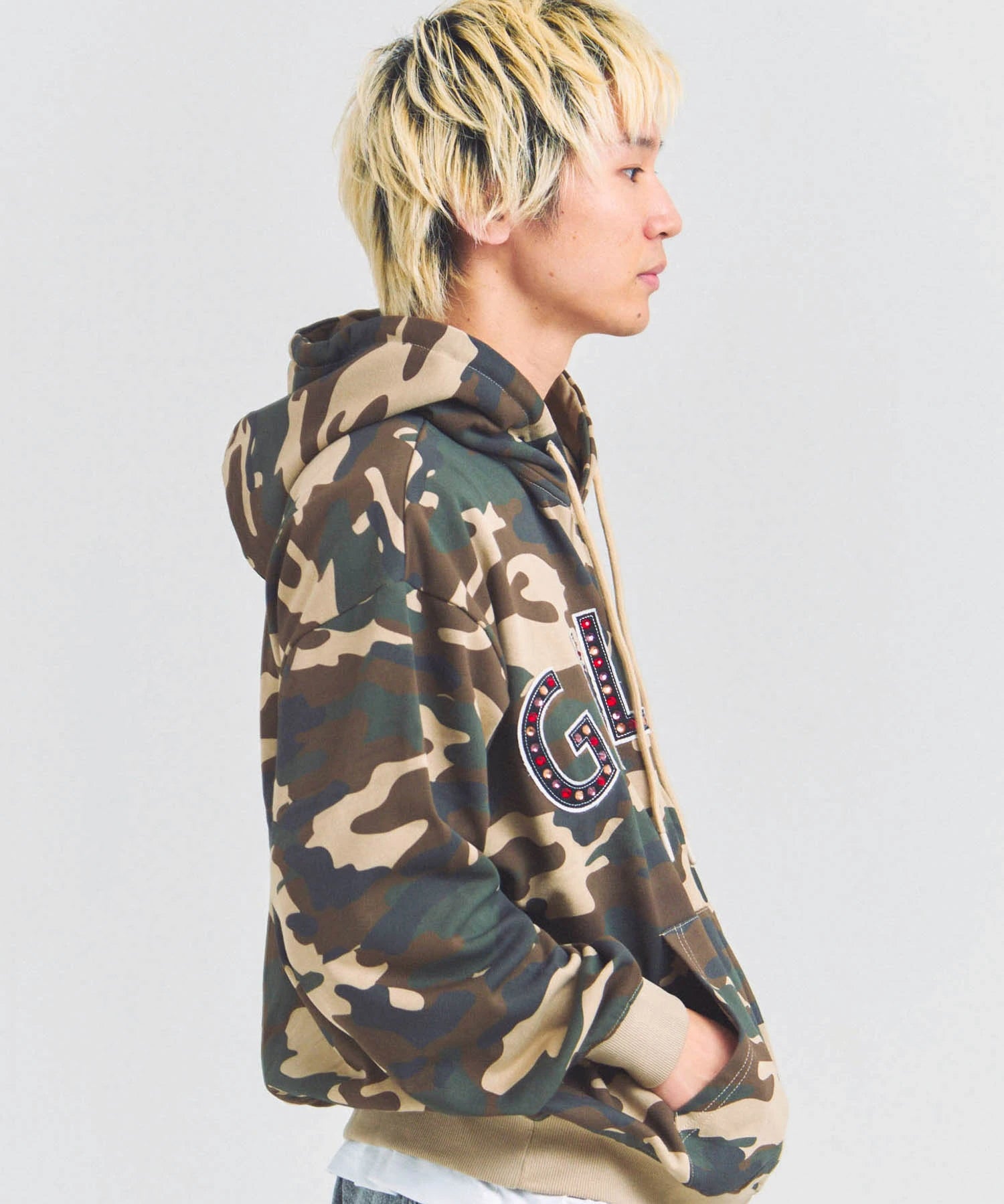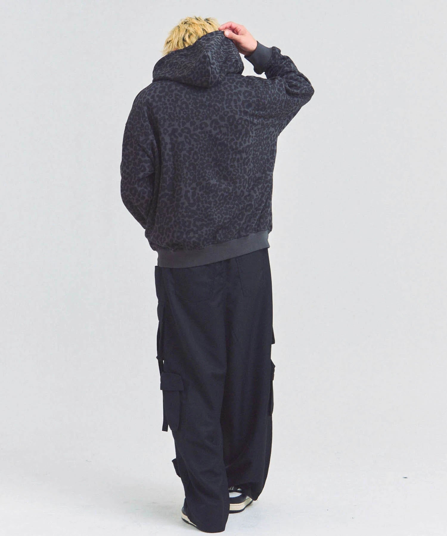 GALLIS ADDICTIONのストリートジップフーディ。カモフラージュ柄とレオパード柄の大胆な総柄デザインに "GALLIS" のロゴをストーンで表現。羽織るだけでストリートコーデの主役に。ゆったりとしたシルエットで、TシャツやロンTとのレイヤードも自由自在。メンズ・レディース問わずユニセックスで着用可能。休日のカジュアルスタイル、フェス、ライブ、街歩きなど幅広いシーンで活躍します。