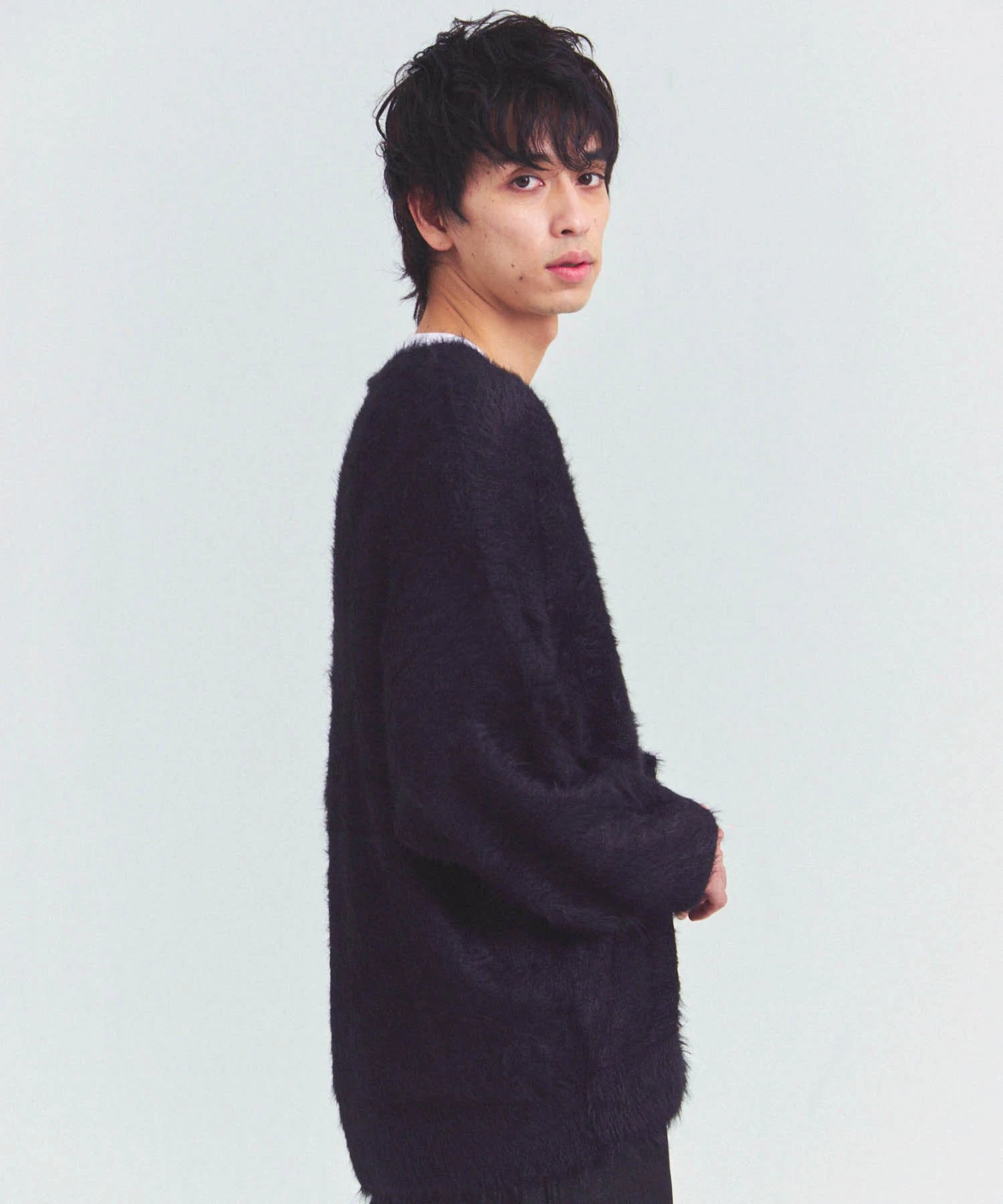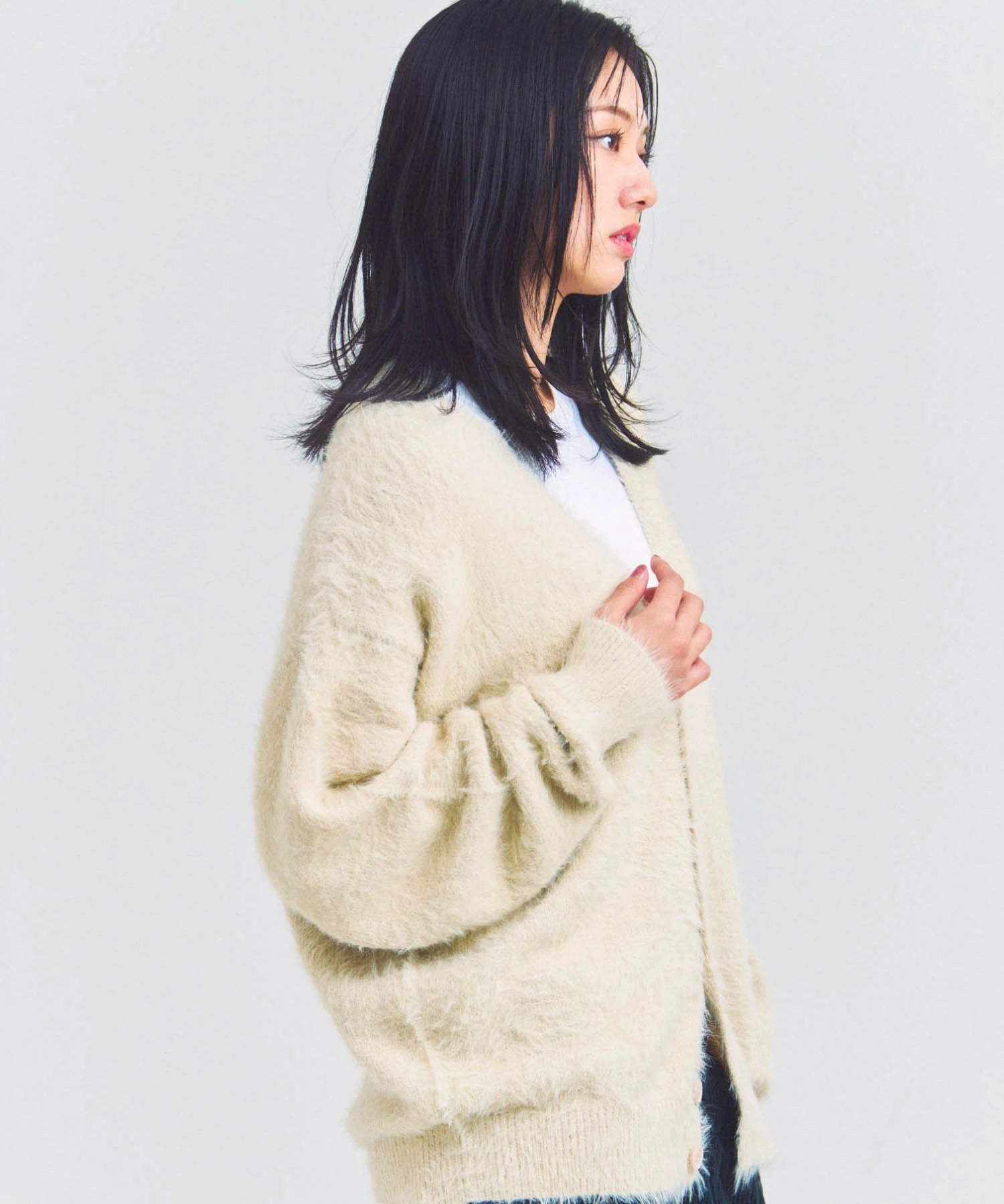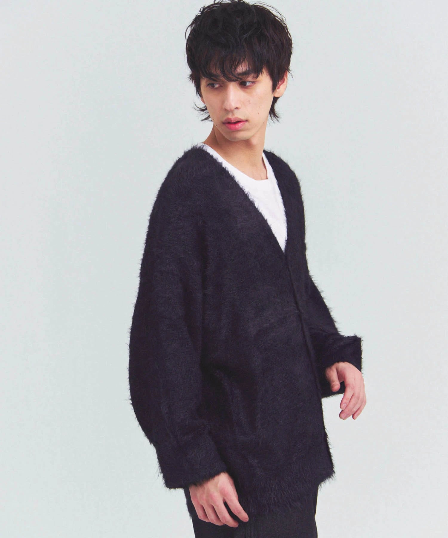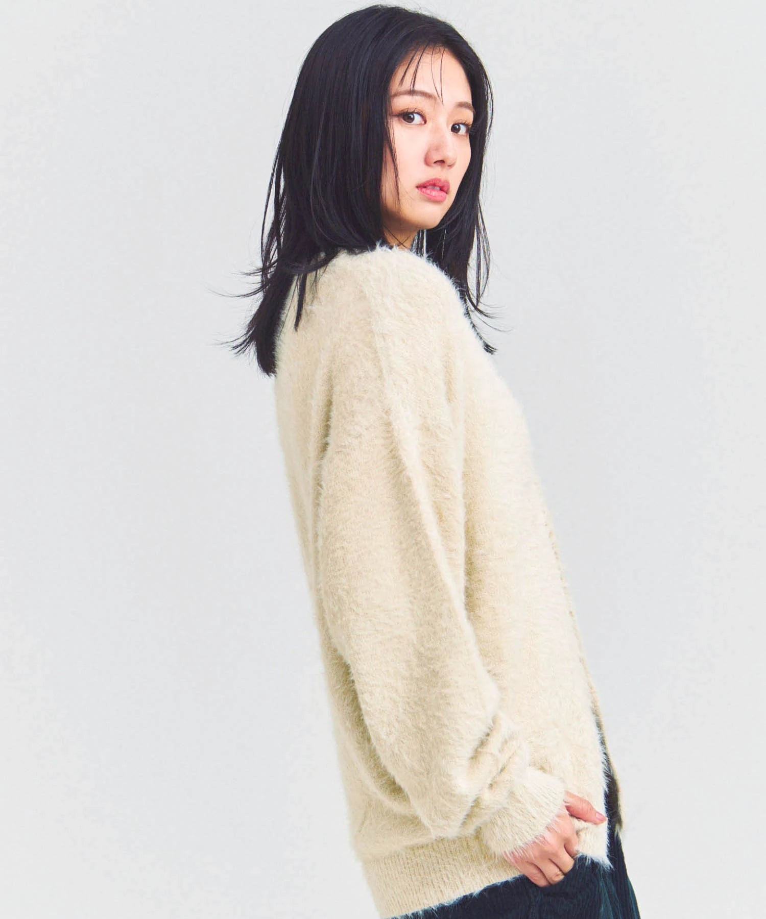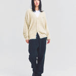 体を包み込むようなシルエットと軽やかな羽織り感を両立したカーディガン。素材はナイロン76%・ポリエステル24%で、ニットならではの柔らかさと耐久性を備えています。前を開けてラフに羽織るスタイルも、ボタンを閉じてセーター風に着るのもOK。季節の変わり目や室内の冷え対策にも活躍する一着です。