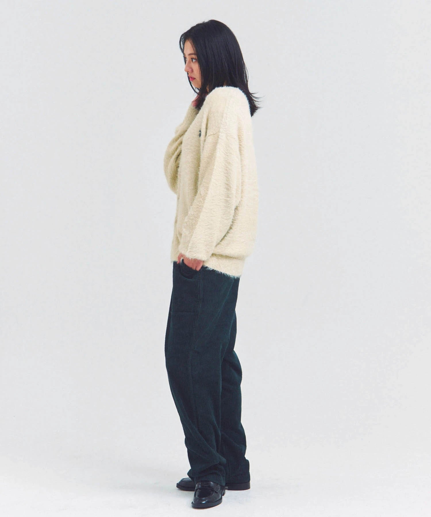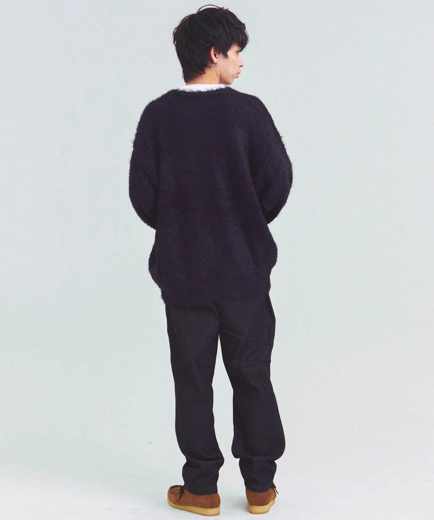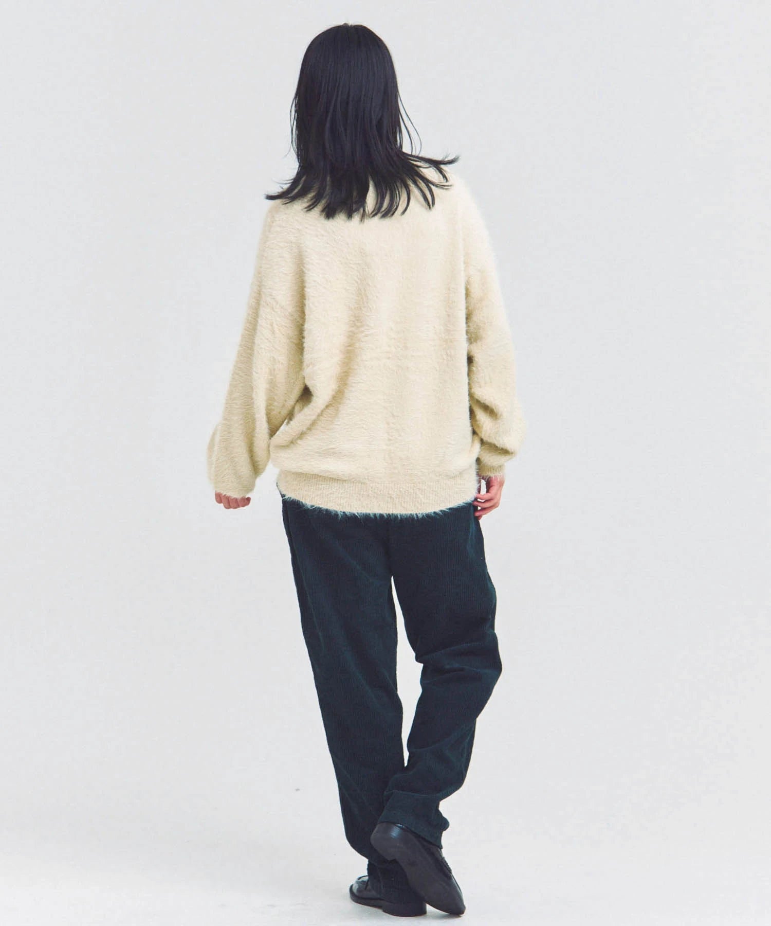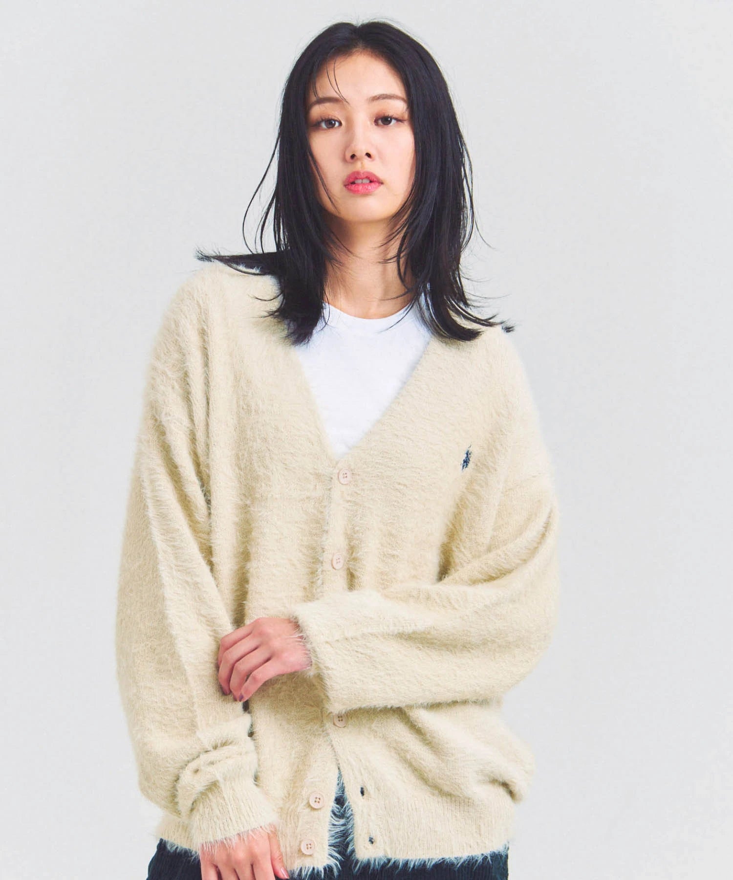 体を包み込むようなシルエットと軽やかな羽織り感を両立したカーディガン。素材はナイロン76%・ポリエステル24%で、ニットならではの柔らかさと耐久性を備えています。前を開けてラフに羽織るスタイルも、ボタンを閉じてセーター風に着るのもOK。季節の変わり目や室内の冷え対策にも活躍する一着です。