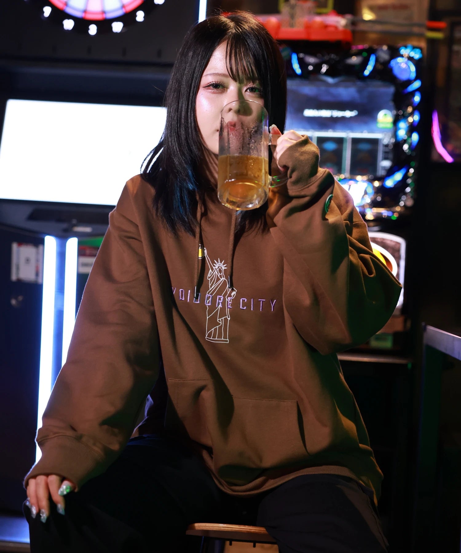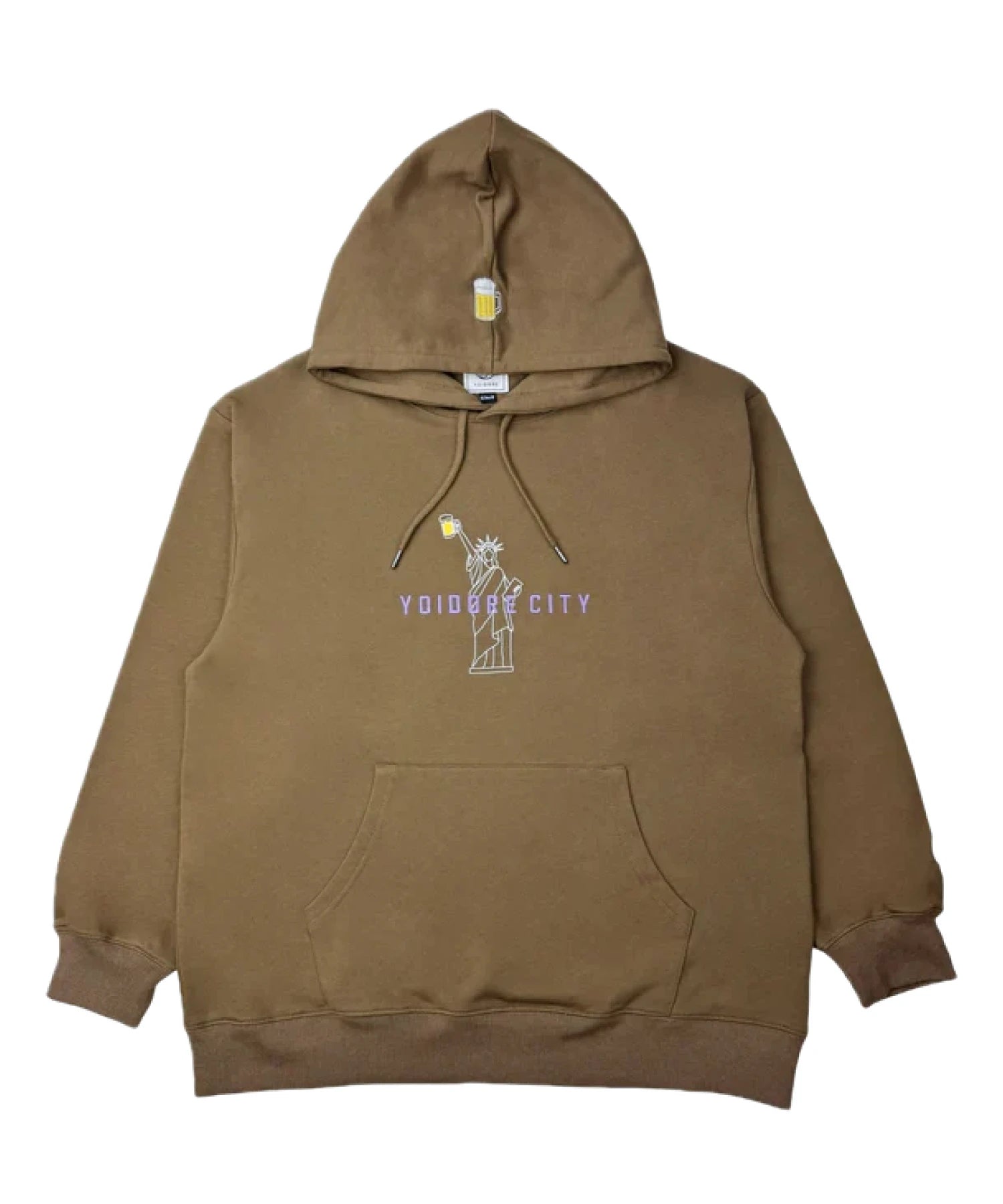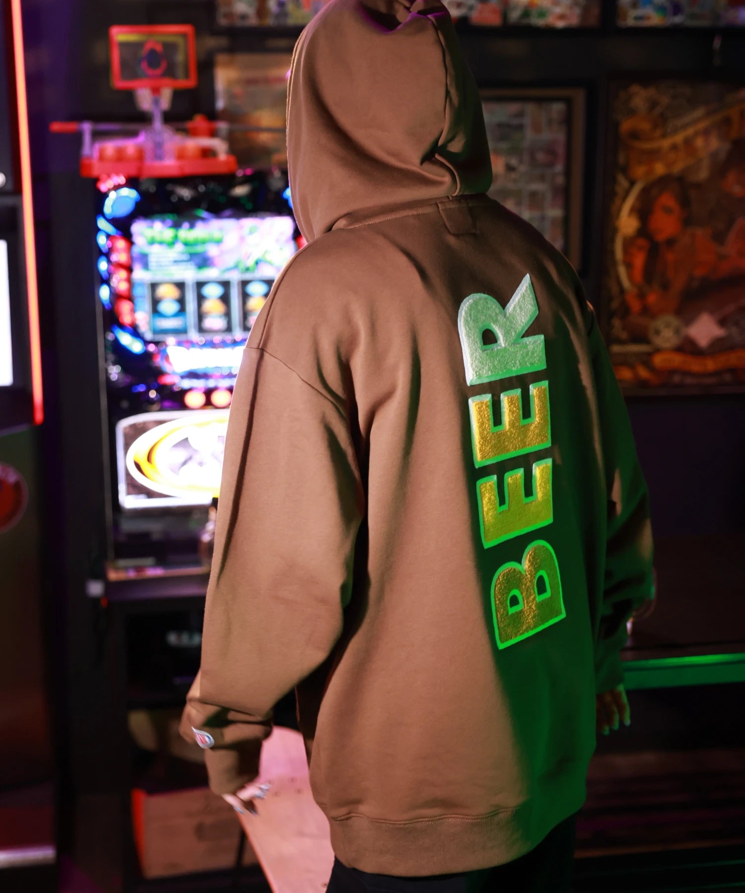 フロントはYOIDORE FREEの象徴、「ビールの女神」がビールジョッキを高々と掲げるLIBERTYなデザイン。バックはインパクト抜群なBEERロゴを豪華なサガラワッペンで配置!ロゴのグラデーションでビールカラーを表現したさりげないこだわりがにくい!フードをかぶるとビールジョッキの刺繍がワンポイントで輝く!ビールがすすむこと間違い無しなアイテムです。