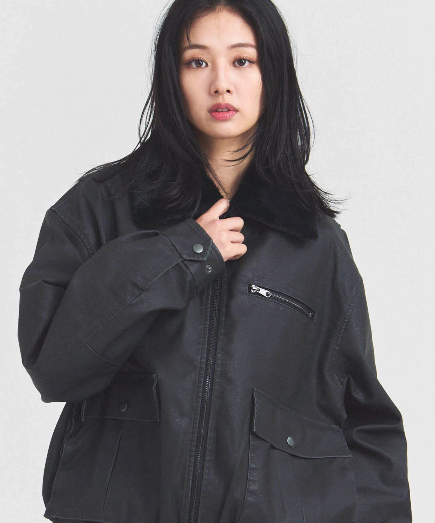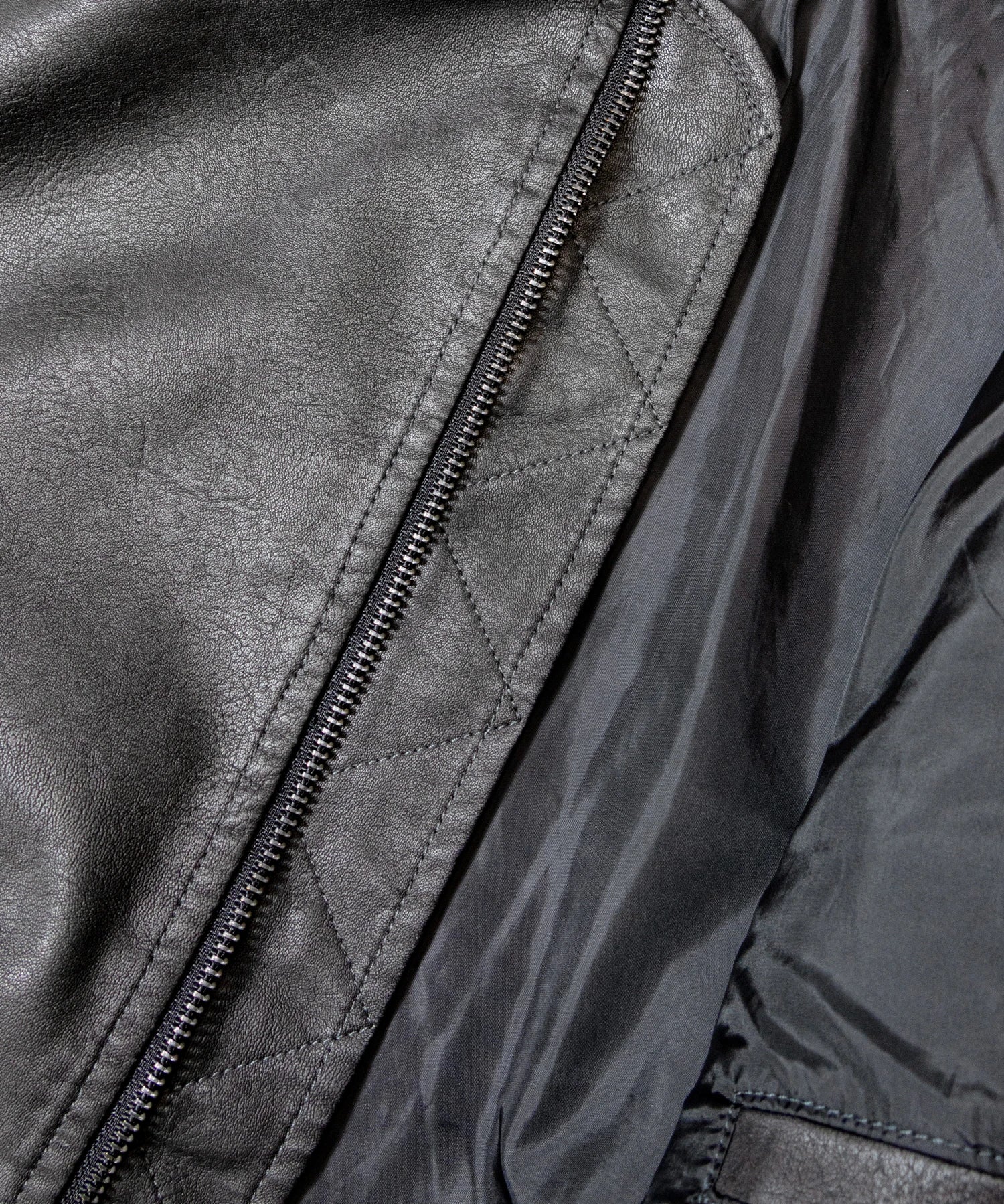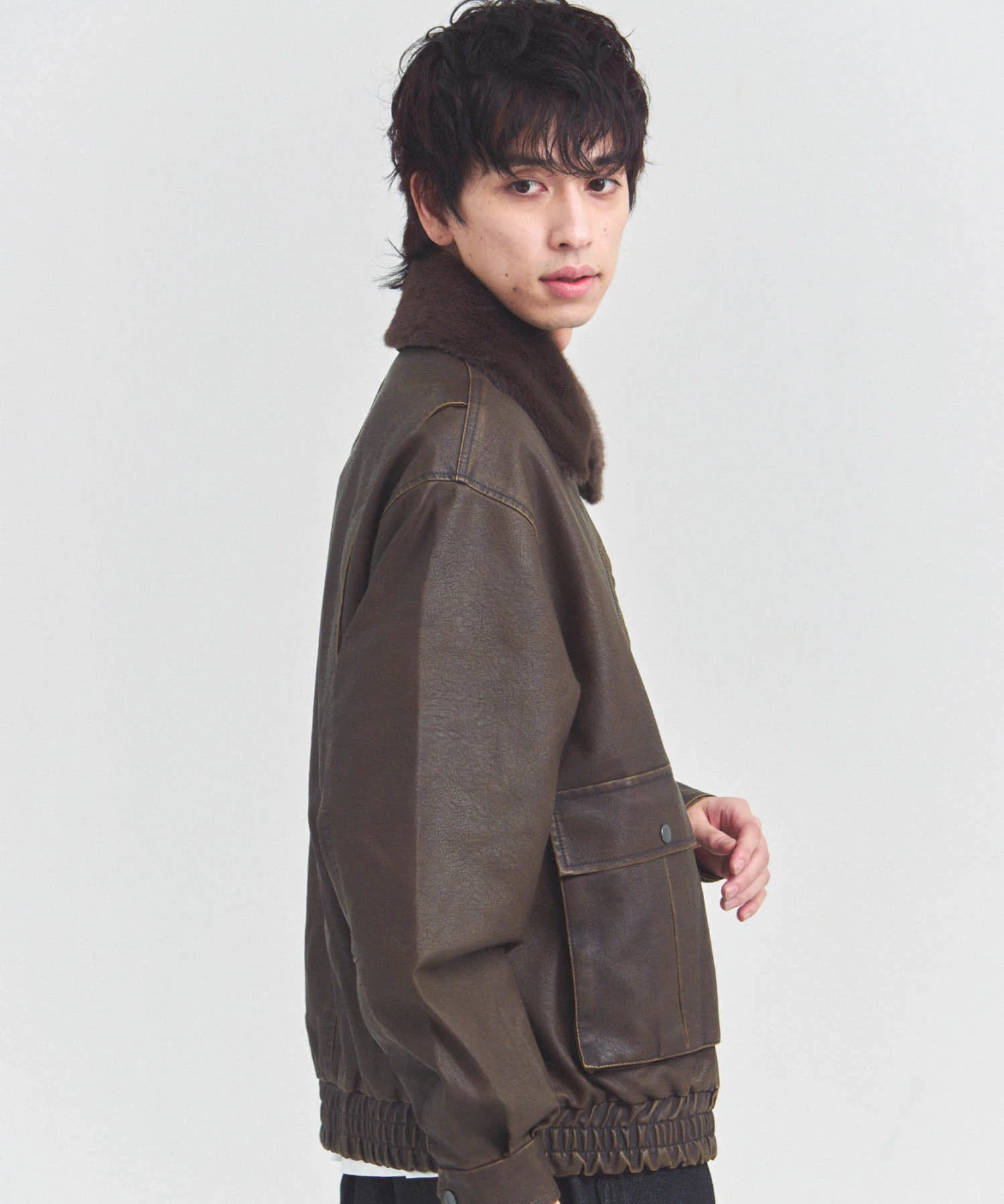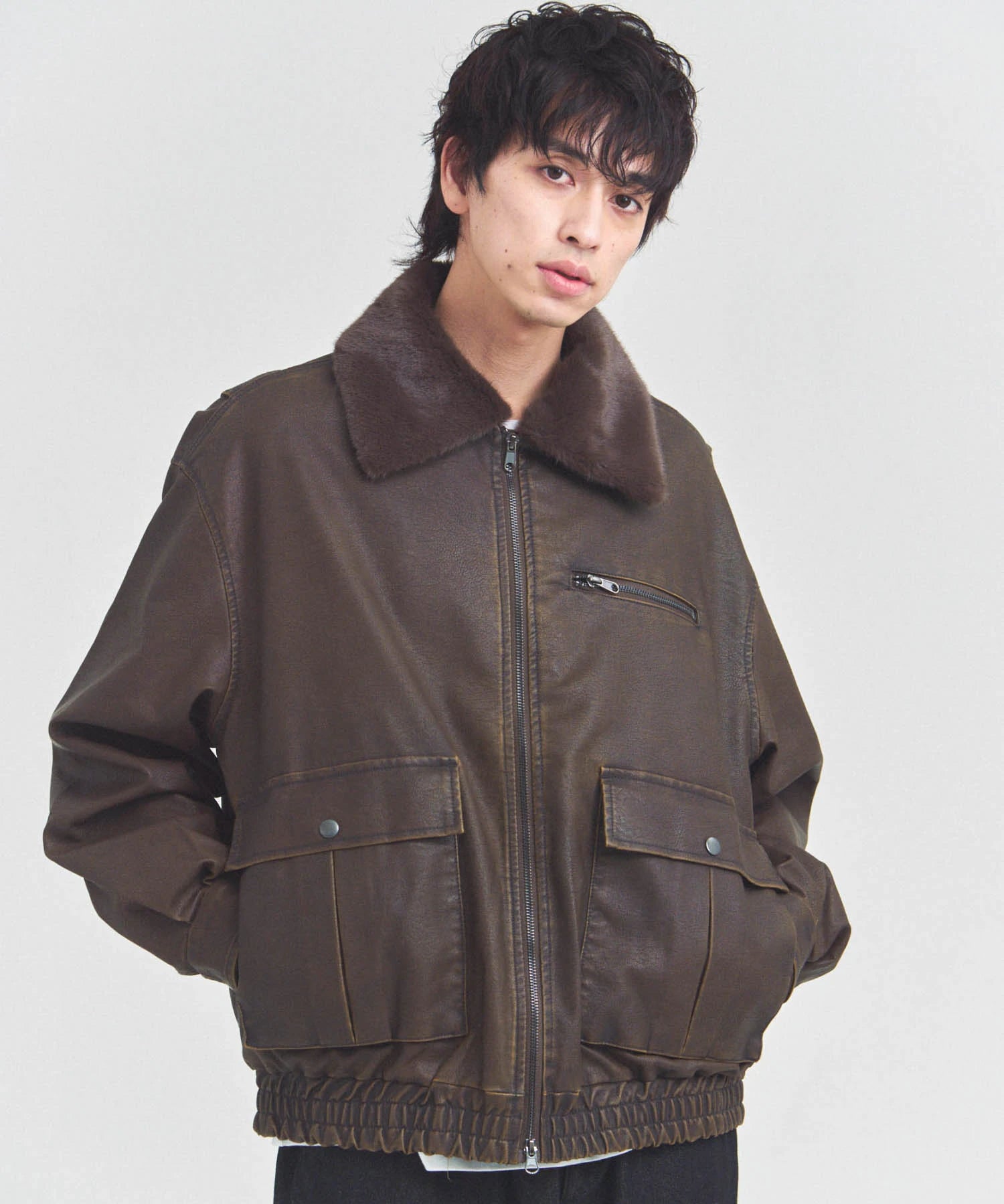 この一着で、冬のタウンスタイルにワイルドで洗練されたアクセントを。ヴィンテージ感漂うPUレザーを使用し、襟にあしらわれたファーは取外し可能なので、気分やコーディネートによって表情を変えることができます。