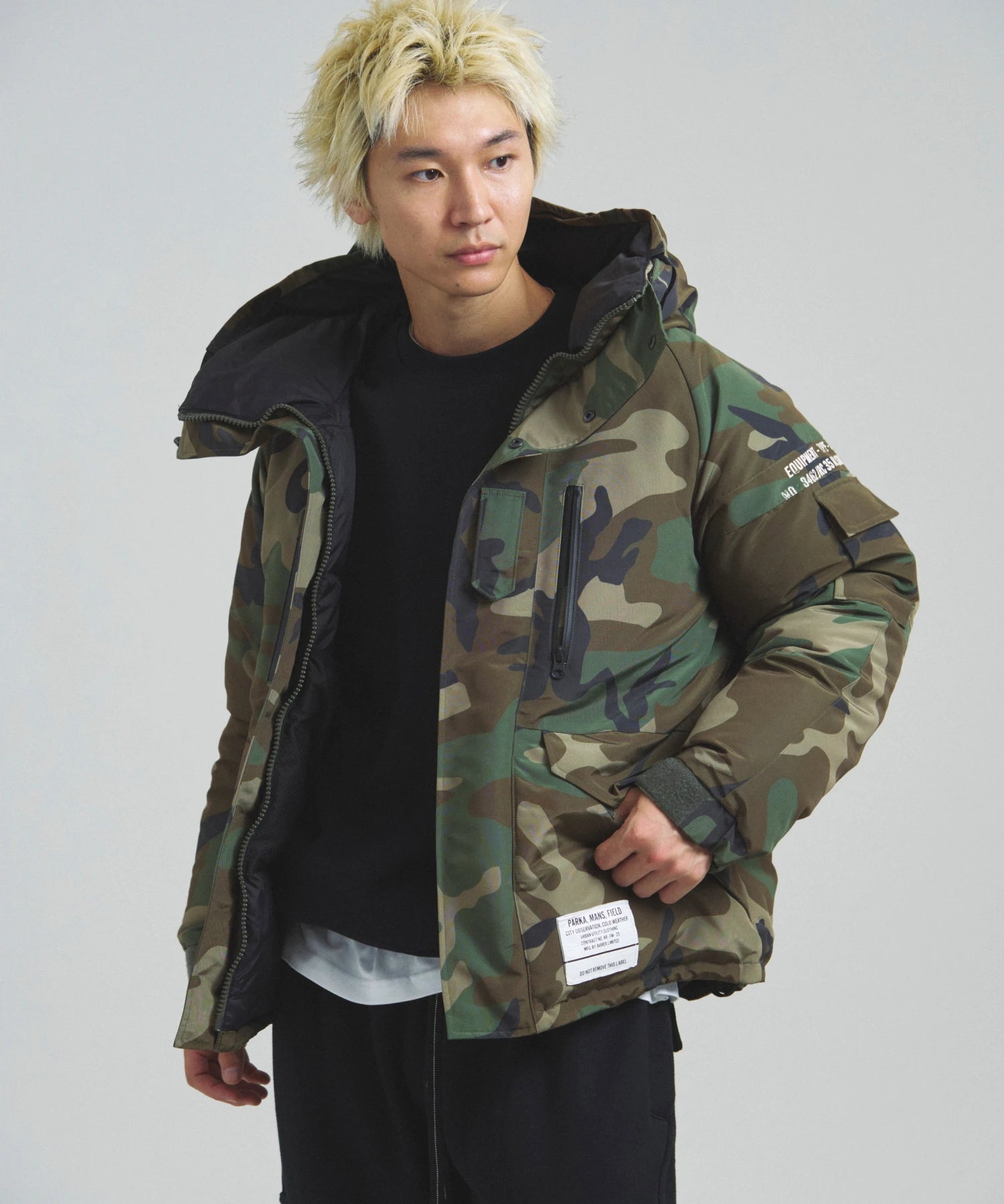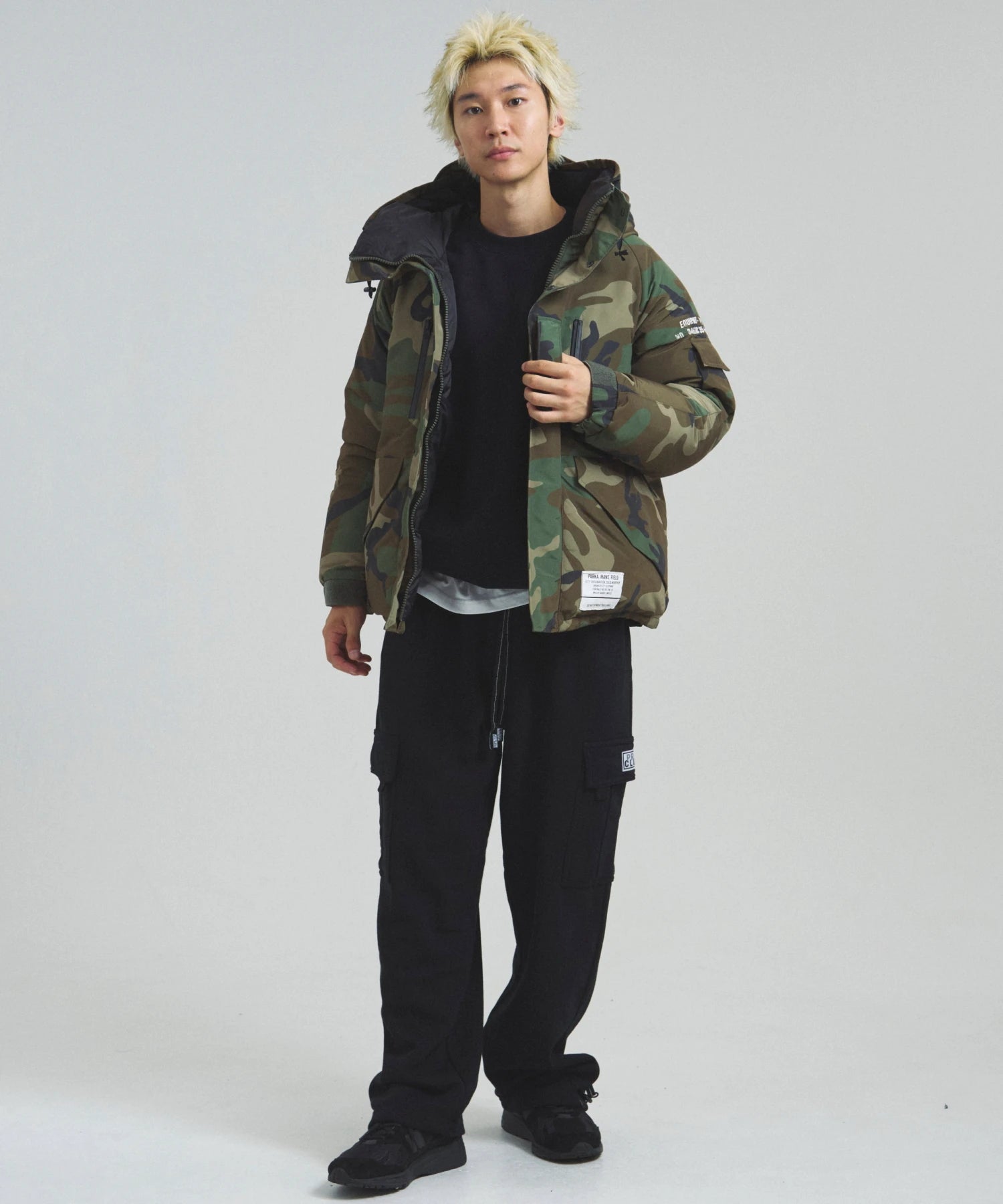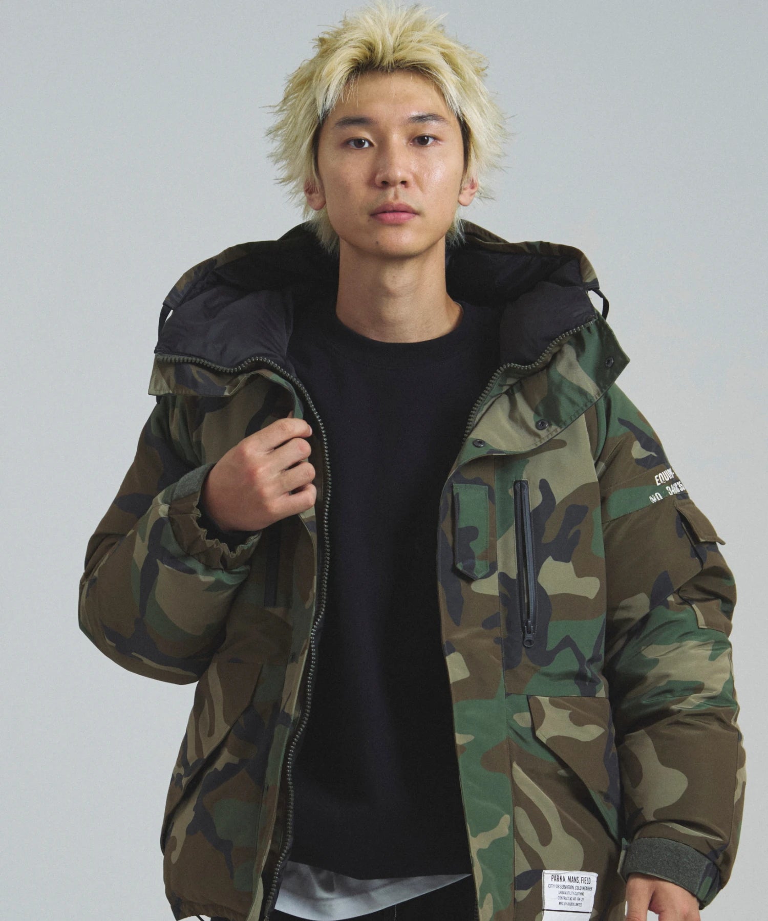 カモフラ1表生地:ポリエステル100%裏生地:ナイロン100%別布部分:ポリエステル100%詰物:ダウン80%、フェザー20%中わた:ポリエステル100%