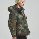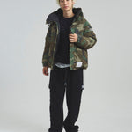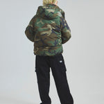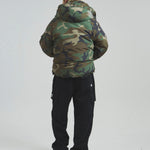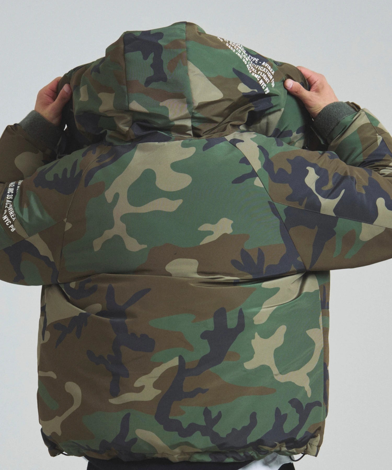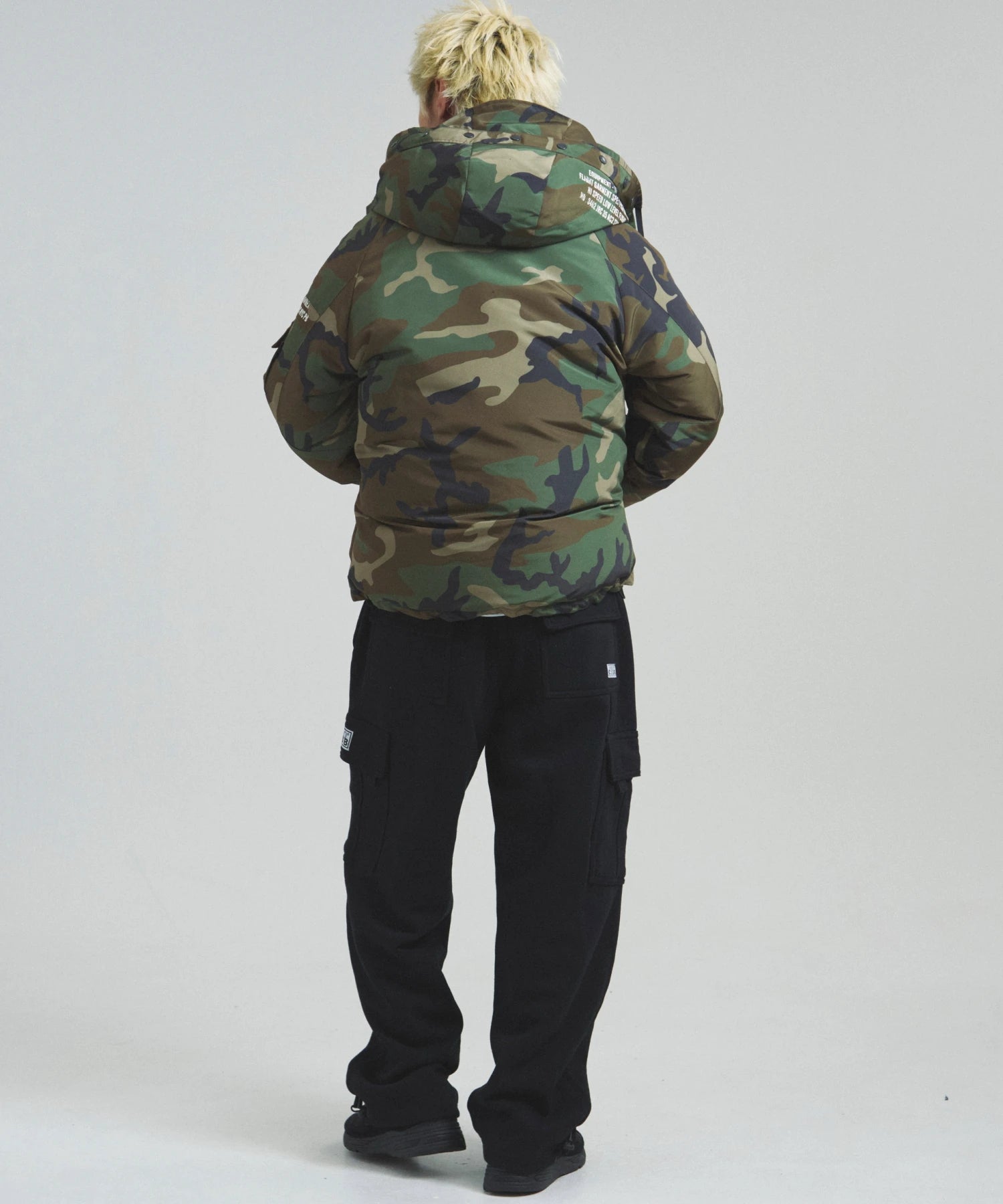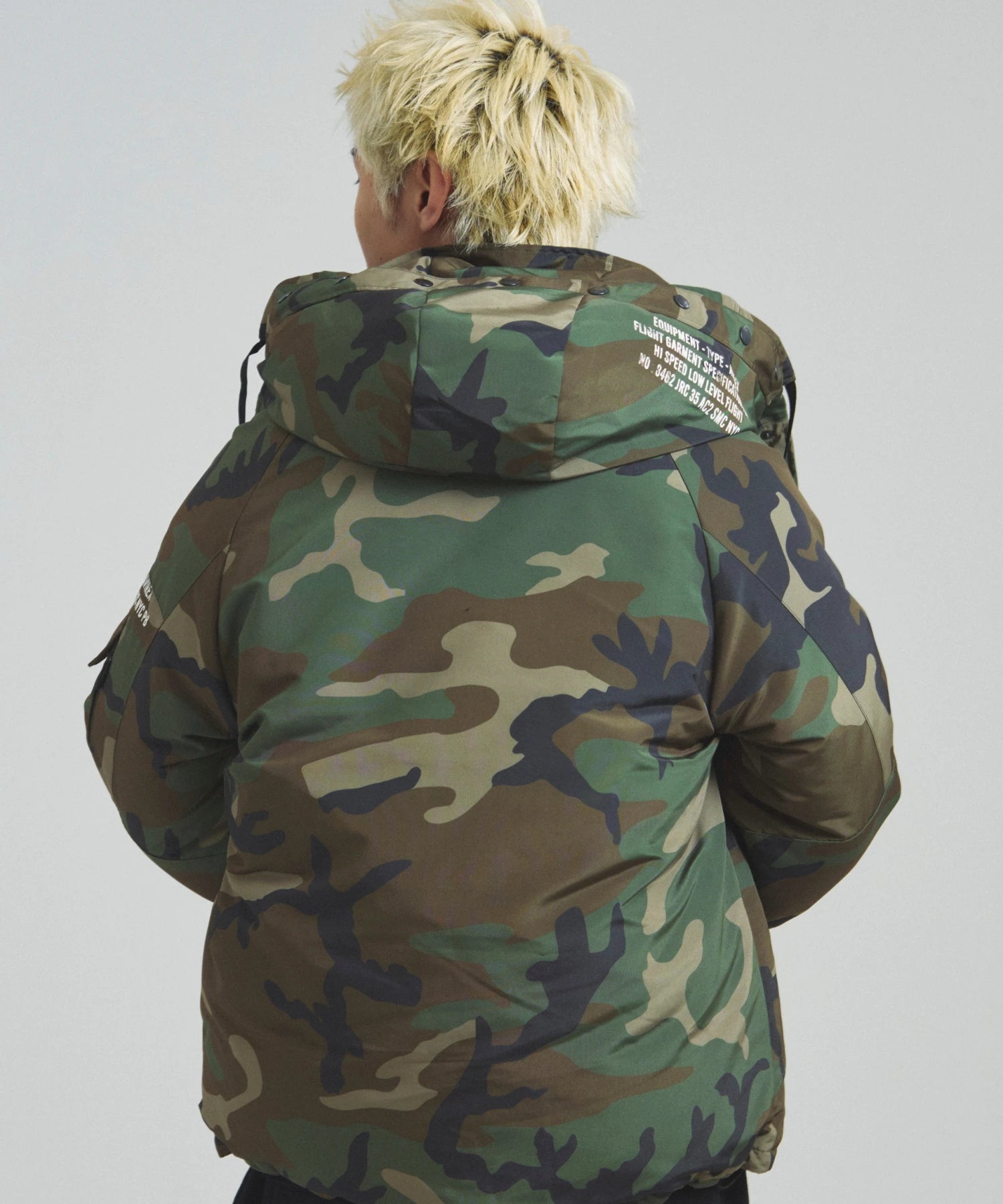 カモフラ1表生地:ポリエステル100%裏生地:ナイロン100%別布部分:ポリエステル100%詰物:ダウン80%、フェザー20%中わた:ポリエステル100%