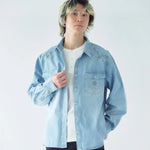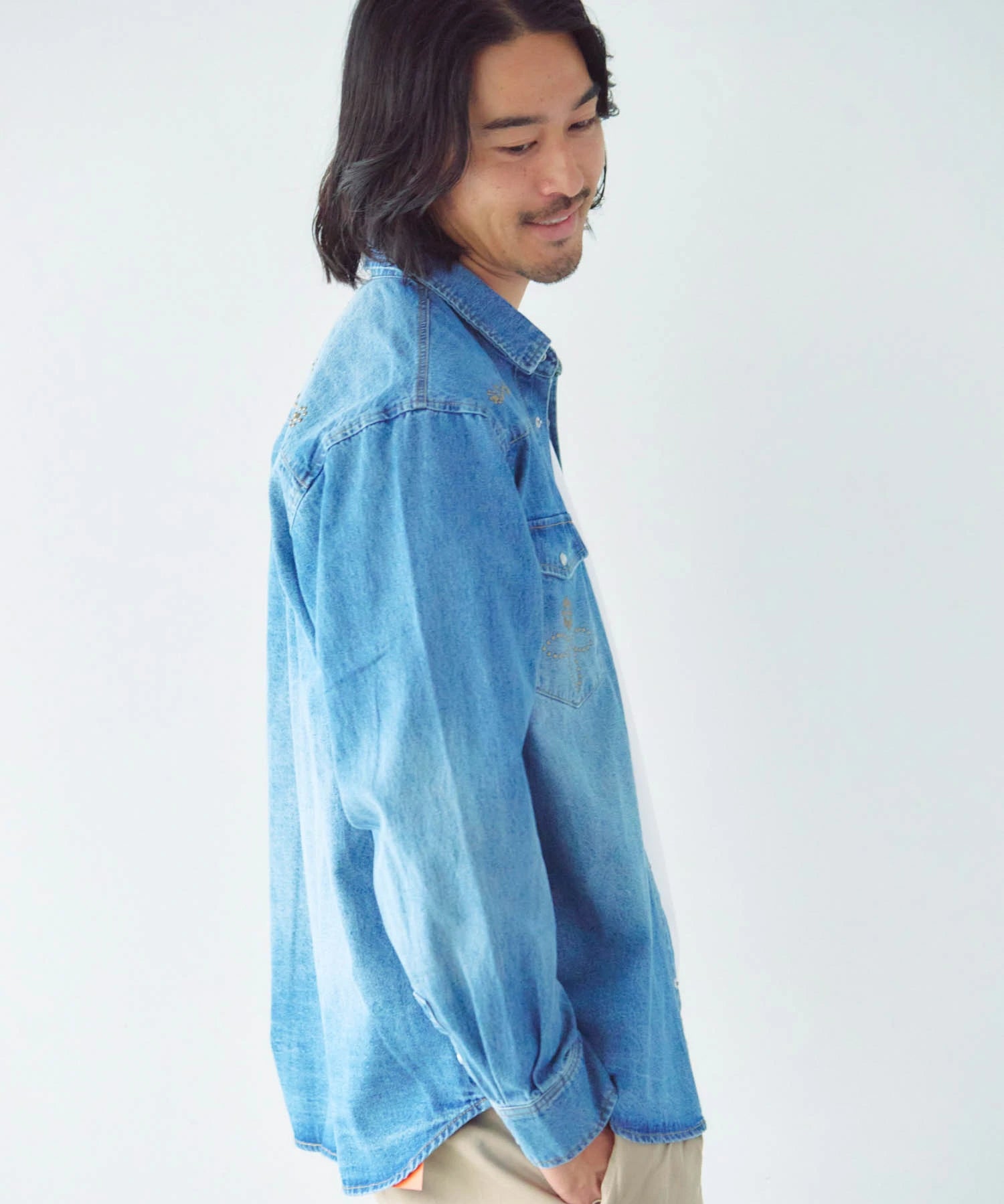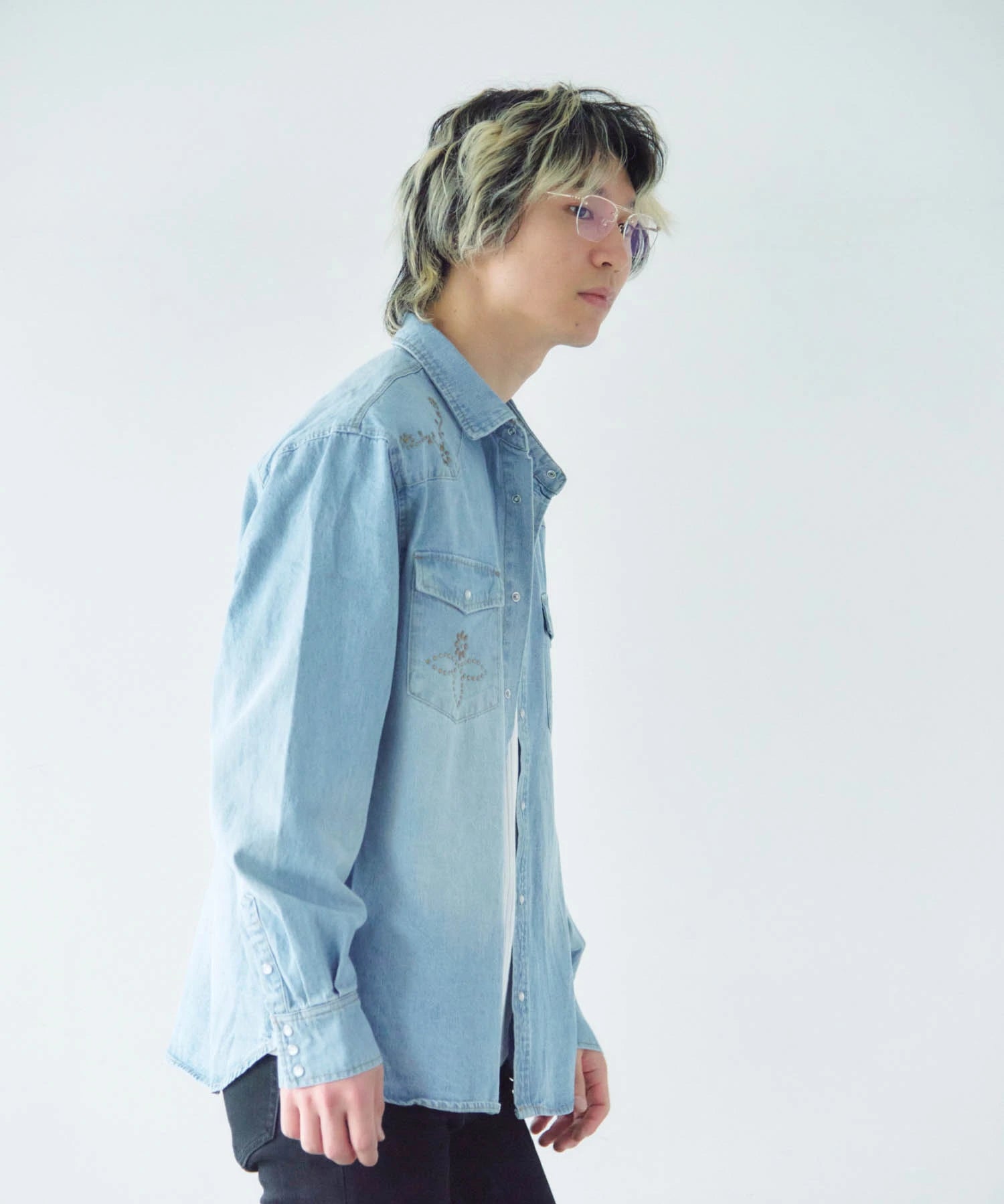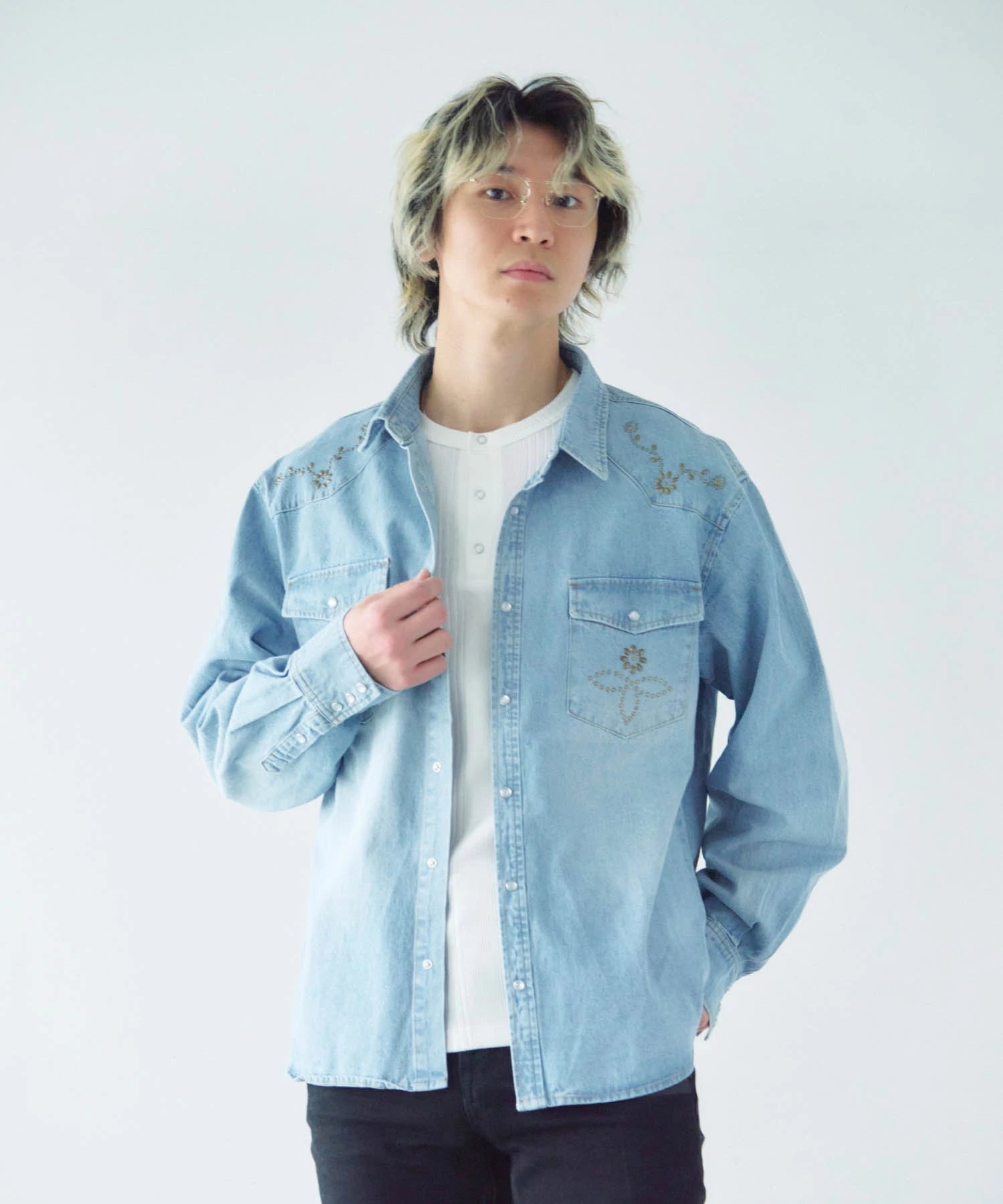スタッズが目を惹くデニムロングスリーブシャツ。