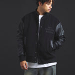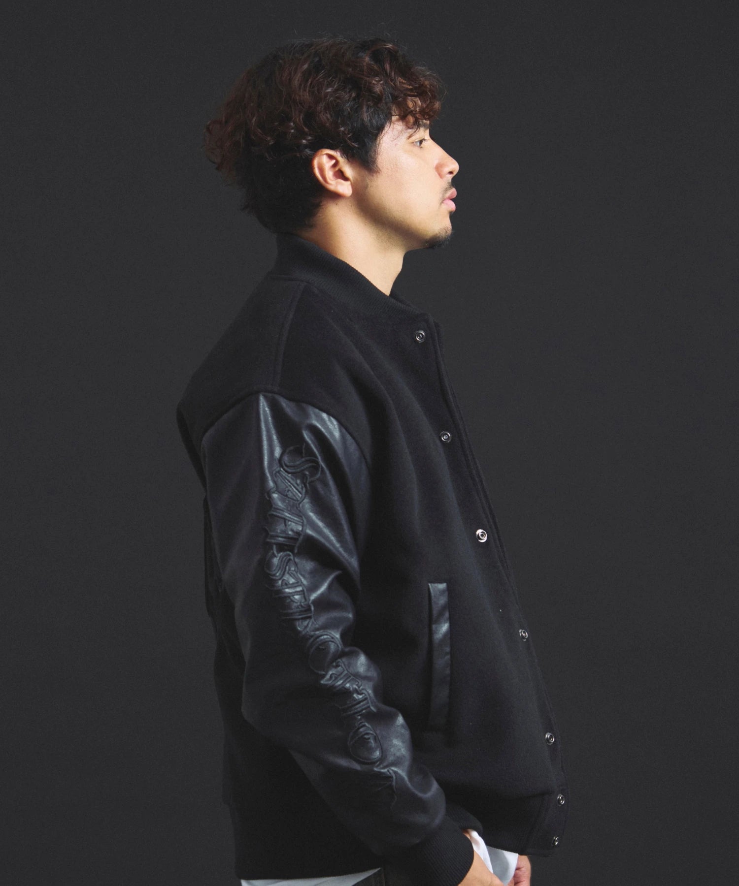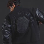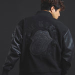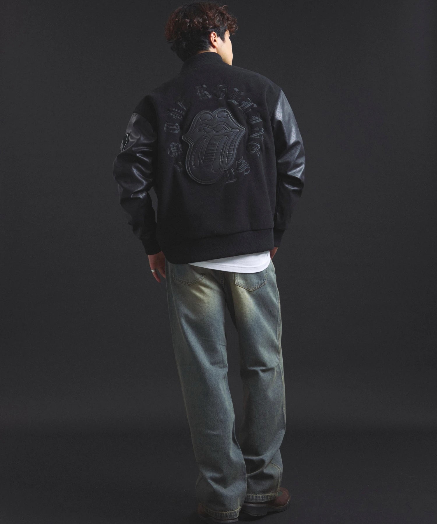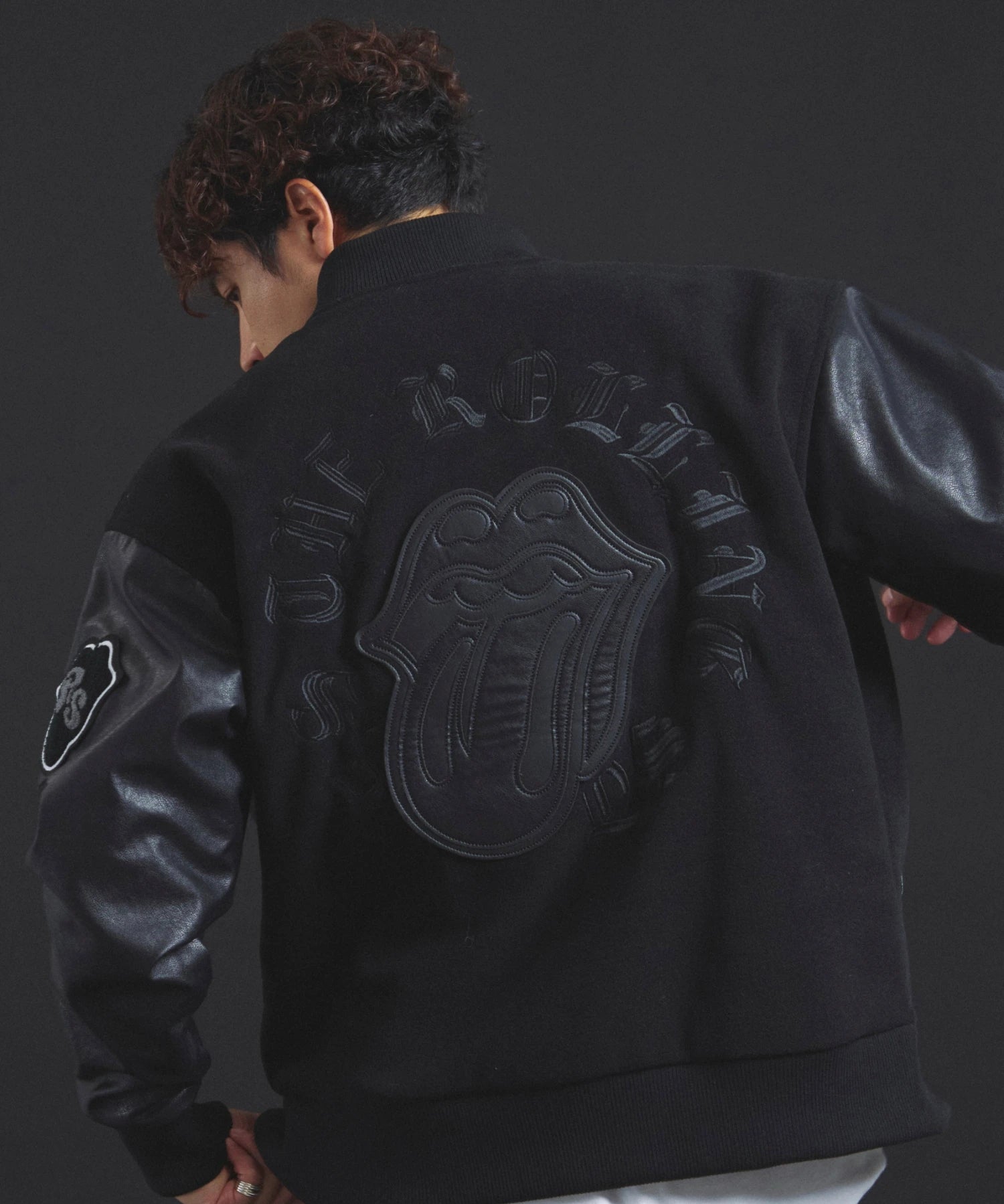 ロックを象徴するバンド The Rolling Stones と JACKROSE のコラボレーションによる、シグネチャーデザインのスタジャン。フロントには「THE ROLLING STONES」のロゴ刺繍を配置し、バックにはアイコニックな「Lips & Tongue」ロゴをレザーアップリケで大胆に表現。両袖にはロゴ刺繍をあしらい、細部までこだわり抜いた存在感のある仕上がりになっています。ボディにはポリエステル90%・レーヨン10%の混紡素材を採用し、軽さと耐久性を兼ね備えつつ上品な質感を演出。スリーブにはフェイクレザーを組み合わせ、異素材のコントラストがスタイリングに深みを与えます。ブラックワントーンでまとめたクールな配色は、幅広いコーディネートにマッチ。ロックなムードとラグジュアリーな雰囲気を併せ持つ、特別なコラボアイテムです。