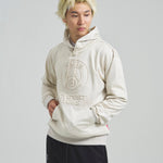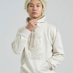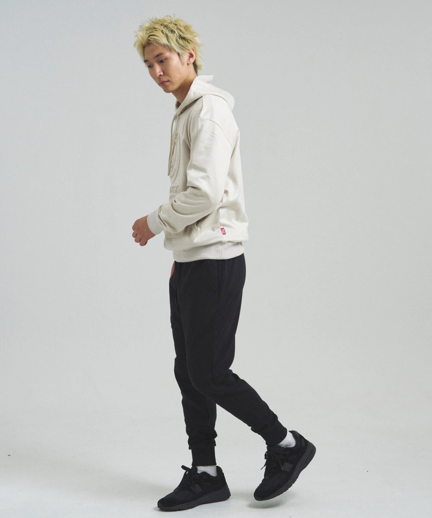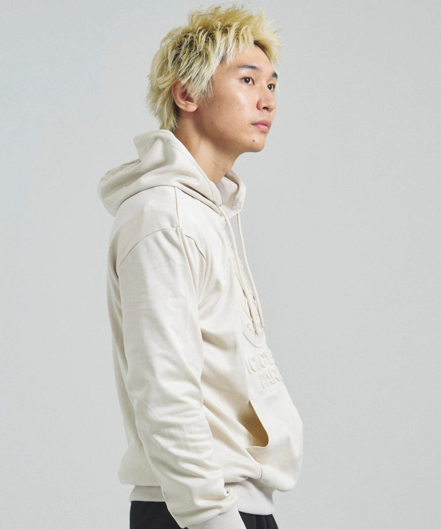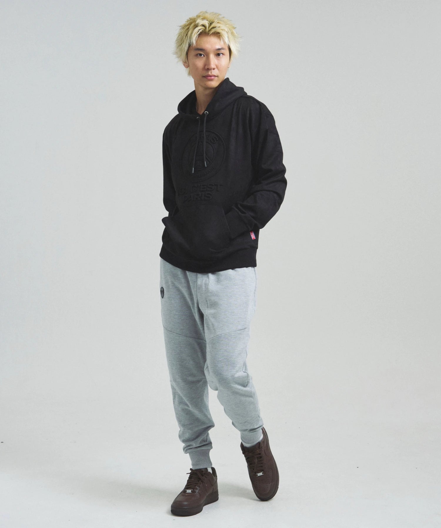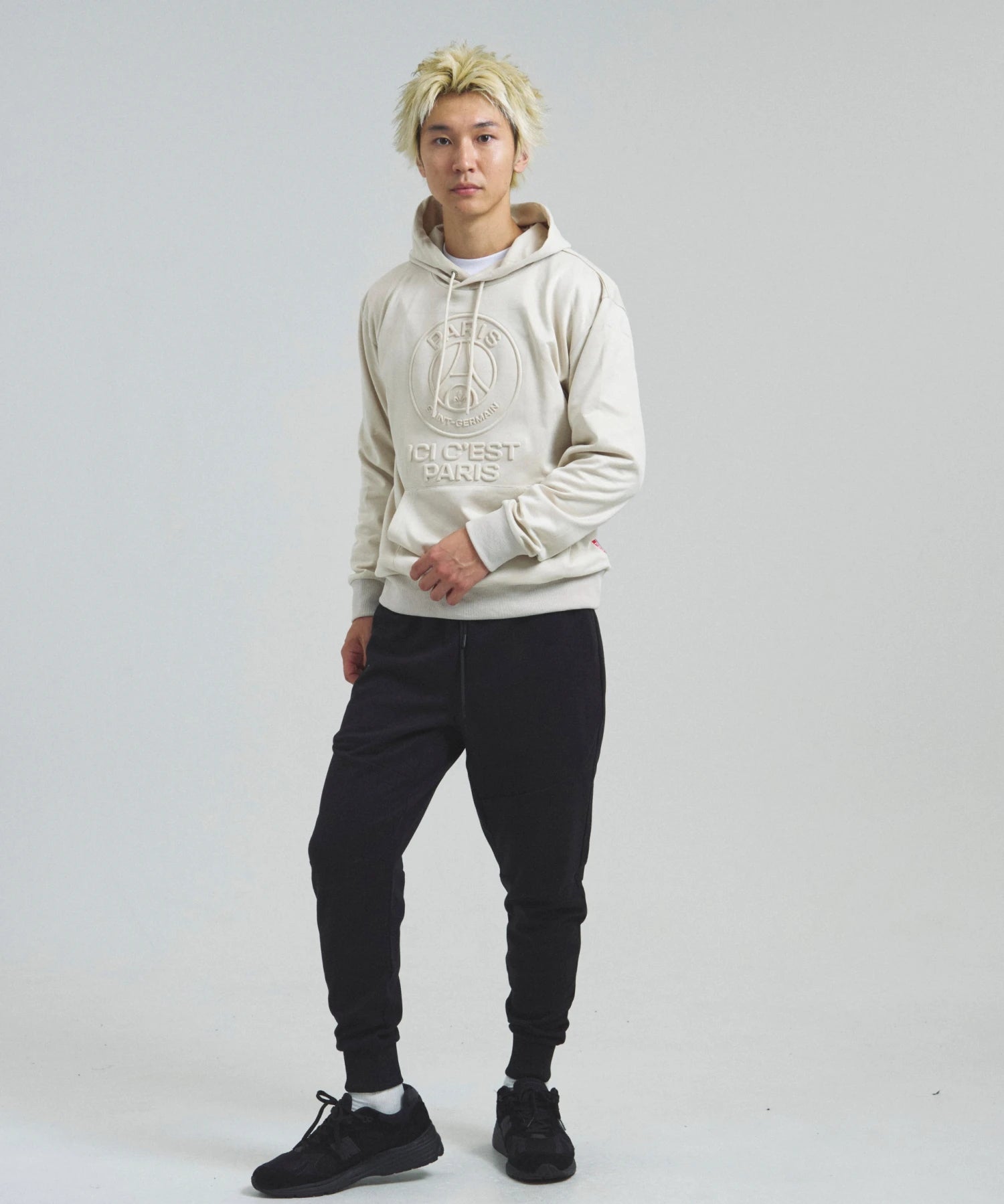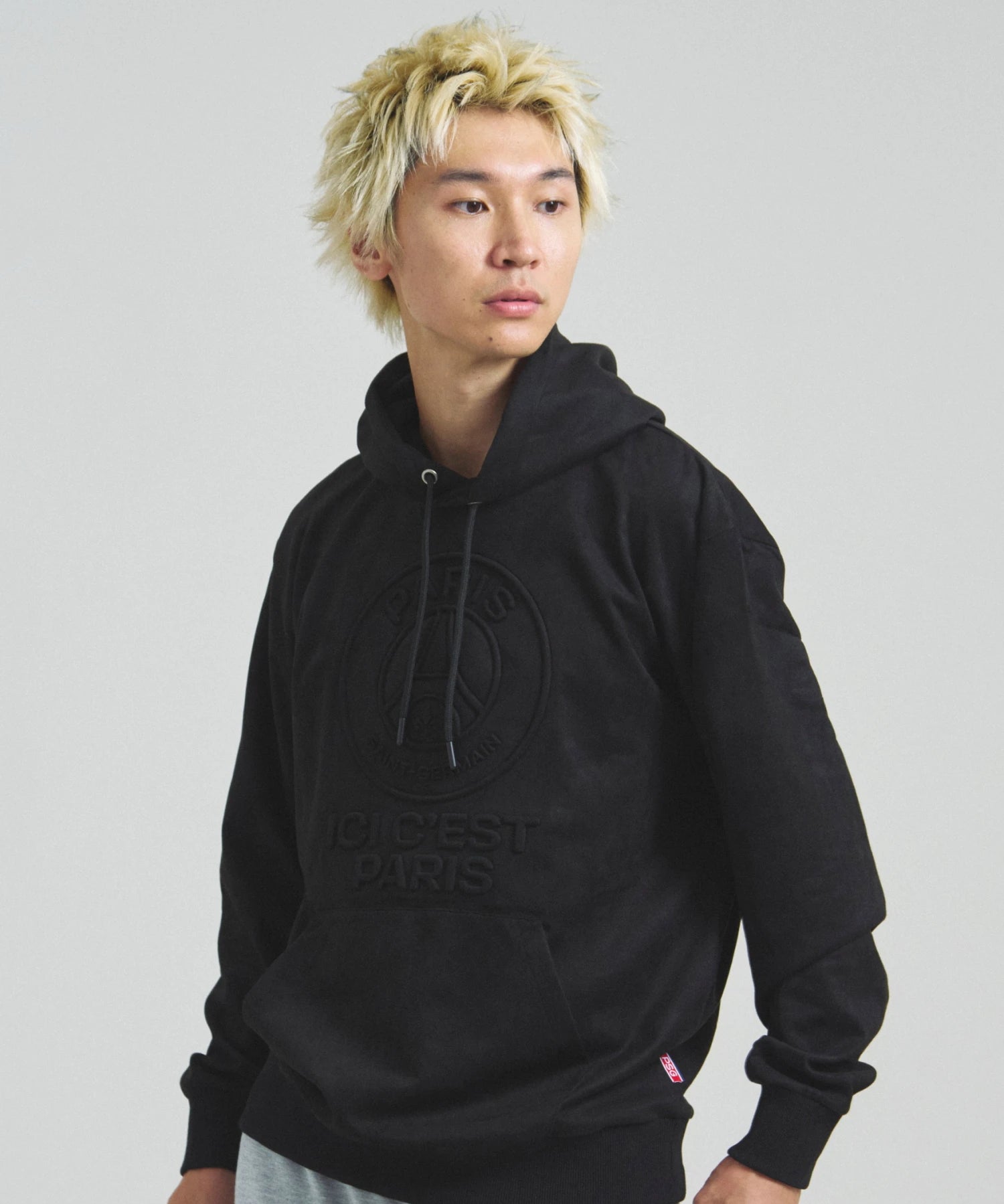 上品なフェイクスウェード素材に、Paris Saint-Germain F.C.公式ライセンスを証明するエンボスロゴを施したプルオーバーフーディー。シンプルなワントーンデザインながら立体感のあるロゴが存在感を放ち、大人のカジュアルスタイルにマッチ。柔らかな風合いで着心地も良く、タウンユースから観戦コーデまで幅広く対応できる万能アイテムです。