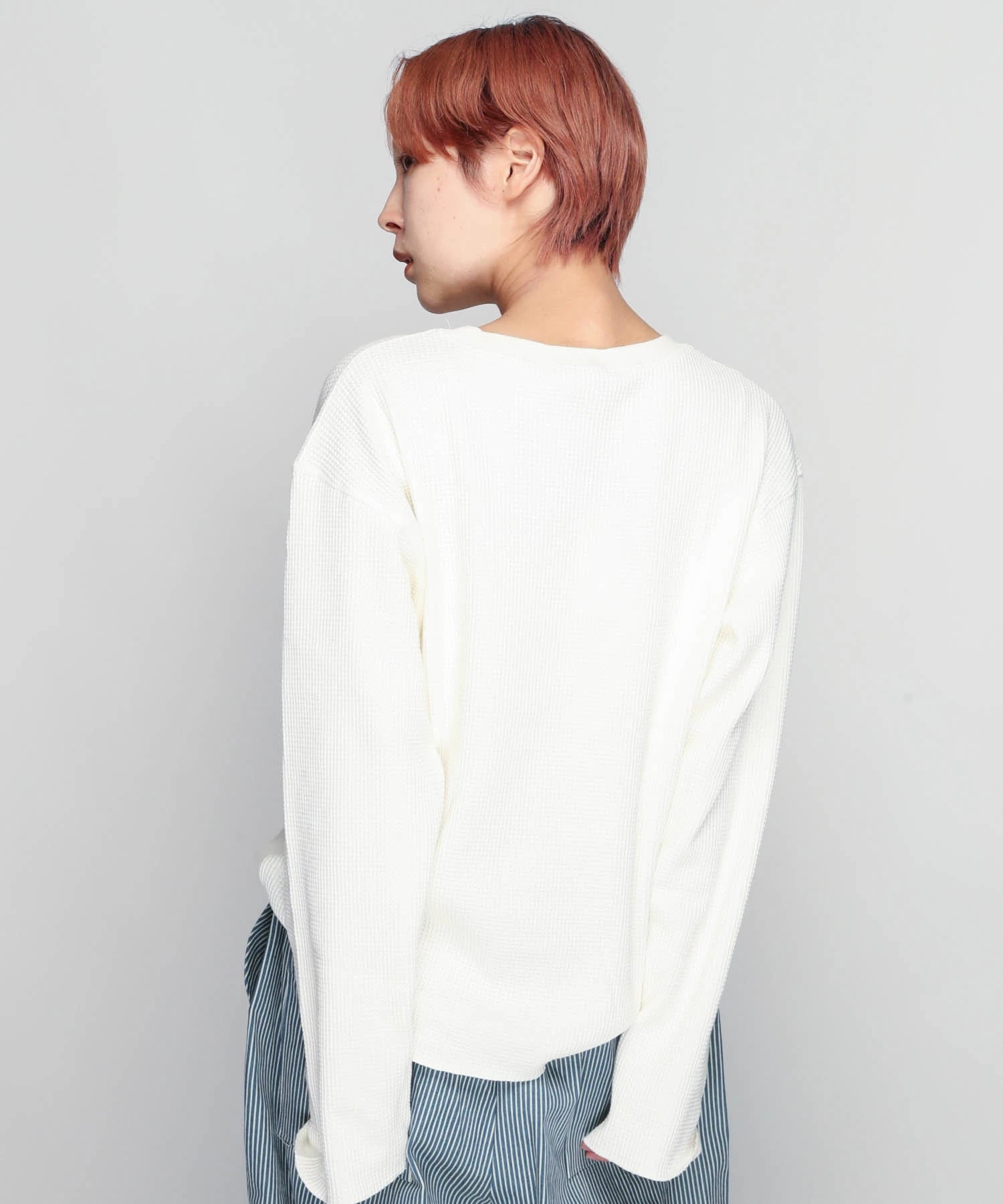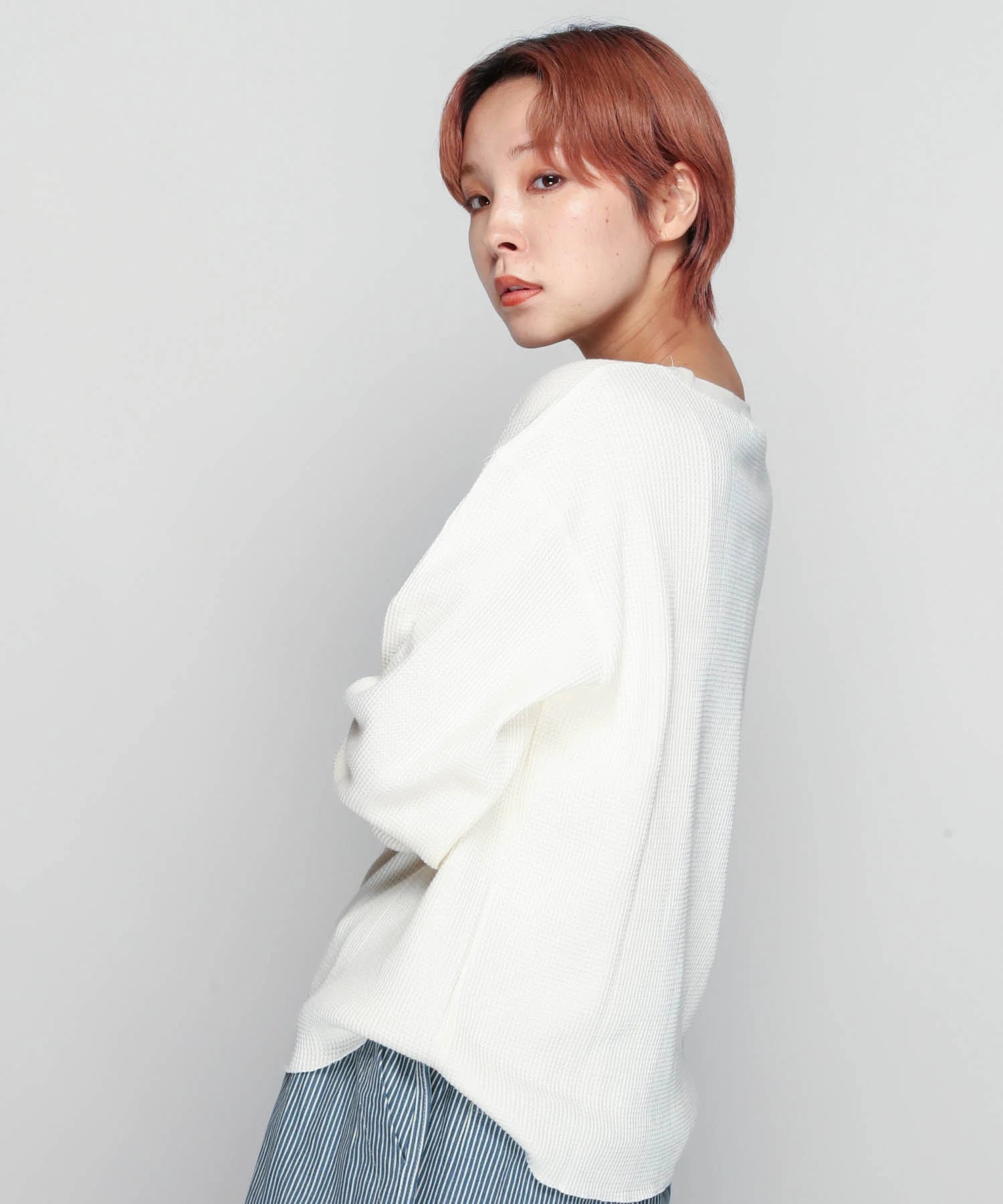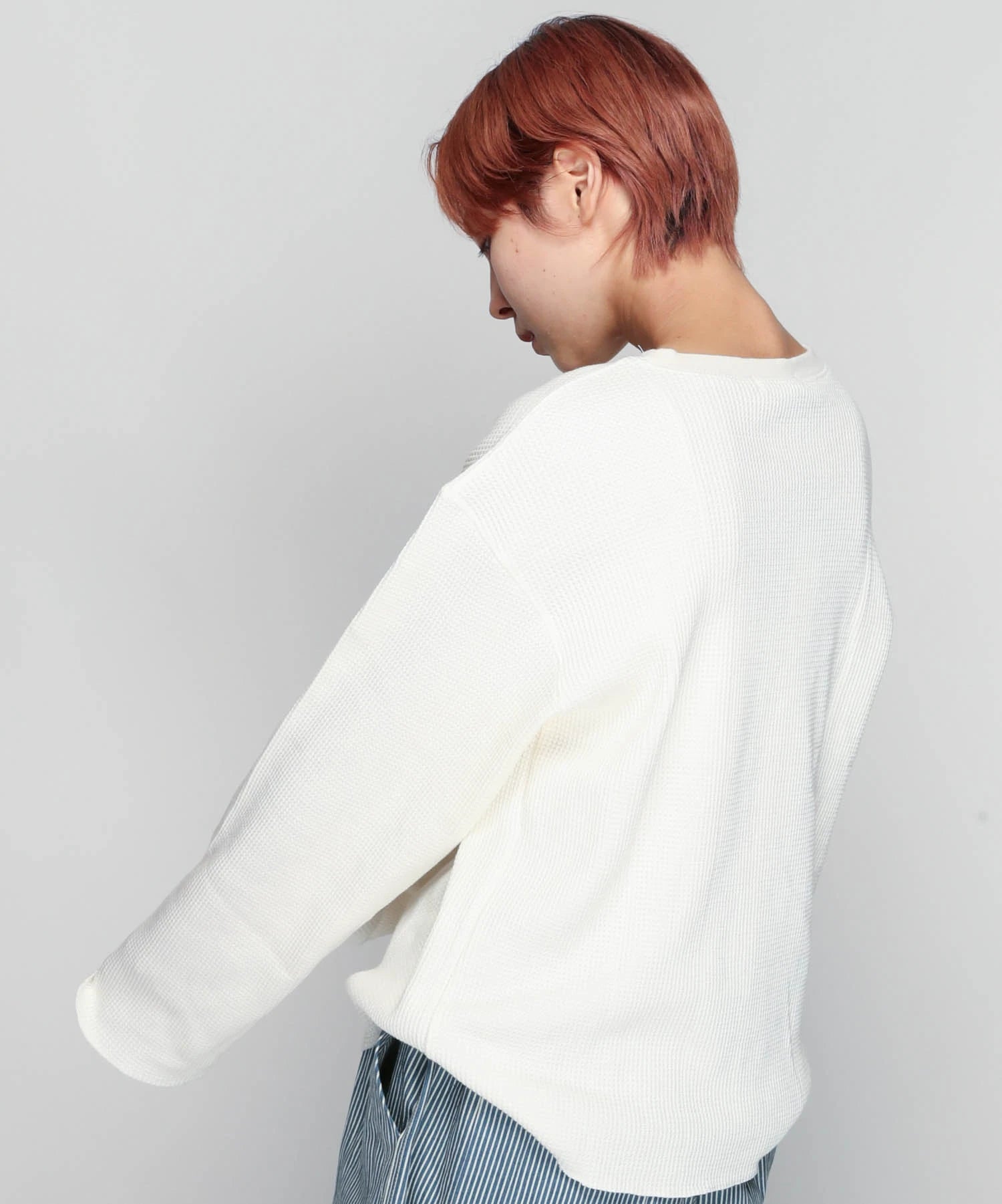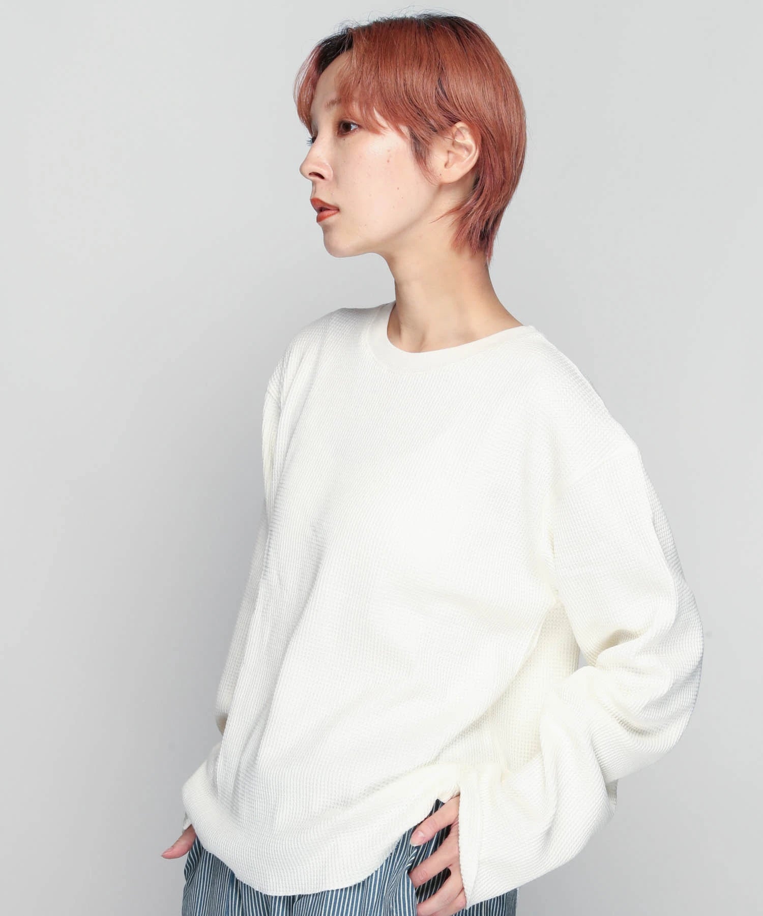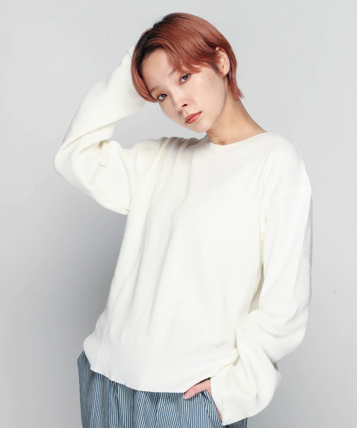 立体感のあるワッフル素材で仕立てた、ショート丈ロングスリーブTシャツが登場。凹凸のあるワッフル編みが、シンプルながらも存在感のある表情を演出。ショート丈のボックスシルエットが、トレンド感と抜け感を両立し、レイヤードスタイルにも最適です。袖はやや長めに設計されており、ゆるさとモード感を兼ね備えたバランスに。裾のドロップ感が、パンツとの相性を高め、スタイリングに奥行きを与えます。カラーはホワイト・チャコール・ブラックの3色展開。どれもベーシックながら、素材の表情で差がつく仕上がり。デニムやカーゴ、スラックスなど、幅広いボトムスと好相性です。一枚でもインナー使いでも活躍する万能トップスとして、シーズンレスに重宝するアイテムです。