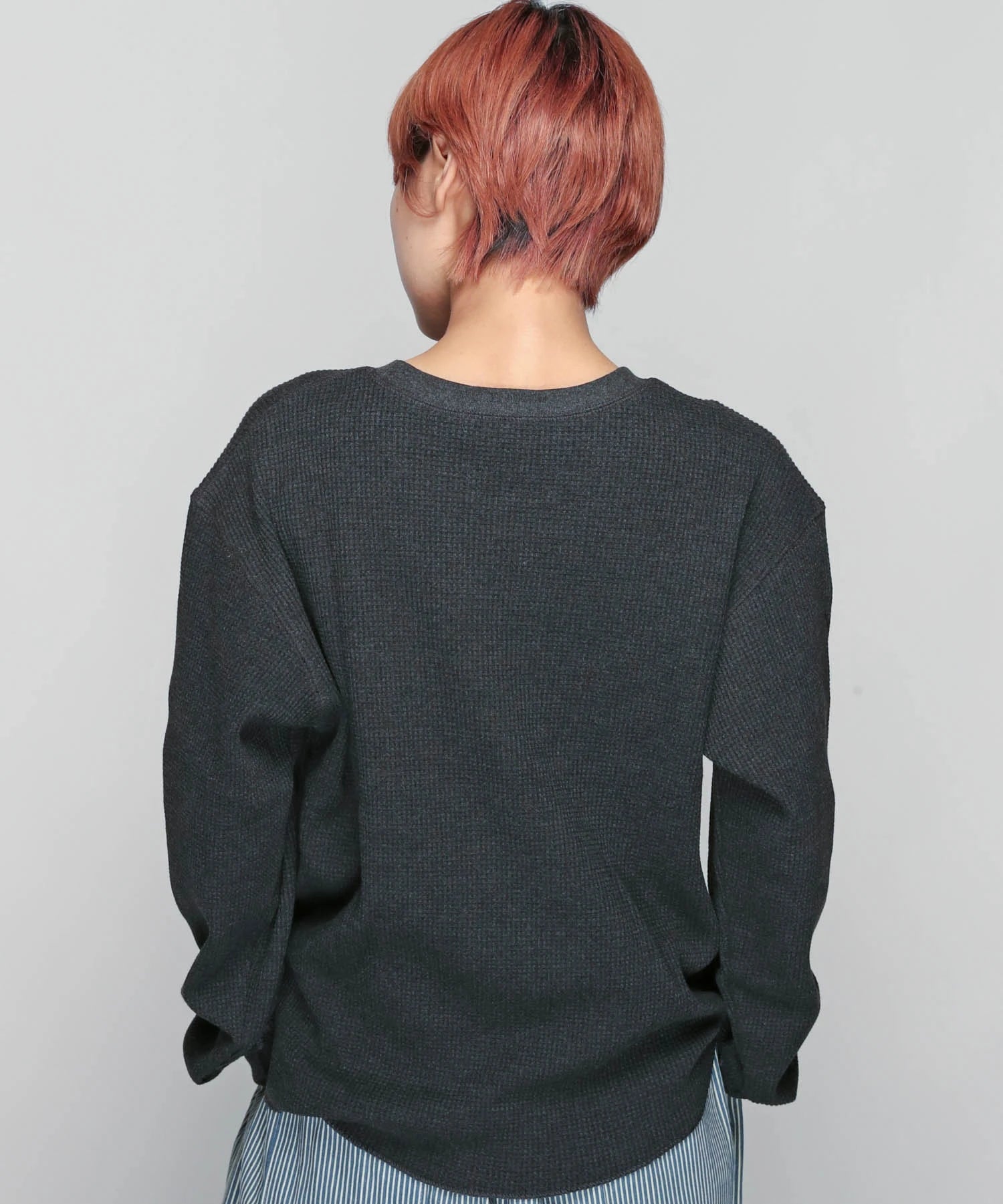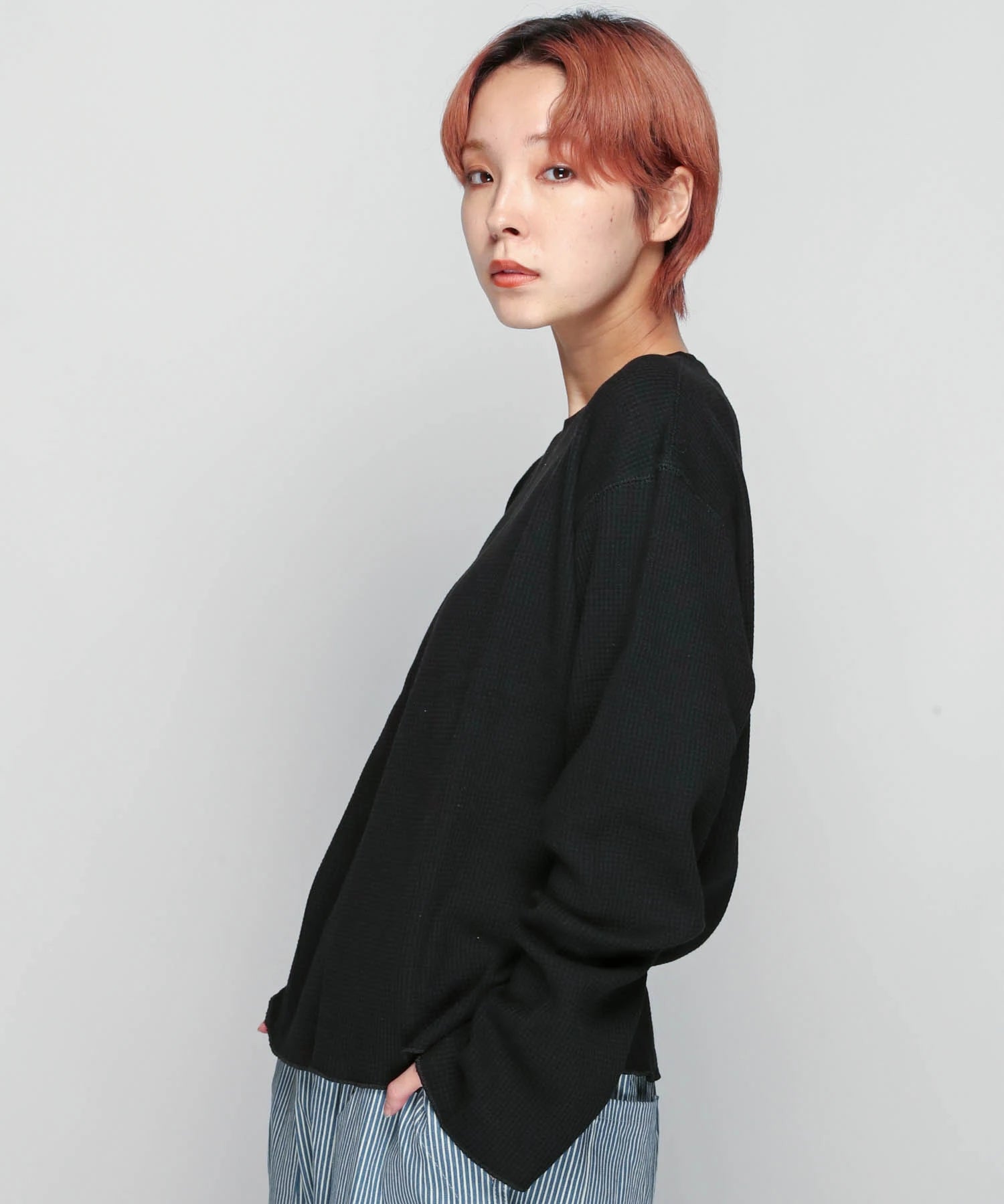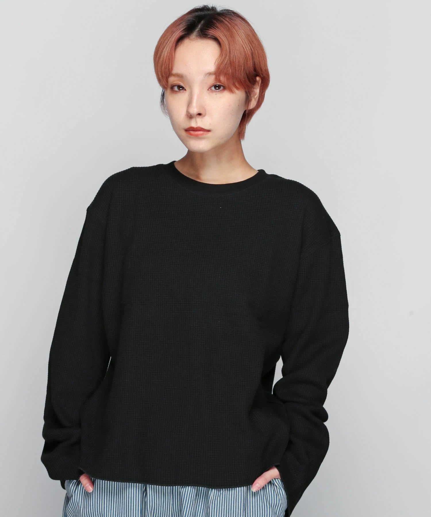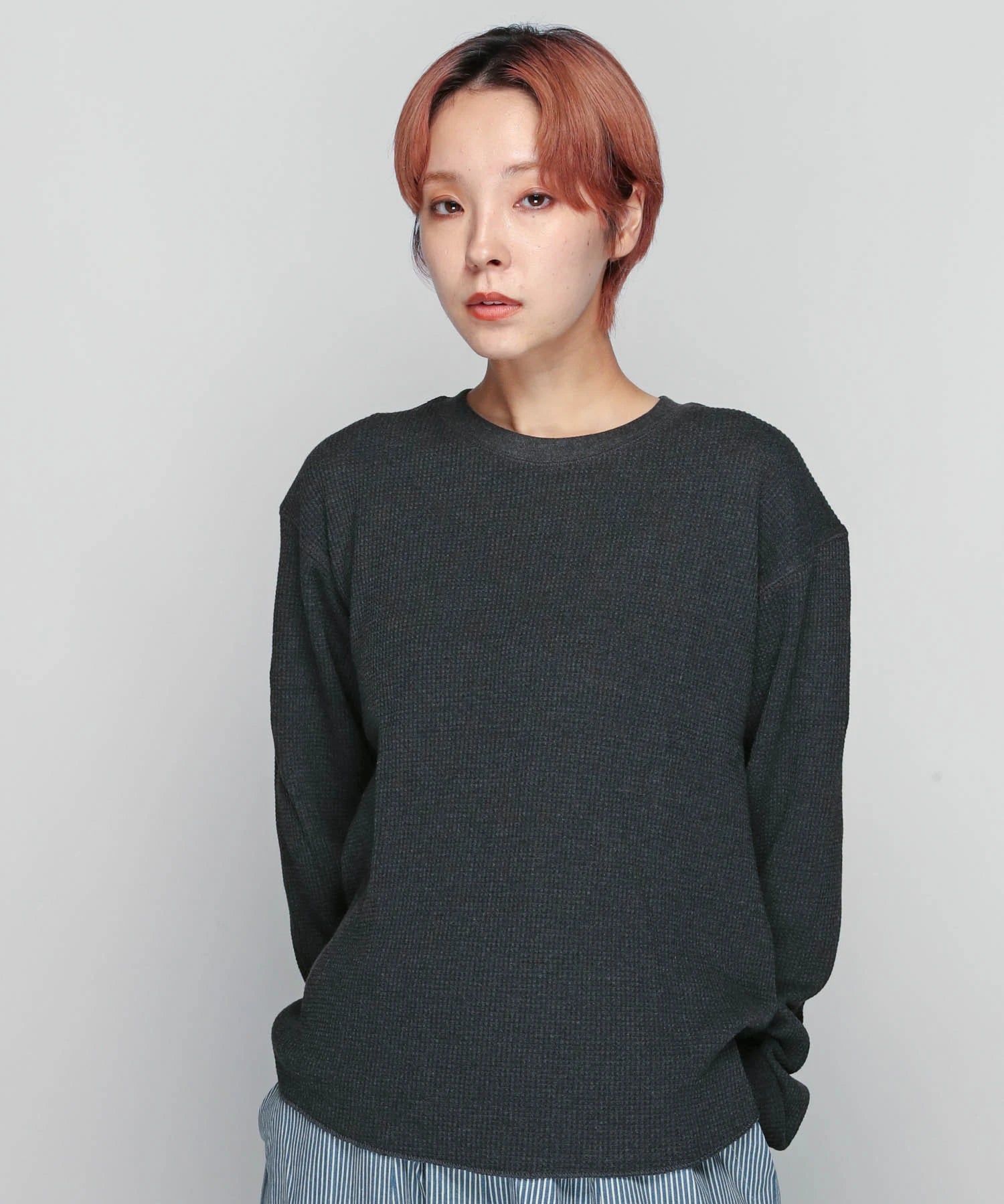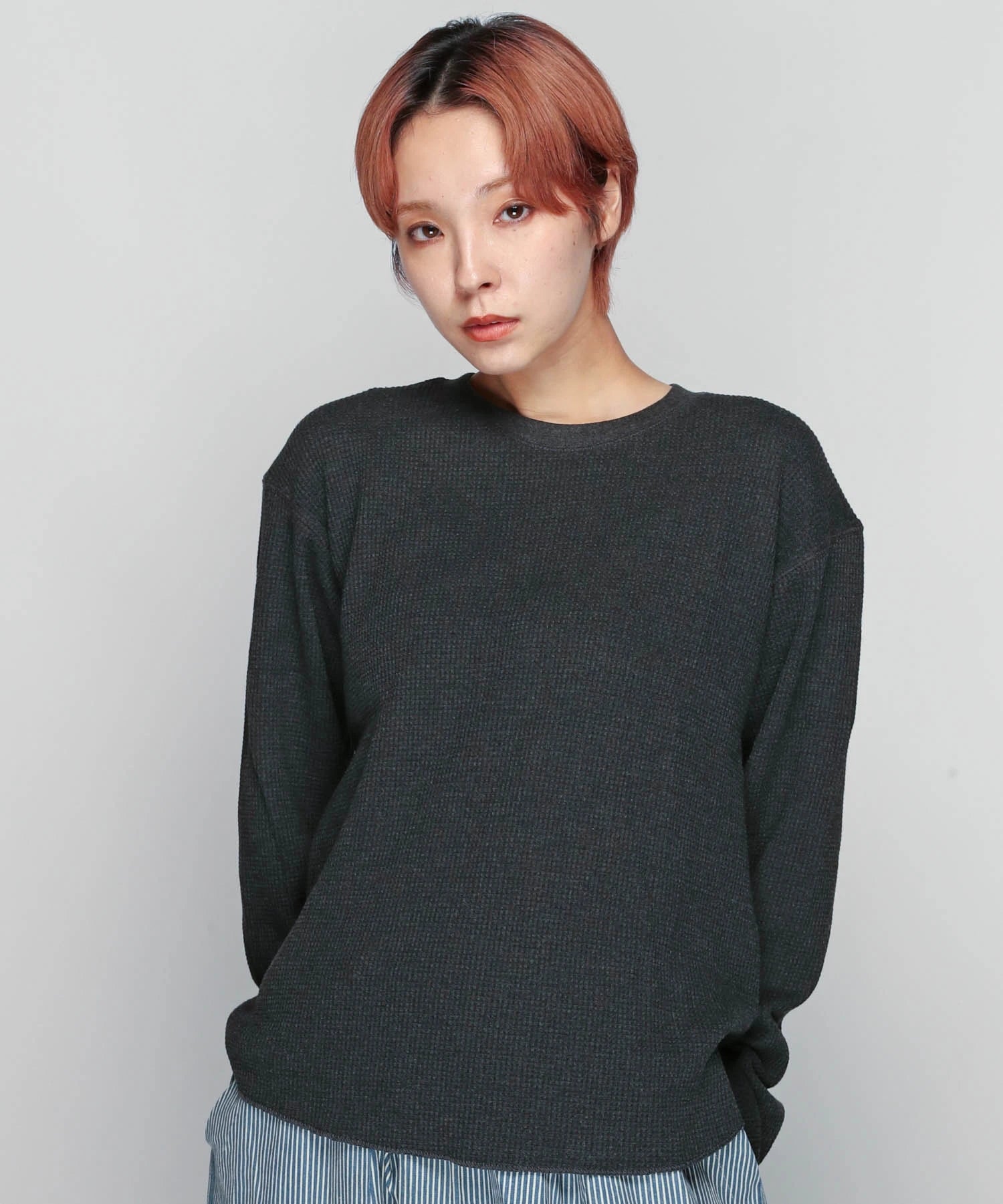 立体感のあるワッフル素材で仕立てた、ショート丈ロングスリーブTシャツが登場。凹凸のあるワッフル編みが、シンプルながらも存在感のある表情を演出。ショート丈のボックスシルエットが、トレンド感と抜け感を両立し、レイヤードスタイルにも最適です。袖はやや長めに設計されており、ゆるさとモード感を兼ね備えたバランスに。裾のドロップ感が、パンツとの相性を高め、スタイリングに奥行きを与えます。カラーはホワイト・チャコール・ブラックの3色展開。どれもベーシックながら、素材の表情で差がつく仕上がり。デニムやカーゴ、スラックスなど、幅広いボトムスと好相性です。一枚でもインナー使いでも活躍する万能トップスとして、シーズンレスに重宝するアイテムです。