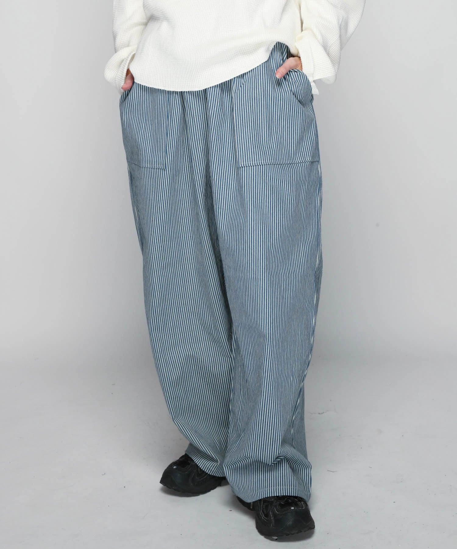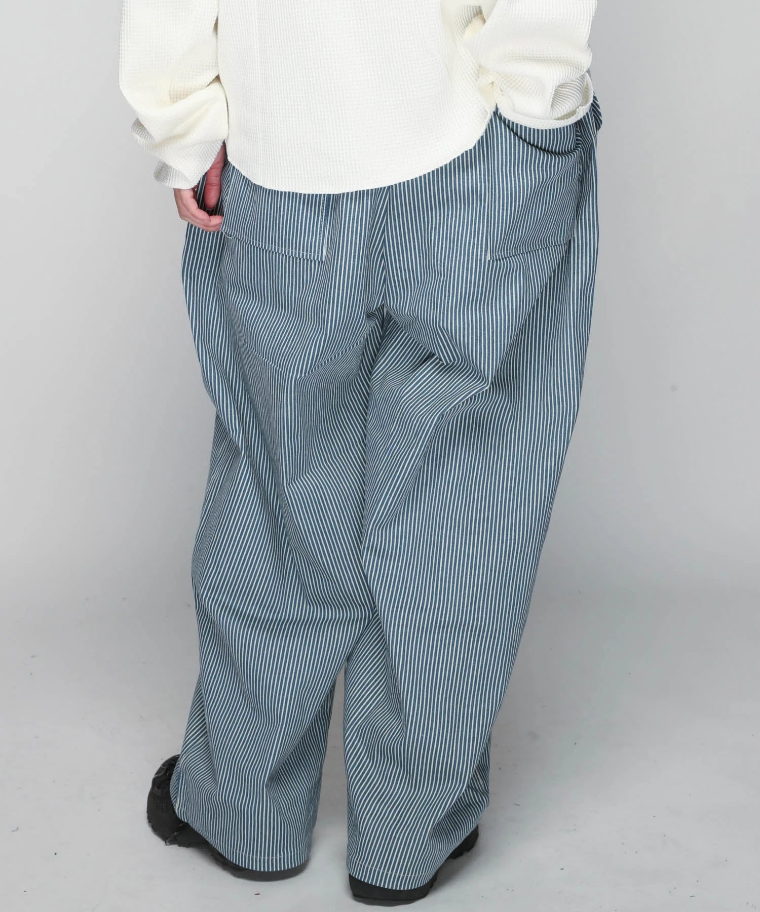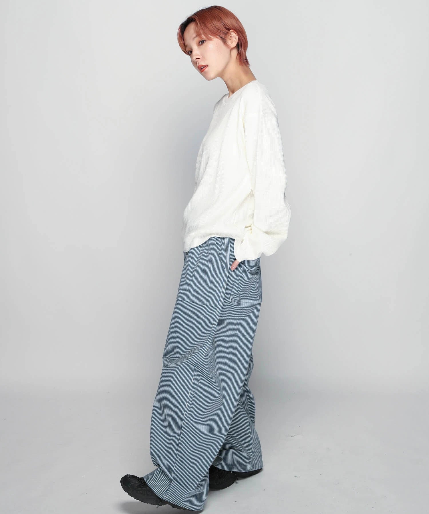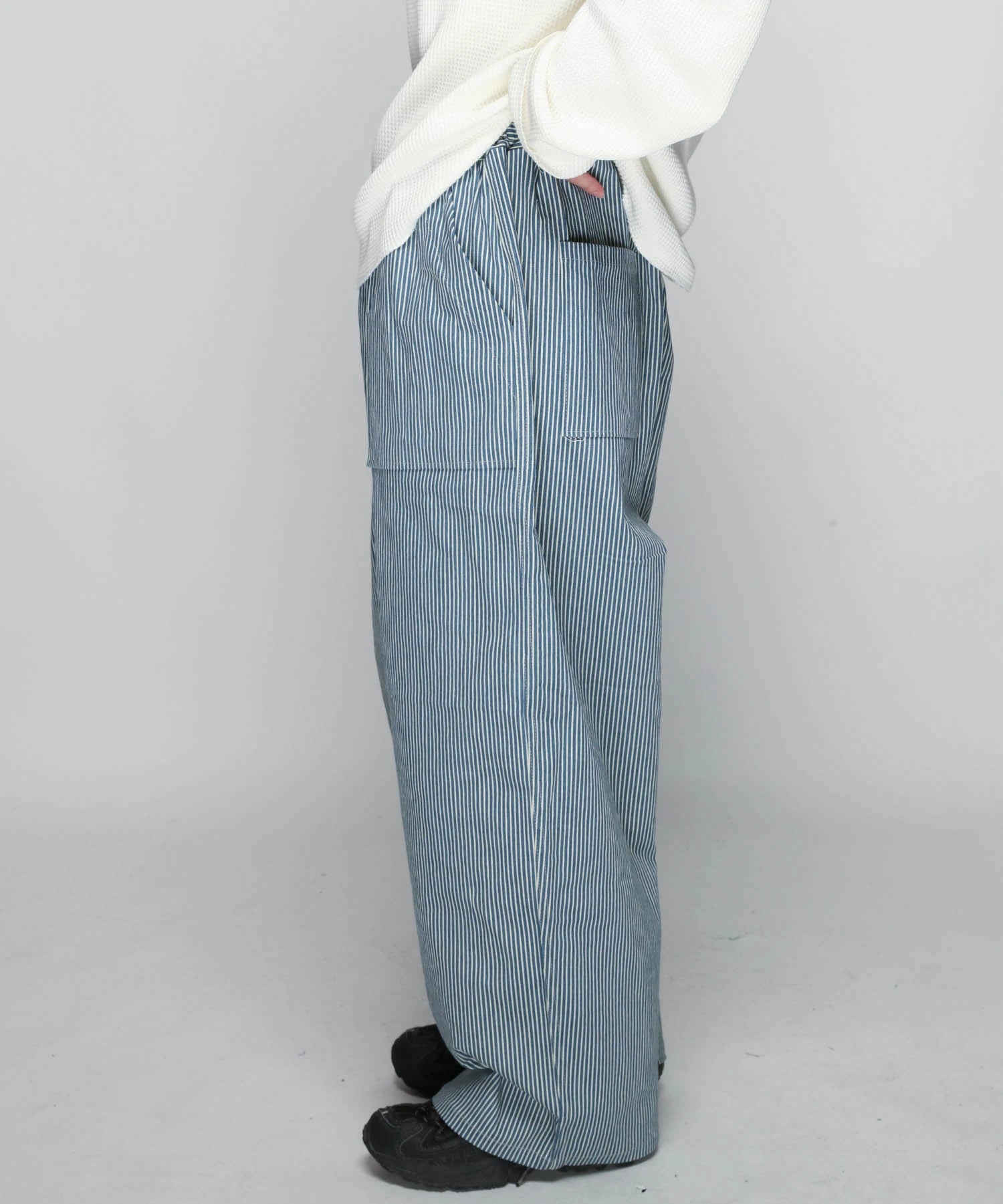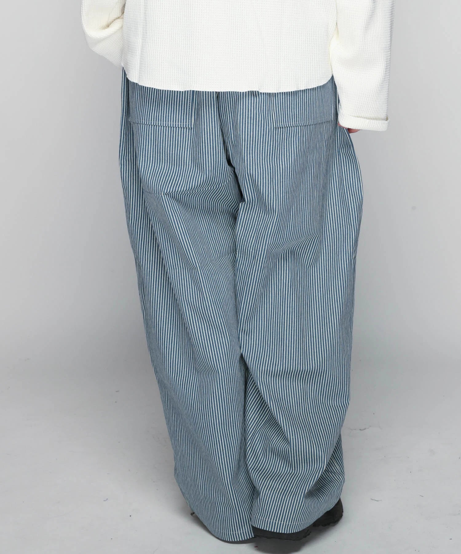 定番ヒッコリーストライプに、ピグメント染めの風合いを加えた新提案。ワークテイストをベースにしながらも、細身のストレートラインで都会的な印象に仕上げた一本。ピグメント加工によるムラ感のある色味が、こなれた雰囲気を演出します。インディゴの濃・淡2色展開で、シンプルなトップスと合わせるだけでスタイリングが決まる万能アイテム。スニーカーやブーツとの相性も良く、季節を問わず活躍します。トレンド感と実用性を兼ね備えた一本として、デイリーに取り入れたいパンツです。