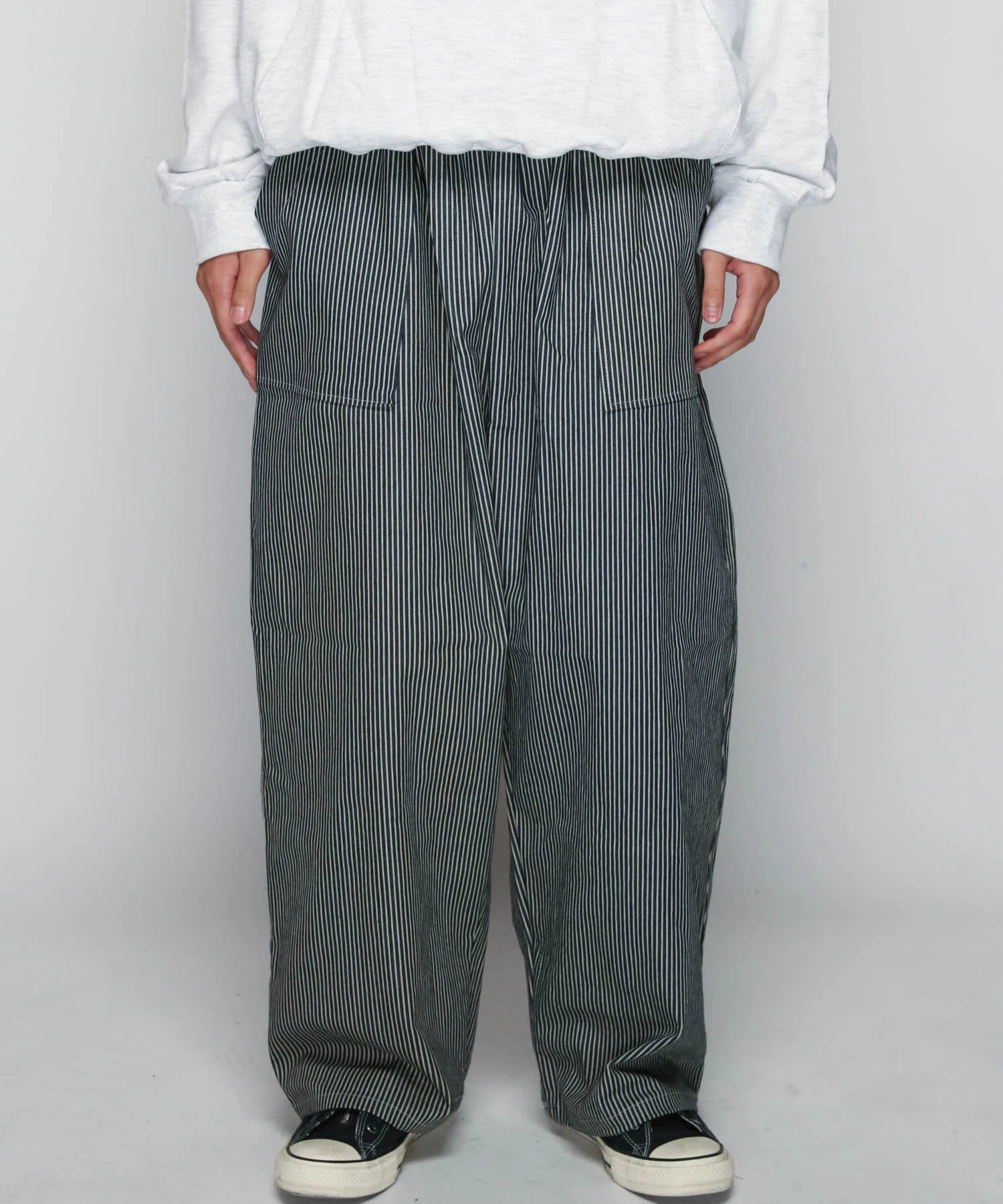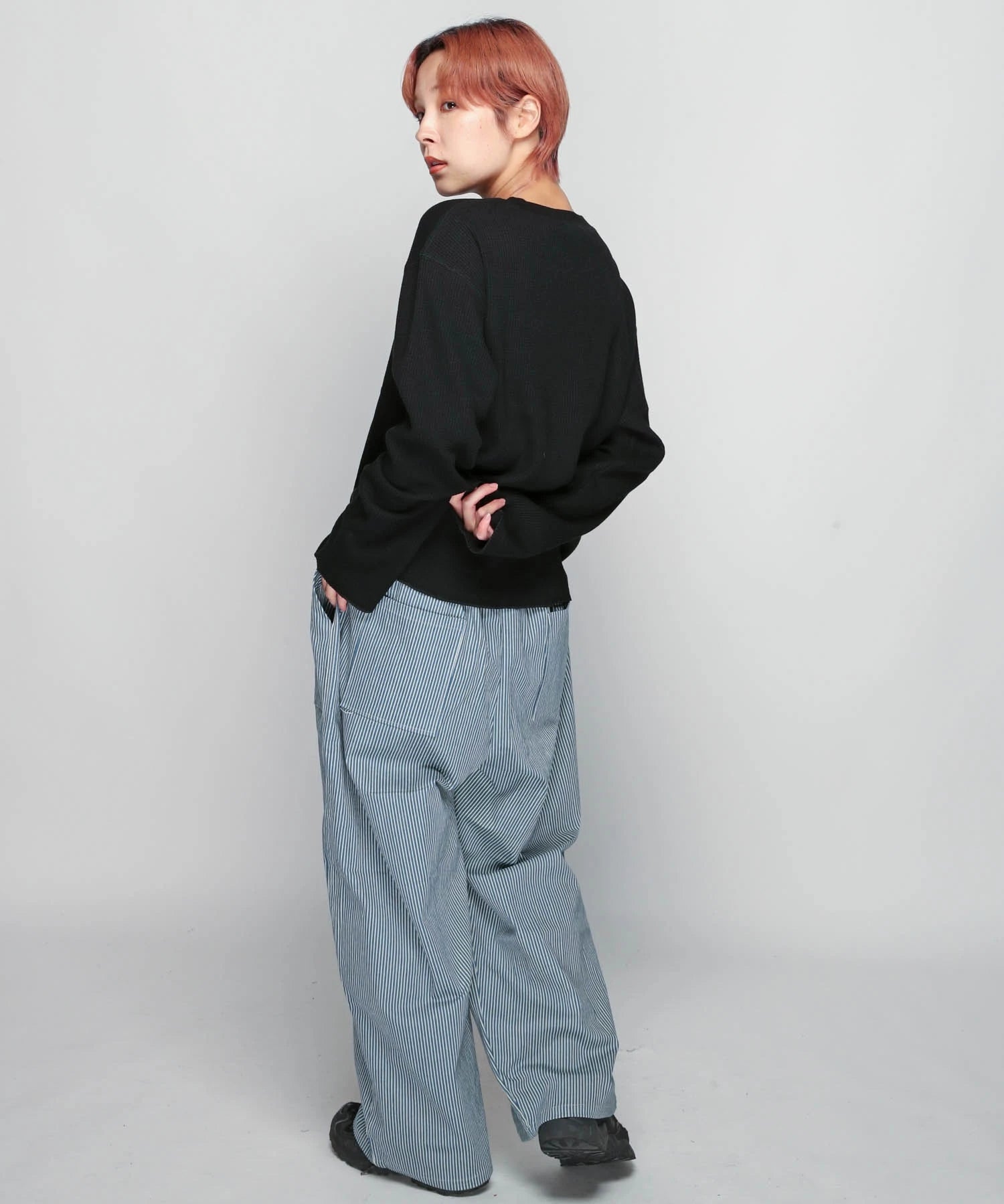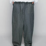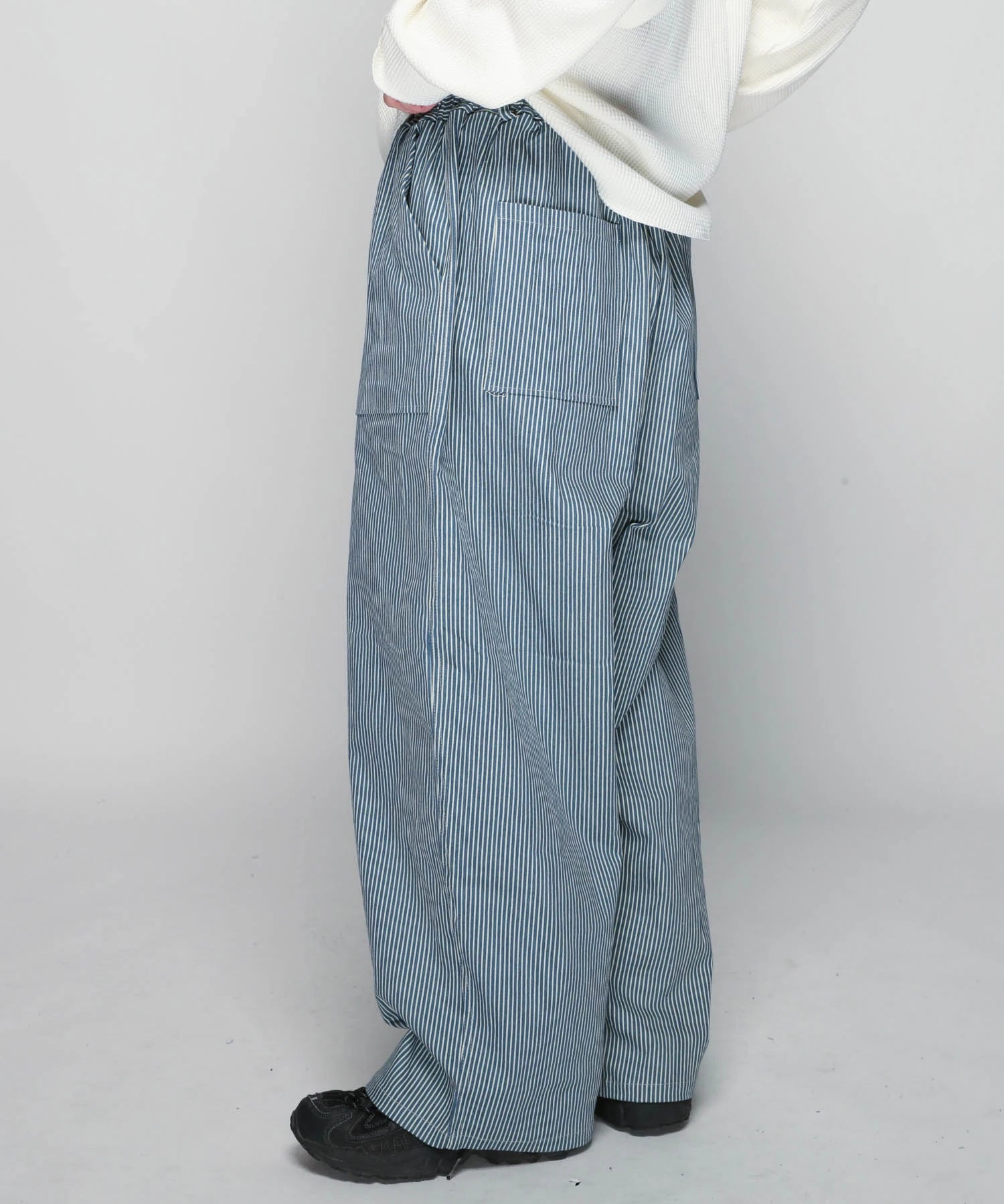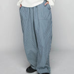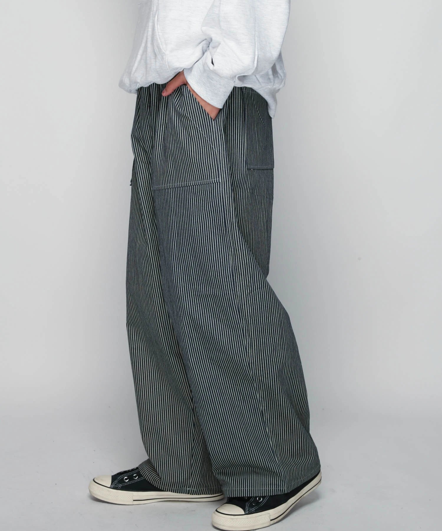 定番ヒッコリーストライプに、ピグメント染めの風合いを加えた新提案。ワークテイストをベースにしながらも、細身のストレートラインで都会的な印象に仕上げた一本。ピグメント加工によるムラ感のある色味が、こなれた雰囲気を演出します。インディゴの濃・淡2色展開で、シンプルなトップスと合わせるだけでスタイリングが決まる万能アイテム。スニーカーやブーツとの相性も良く、季節を問わず活躍します。トレンド感と実用性を兼ね備えた一本として、デイリーに取り入れたいパンツです。