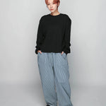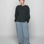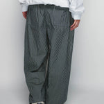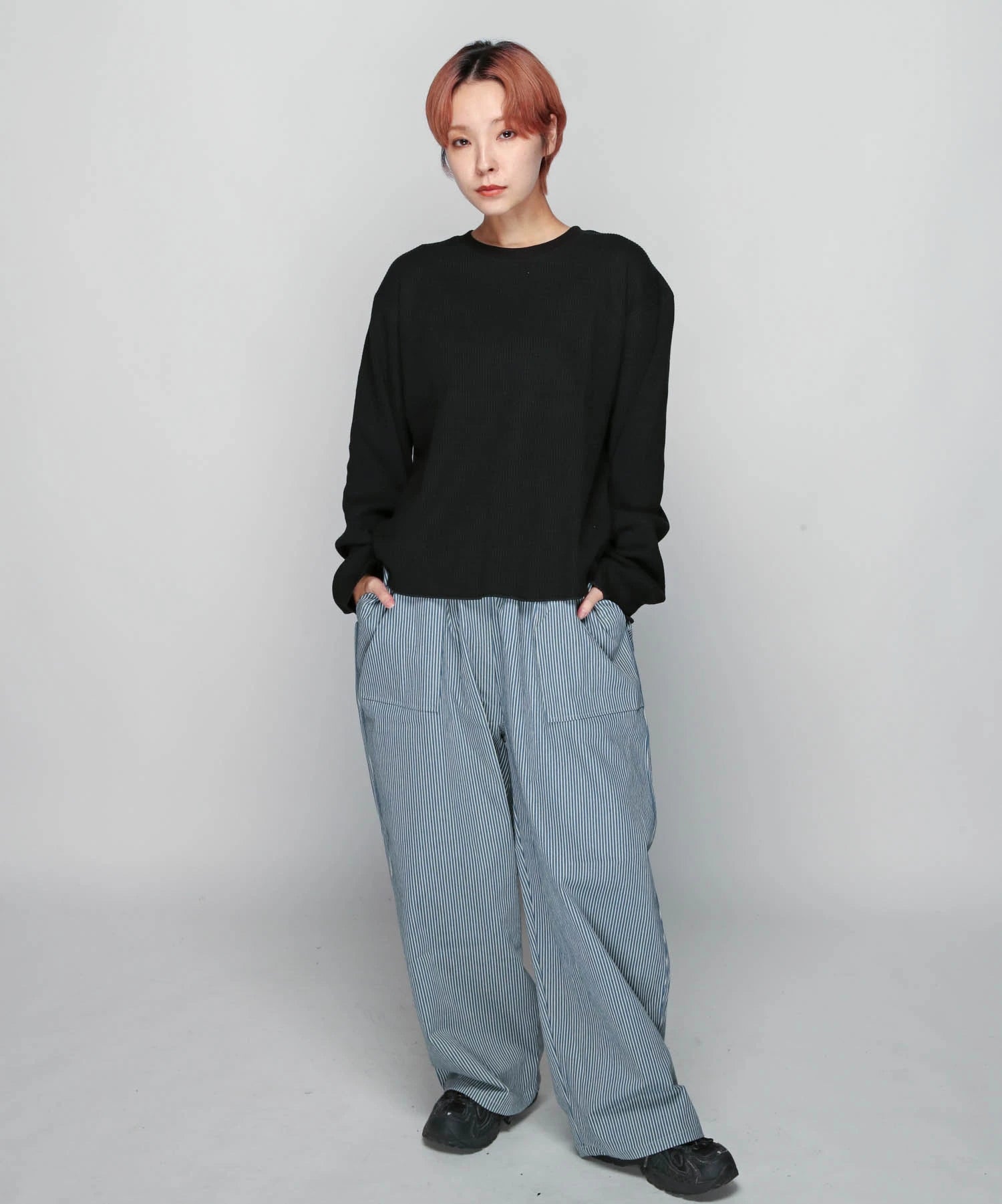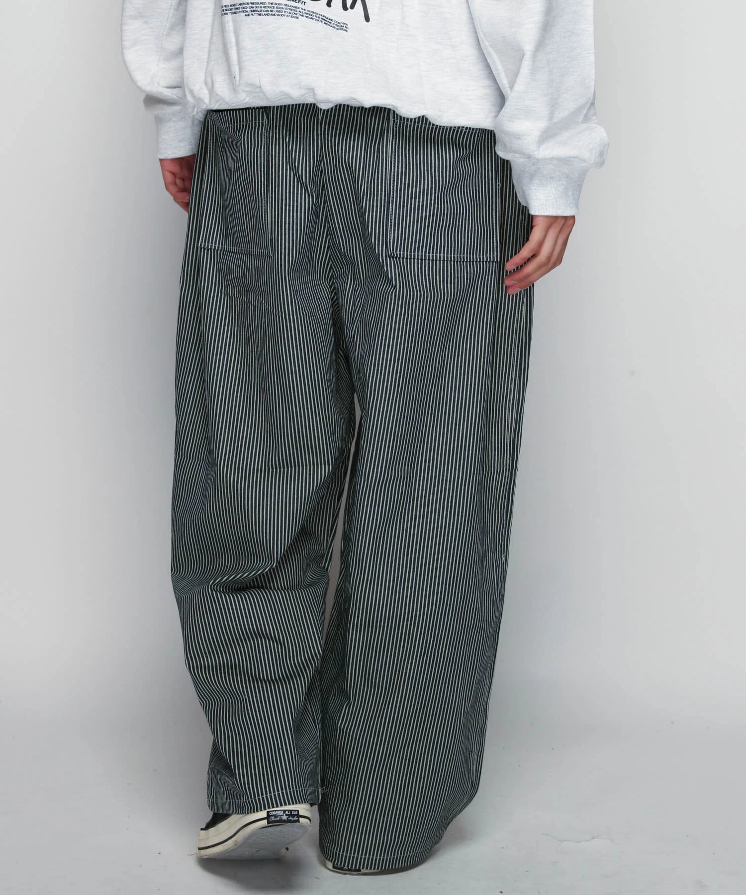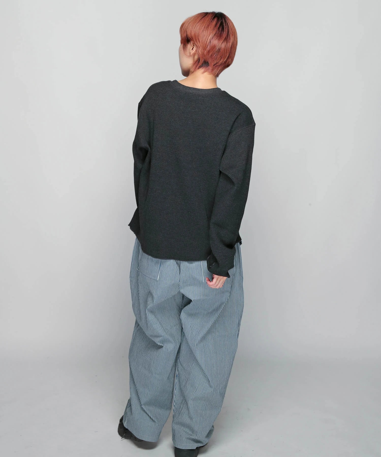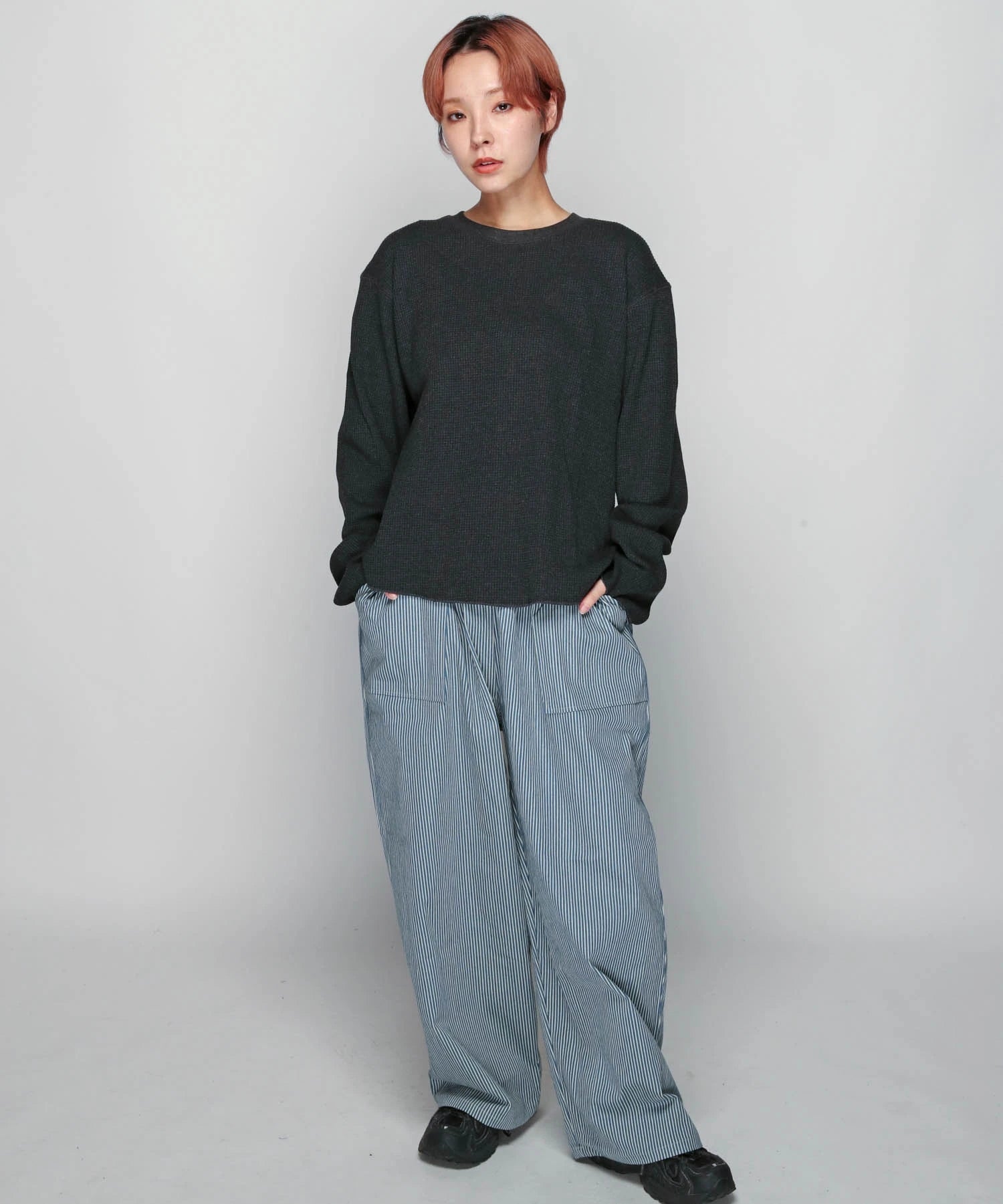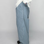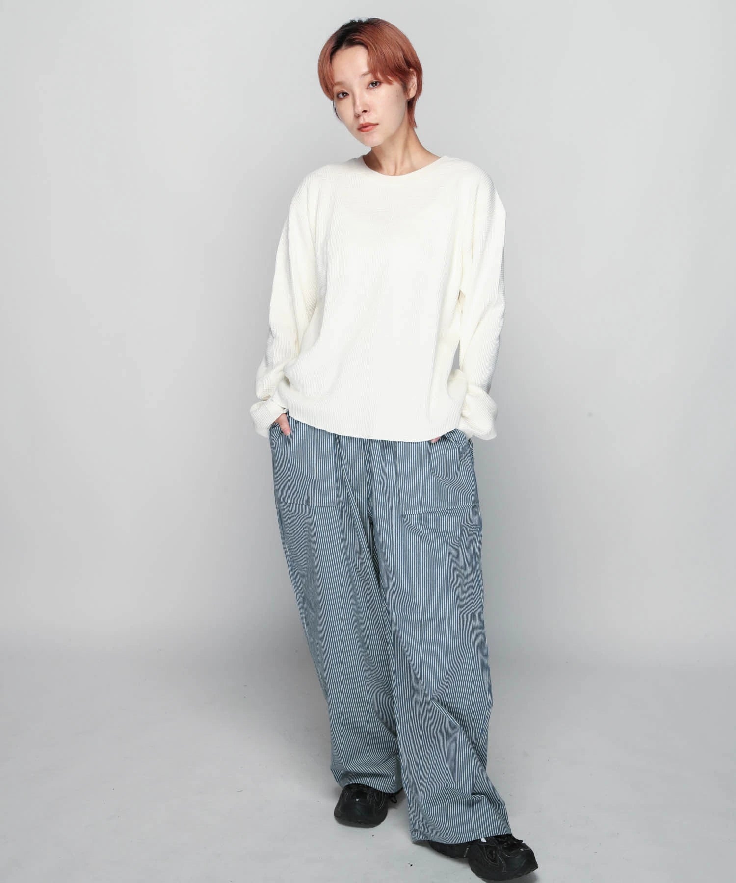 定番ヒッコリーストライプに、ピグメント染めの風合いを加えた新提案。ワークテイストをベースにしながらも、細身のストレートラインで都会的な印象に仕上げた一本。ピグメント加工によるムラ感のある色味が、こなれた雰囲気を演出します。インディゴの濃・淡2色展開で、シンプルなトップスと合わせるだけでスタイリングが決まる万能アイテム。スニーカーやブーツとの相性も良く、季節を問わず活躍します。トレンド感と実用性を兼ね備えた一本として、デイリーに取り入れたいパンツです。