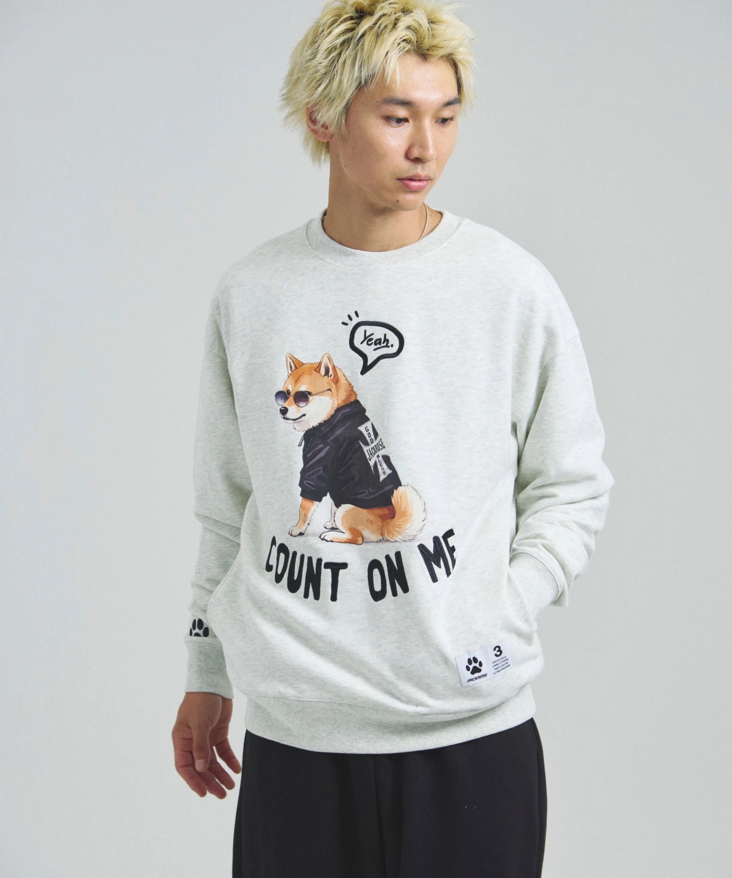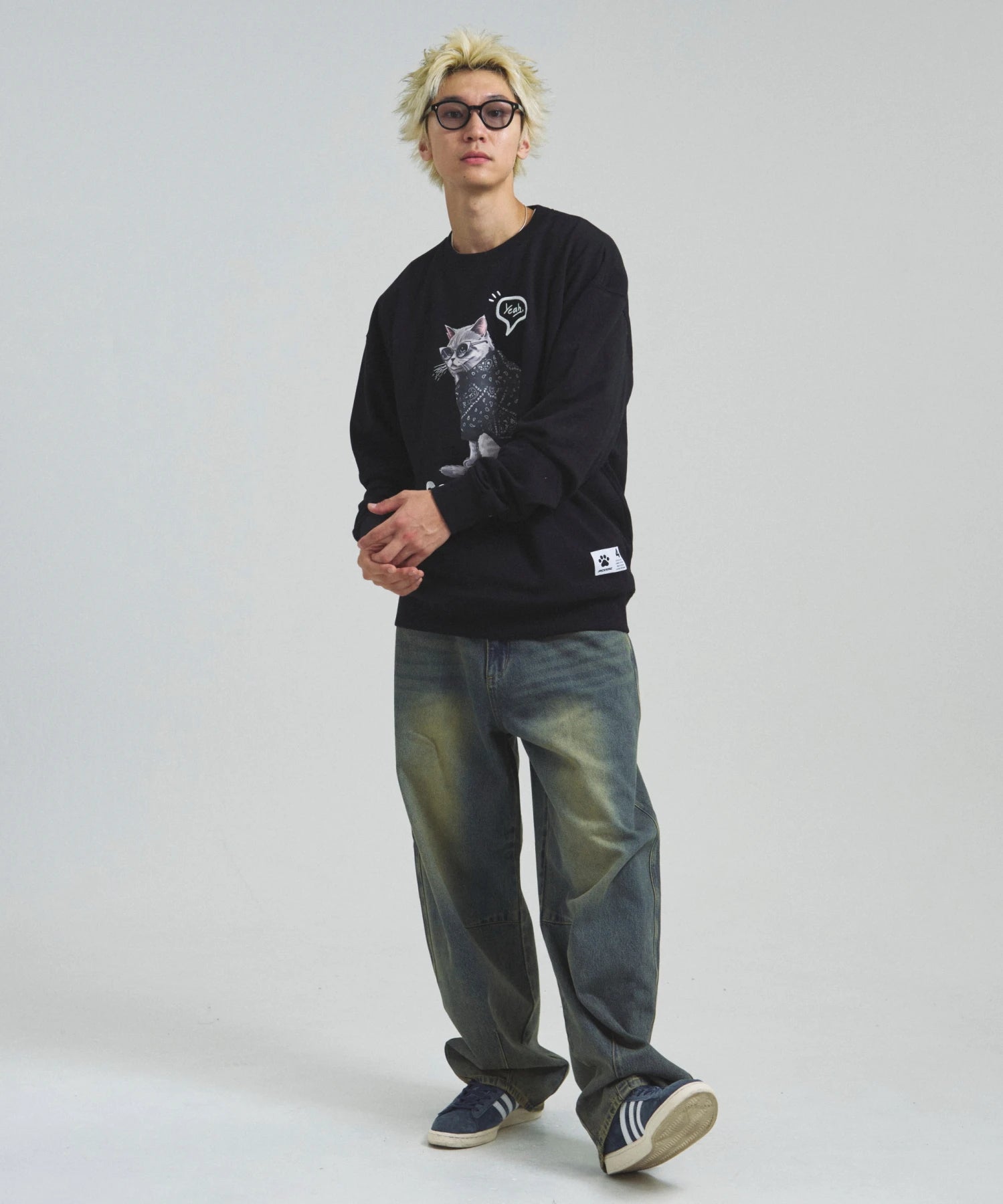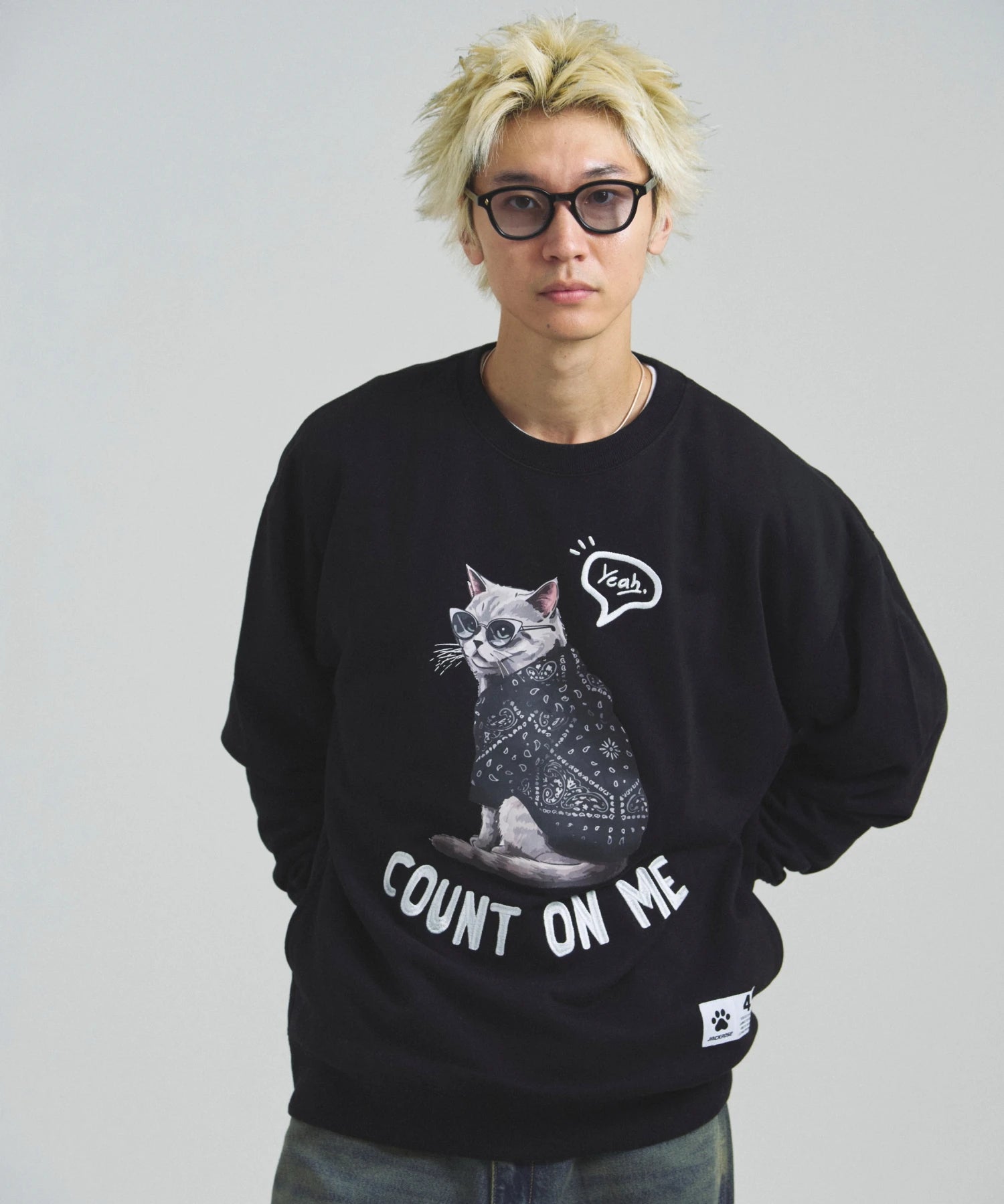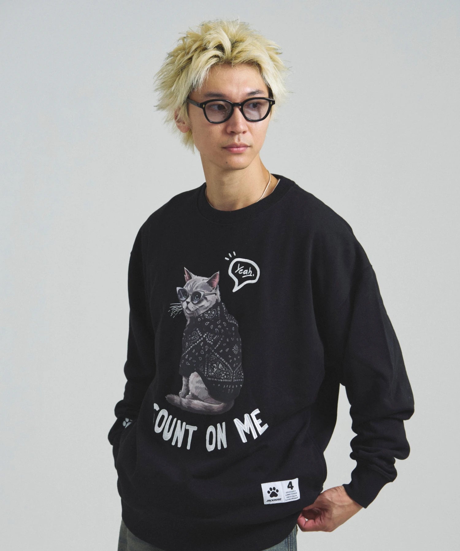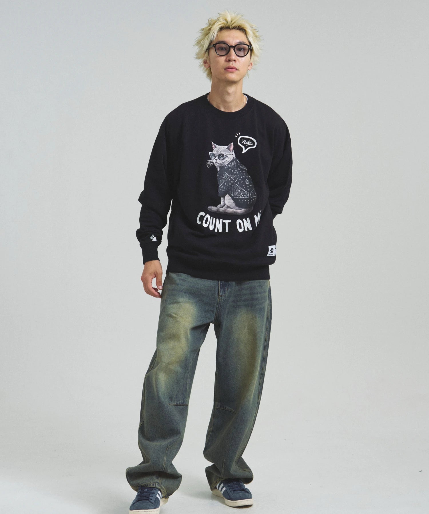 愛らしい犬と猫のグラフィックをあしらったクルースウェット。フロントはユーモアのある大判グラフィックを施し、存在感抜群の仕上がりになっています。背面首元にはシンプルなロゴ刺繍を配置。
