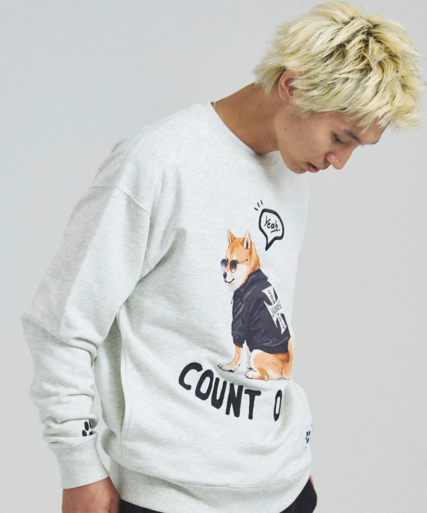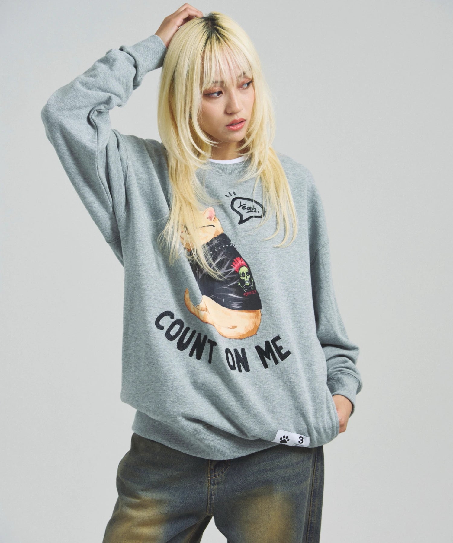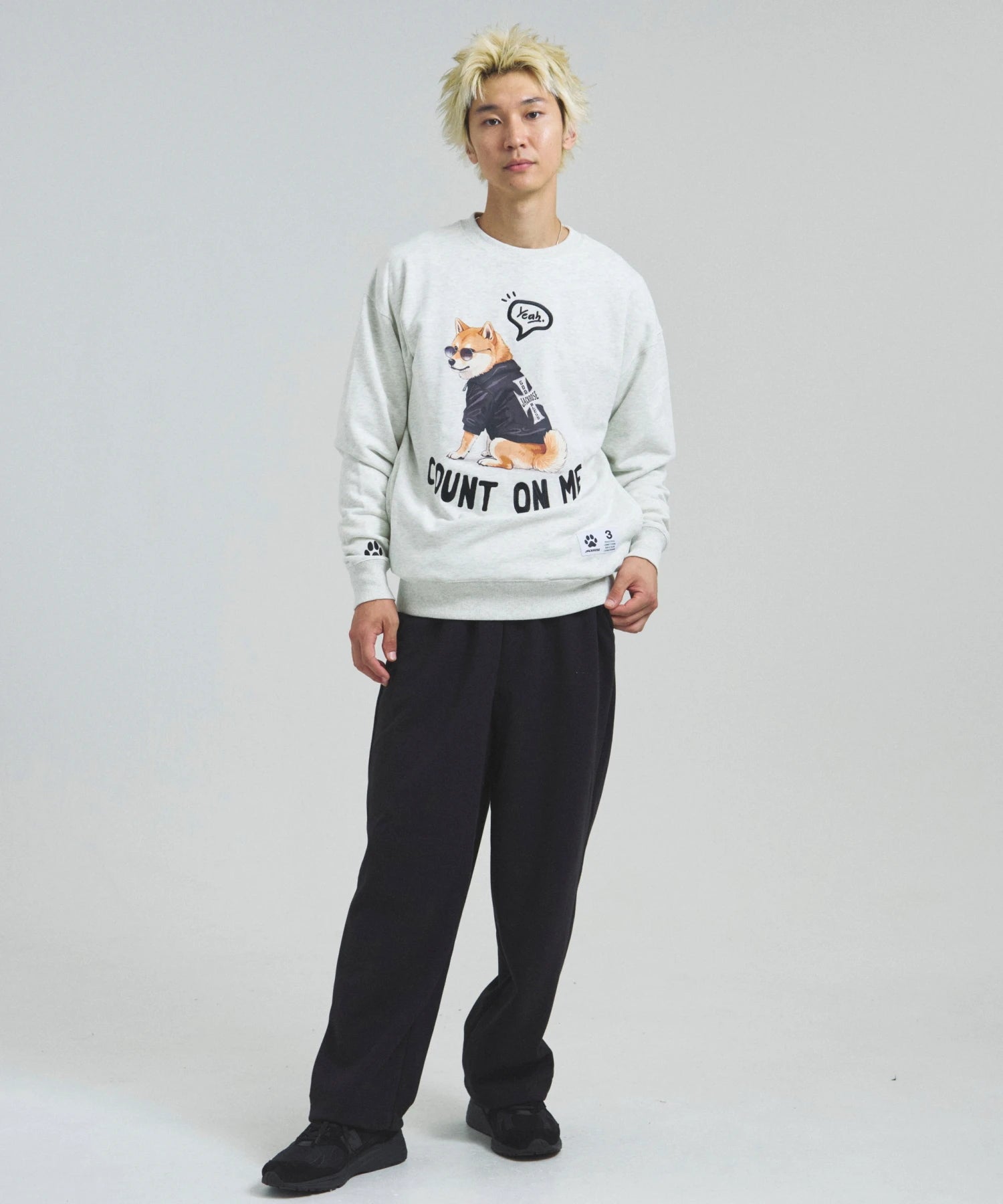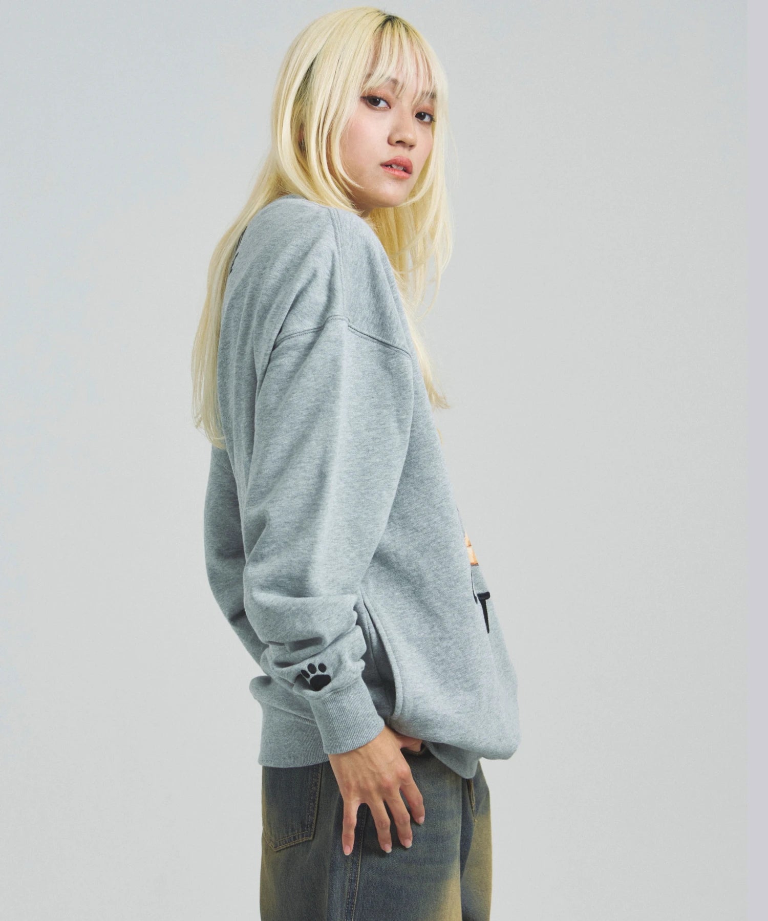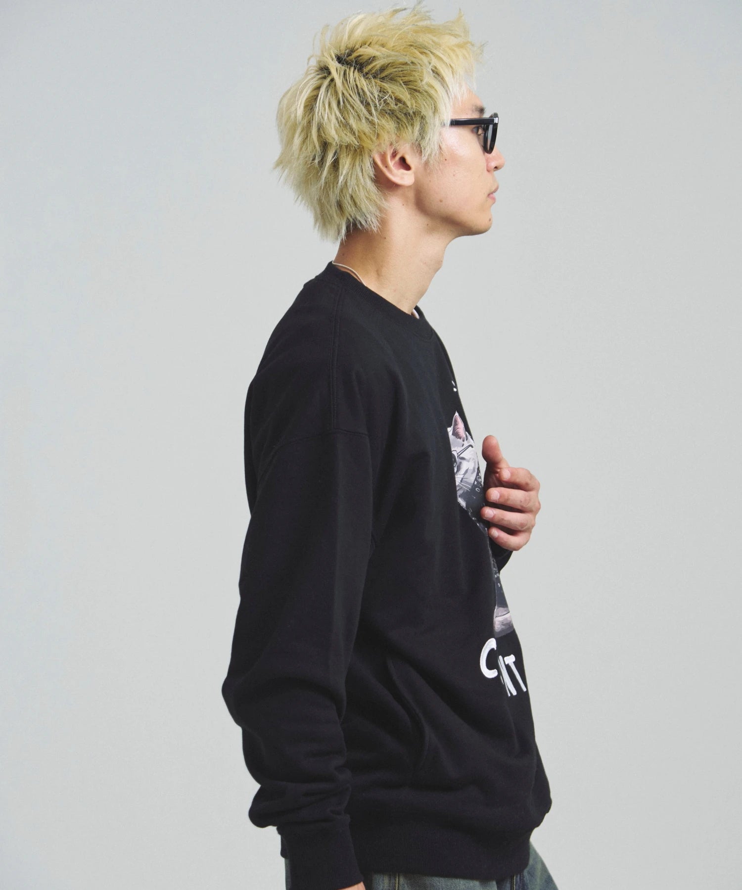 愛らしい犬と猫のグラフィックをあしらったクルースウェット。フロントはユーモアのある大判グラフィックを施し、存在感抜群の仕上がりになっています。背面首元にはシンプルなロゴ刺繍を配置。