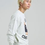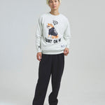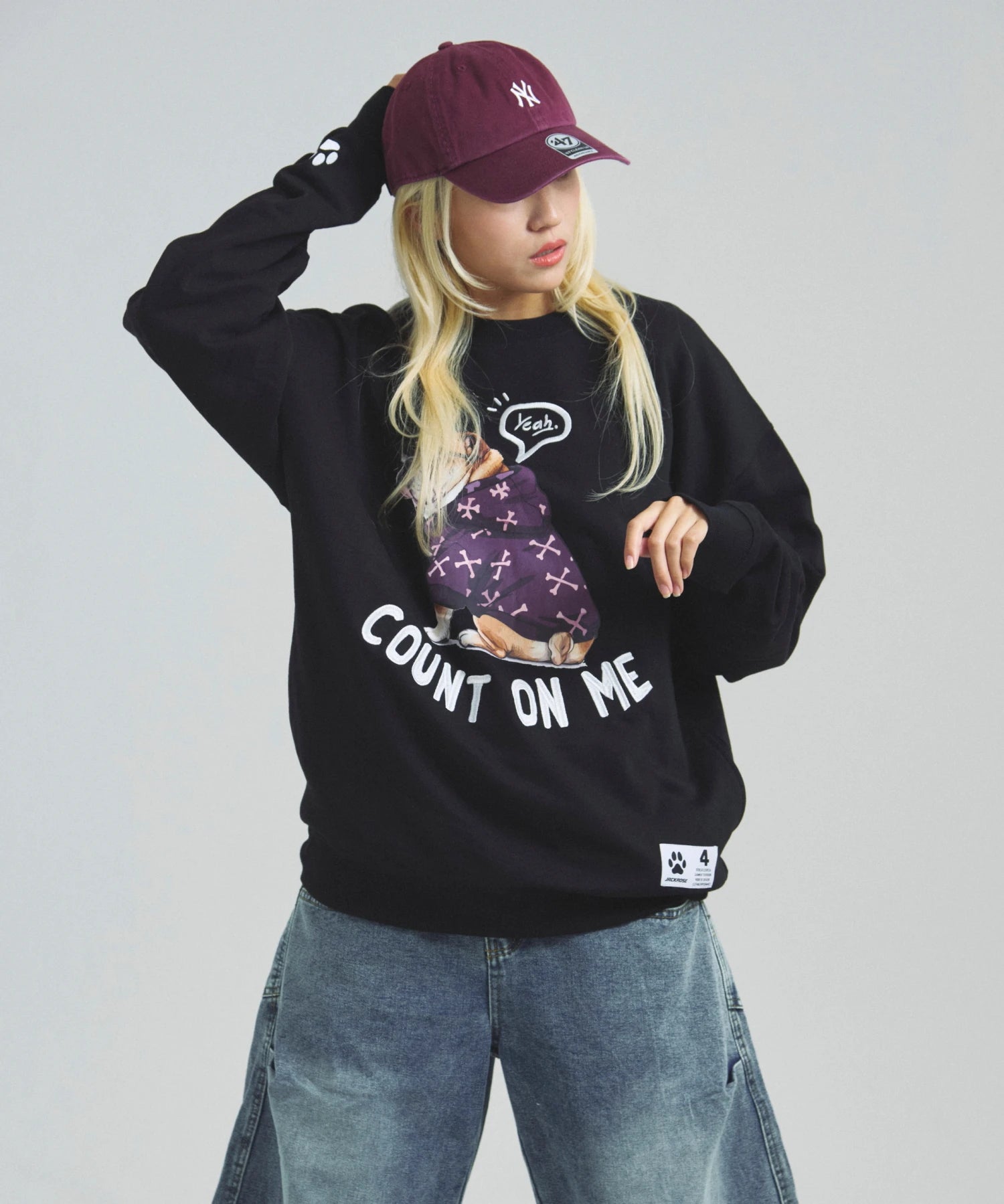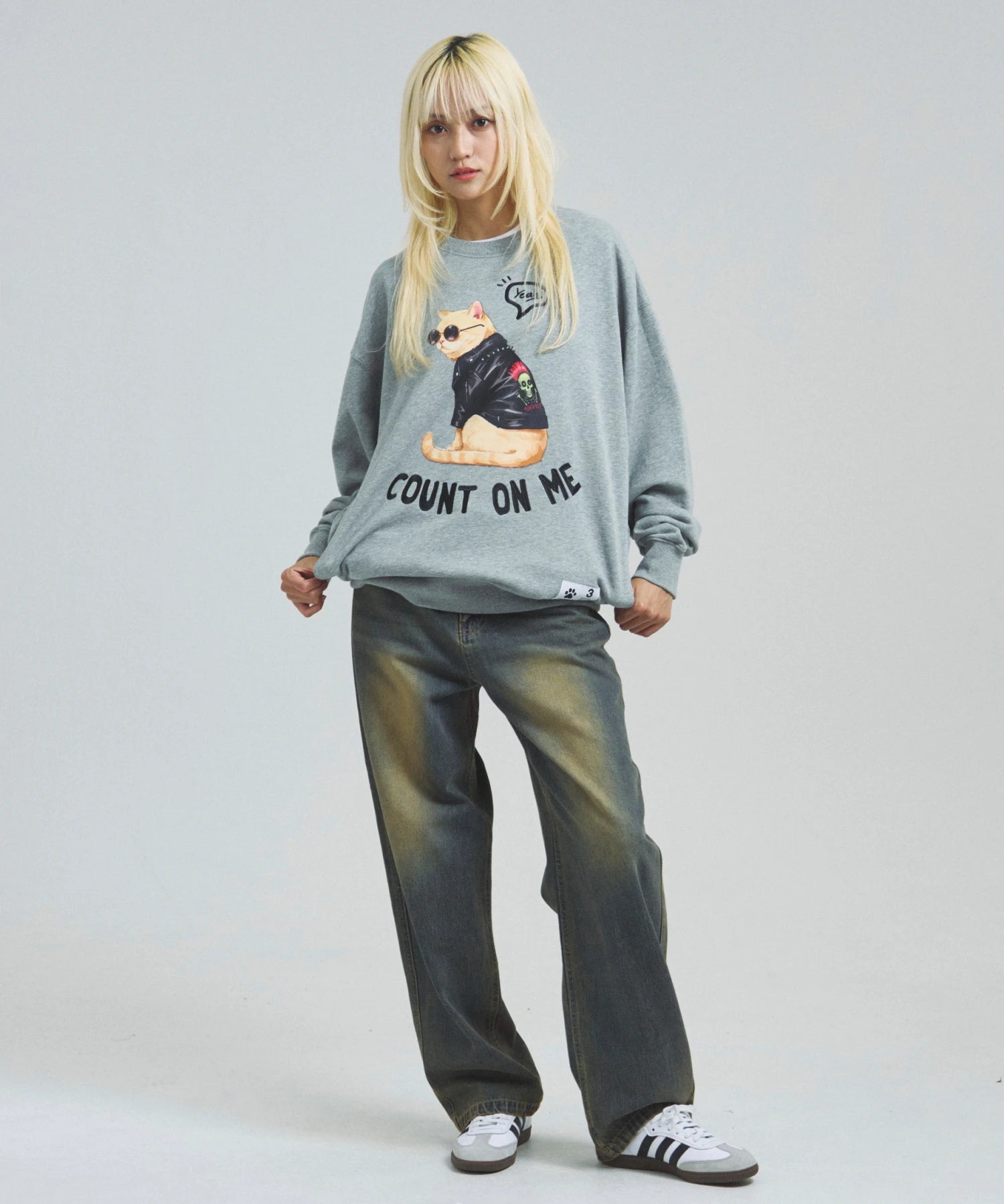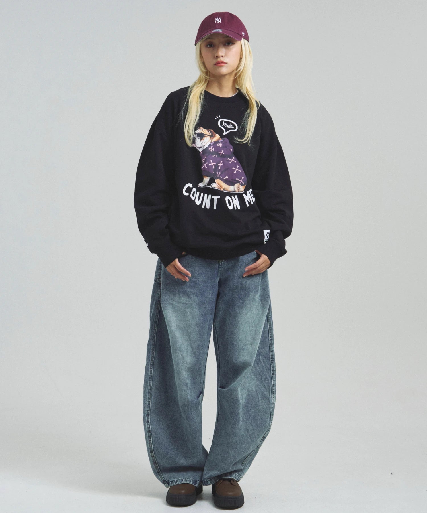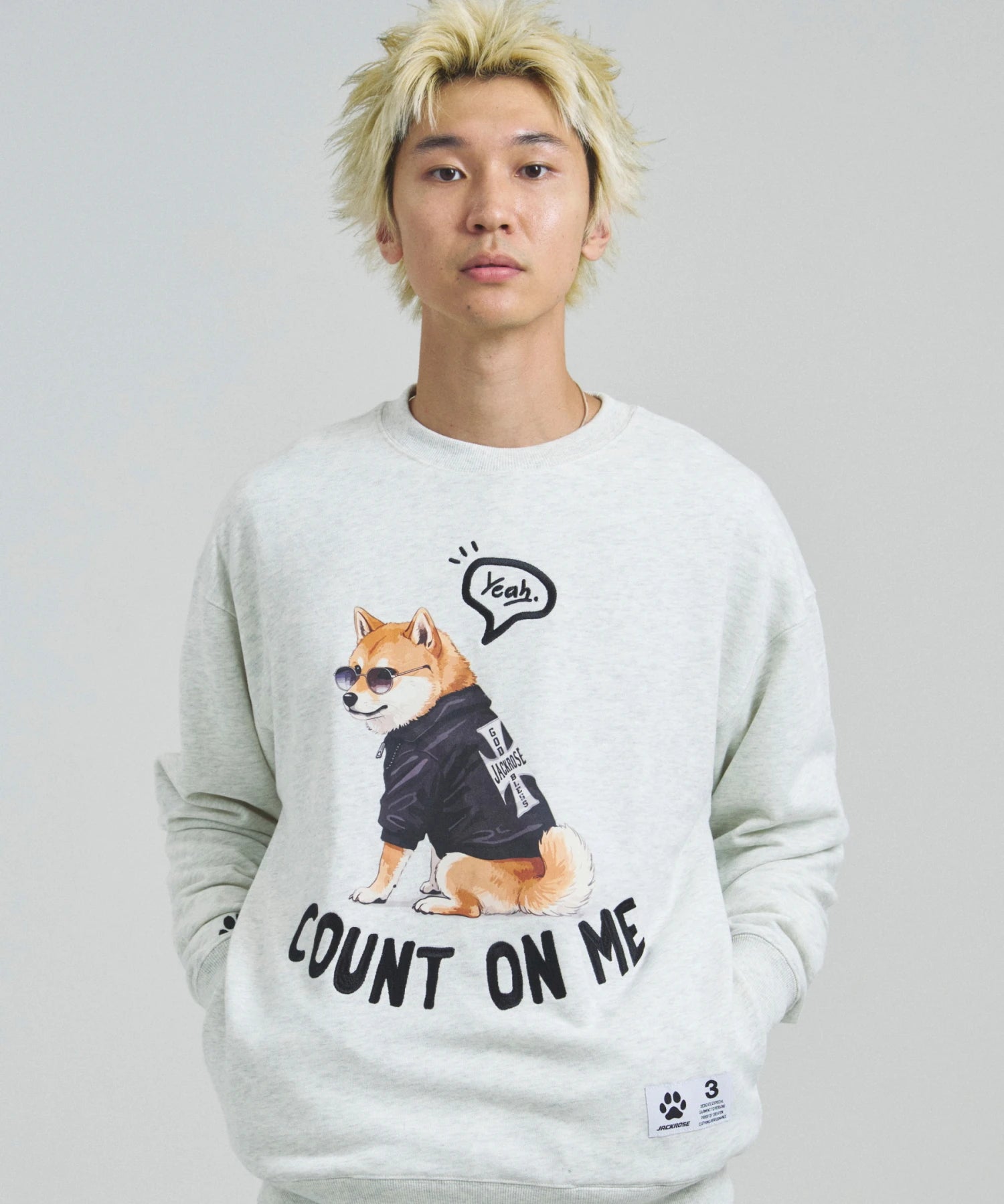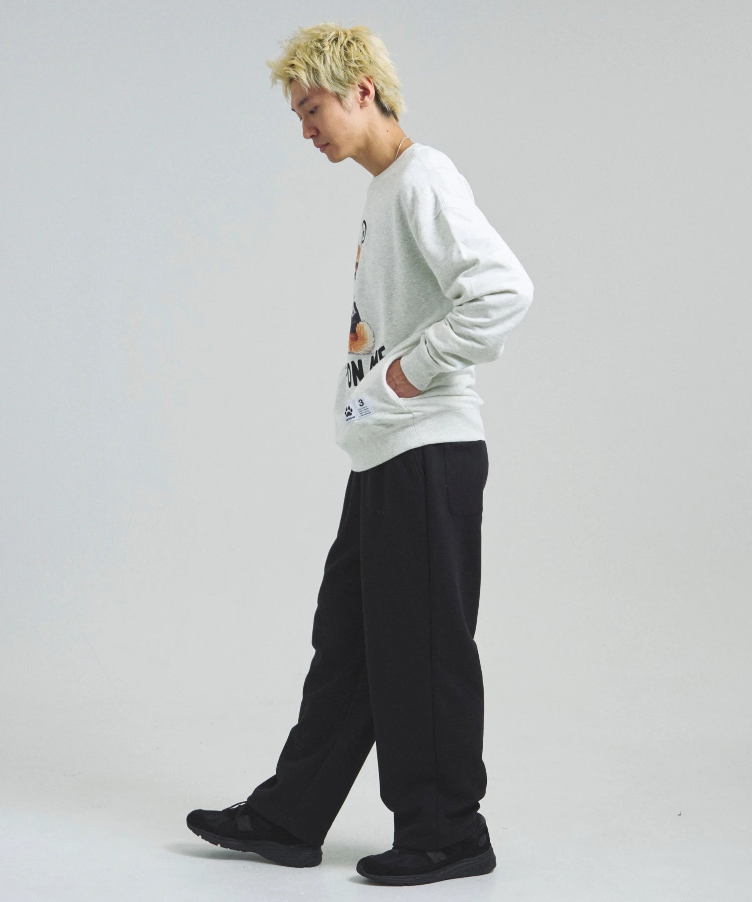 愛らしい犬と猫のグラフィックをあしらったクルースウェット。フロントはユーモアのある大判グラフィックを施し、存在感抜群の仕上がりになっています。背面首元にはシンプルなロゴ刺繍を配置。