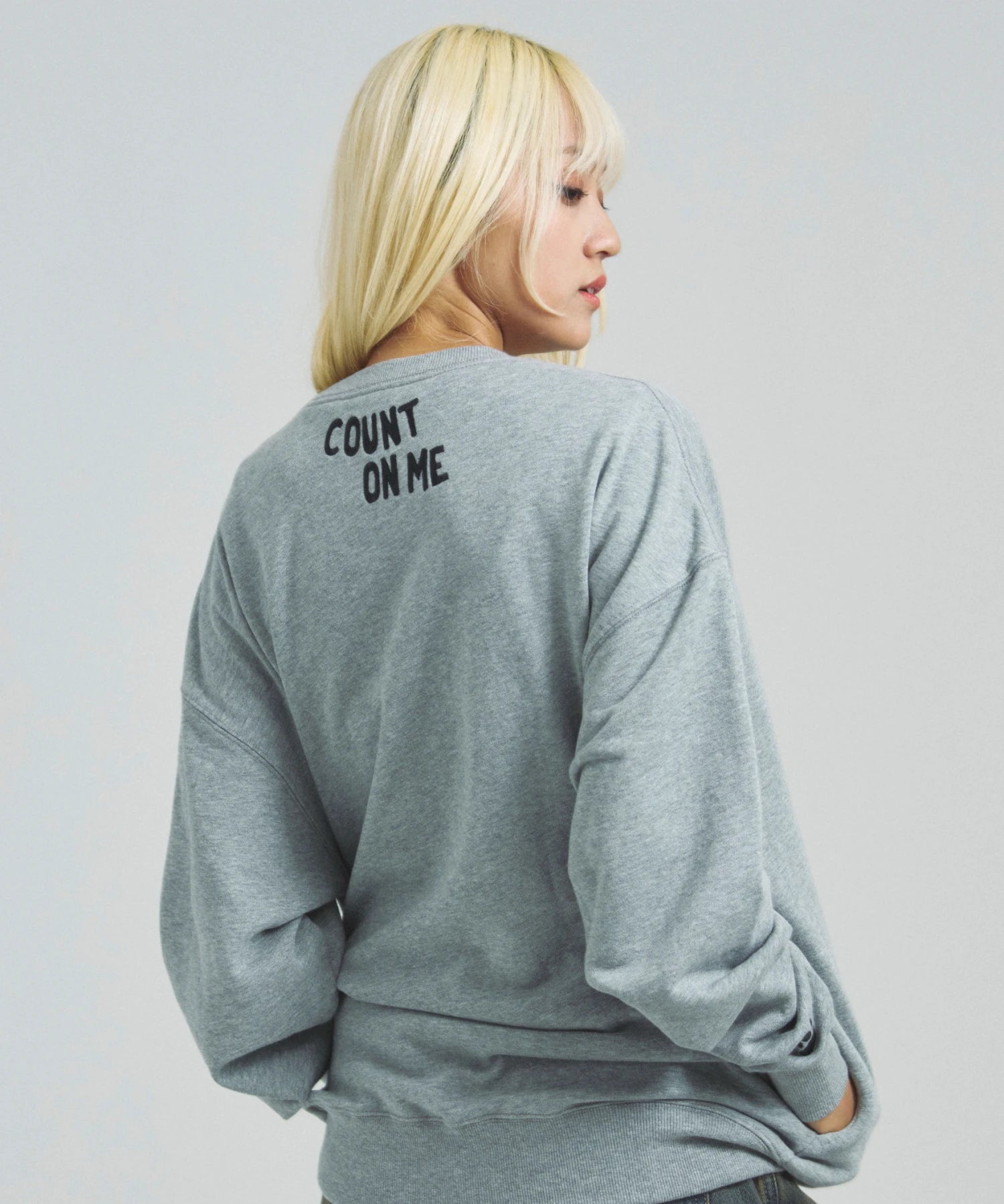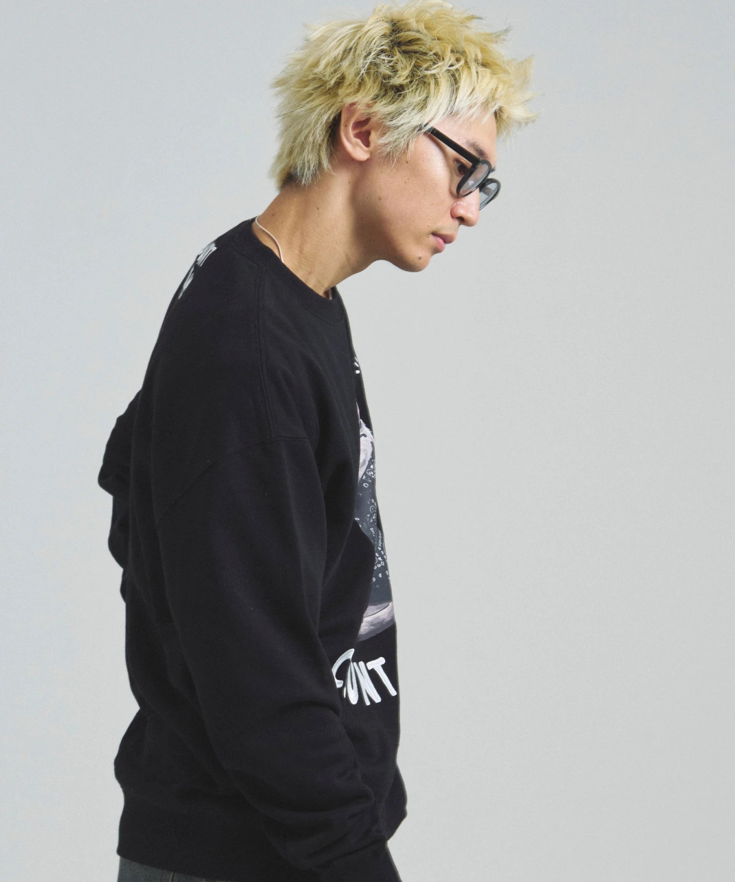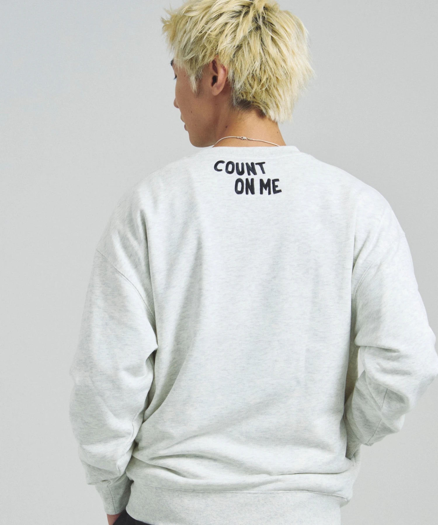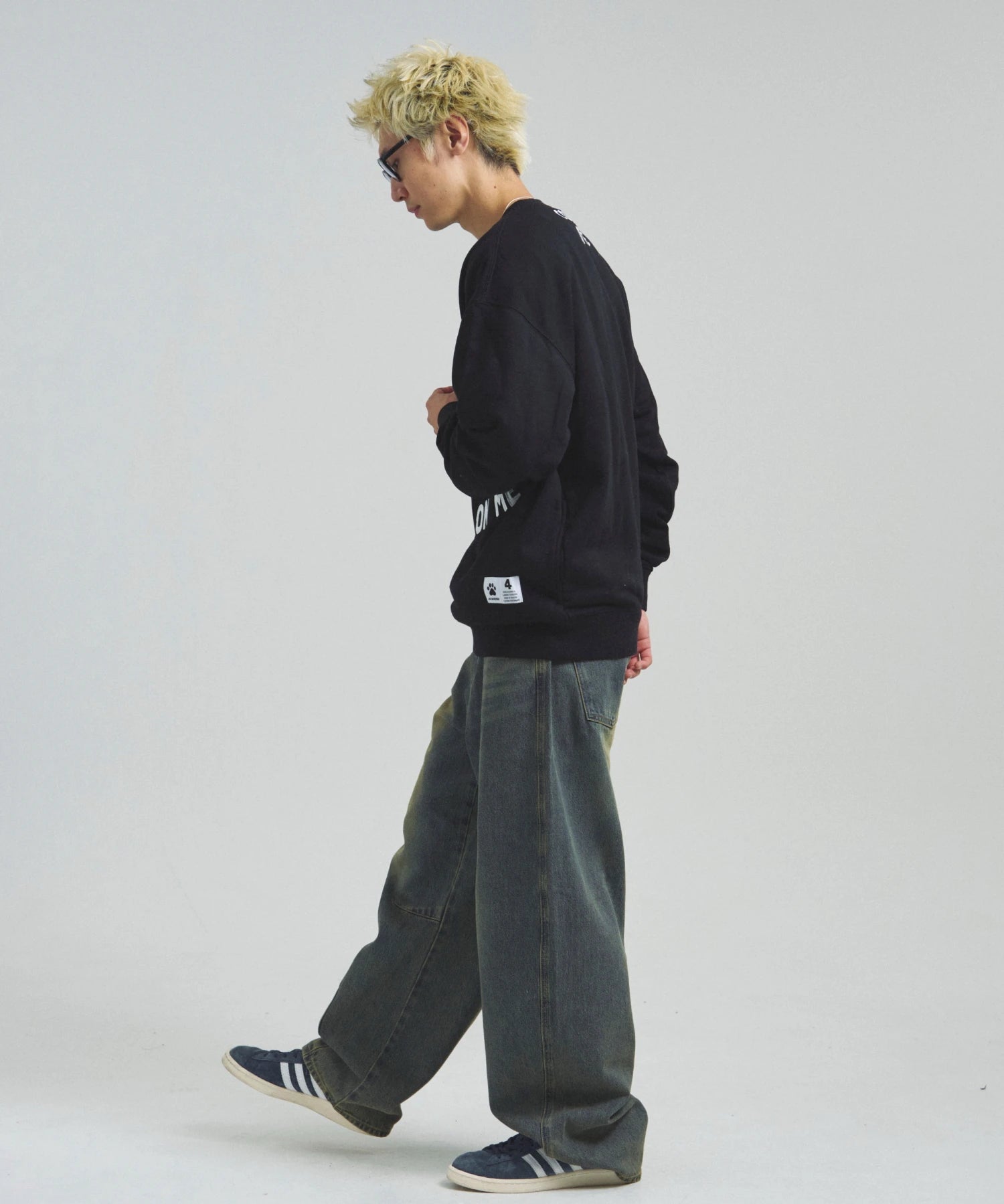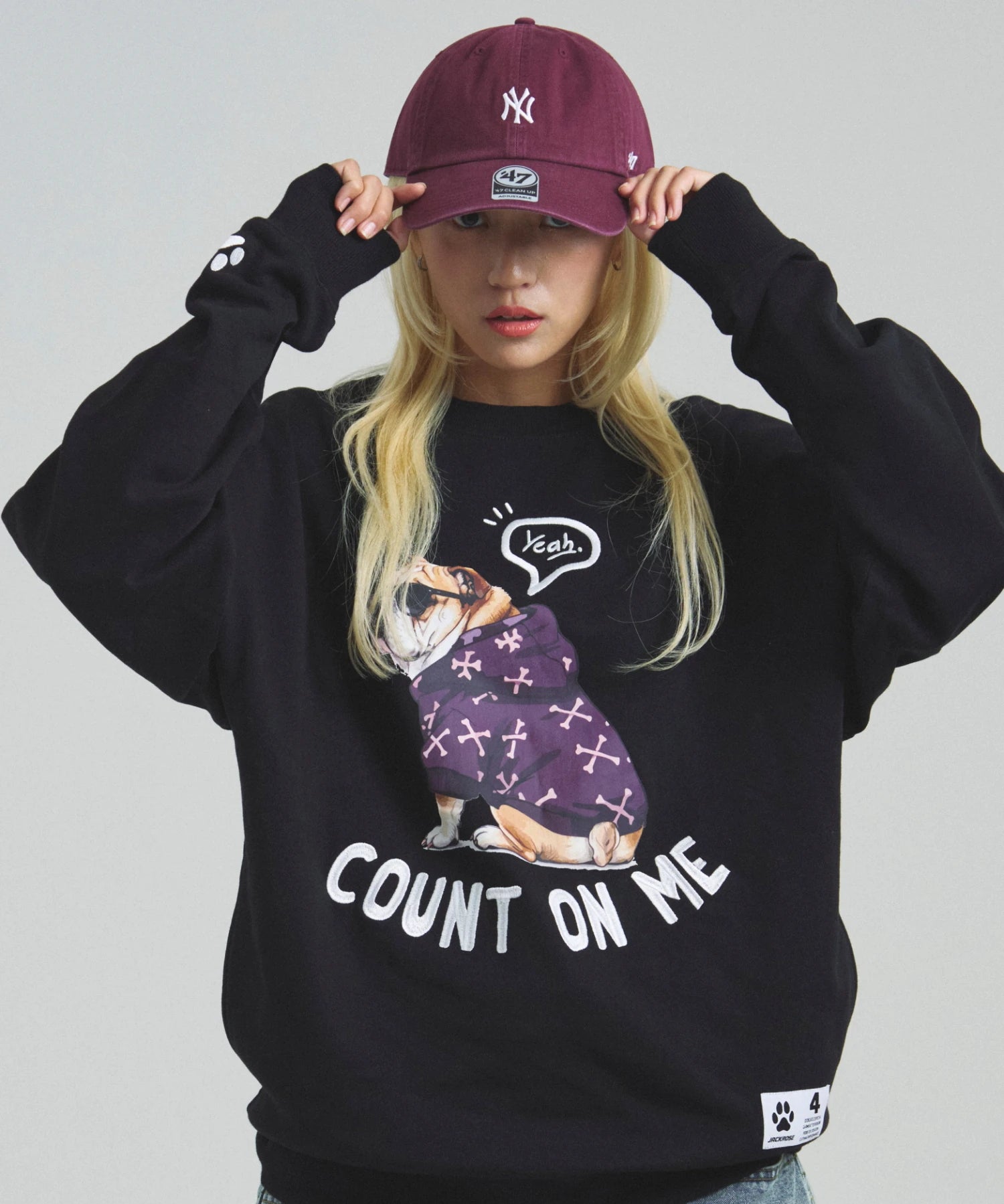 愛らしい犬と猫のグラフィックをあしらったクルースウェット。フロントはユーモアのある大判グラフィックを施し、存在感抜群の仕上がりになっています。背面首元にはシンプルなロゴ刺繍を配置。
