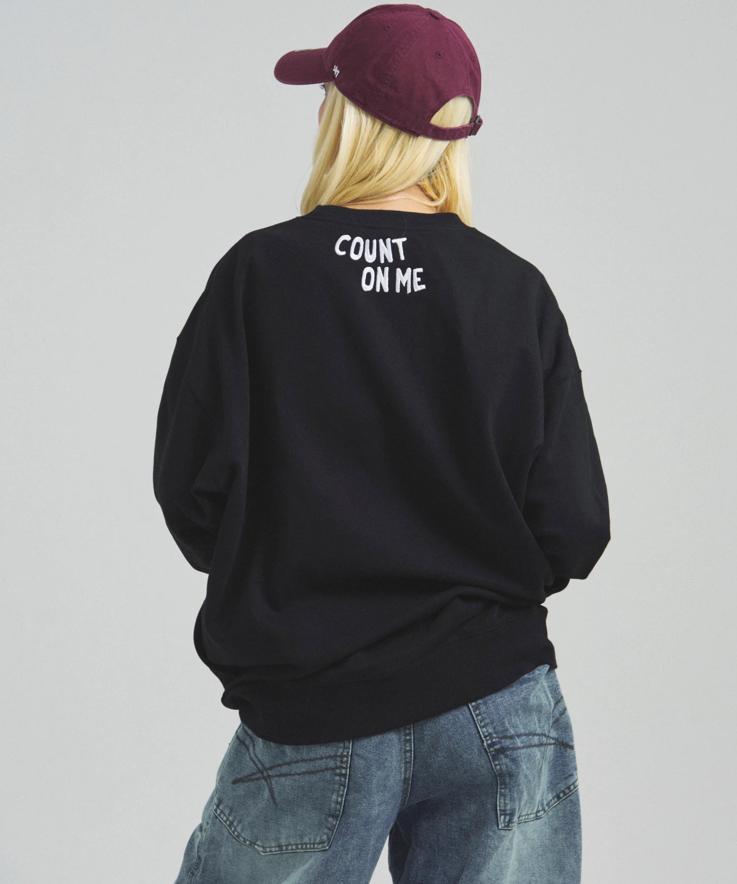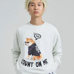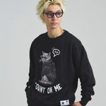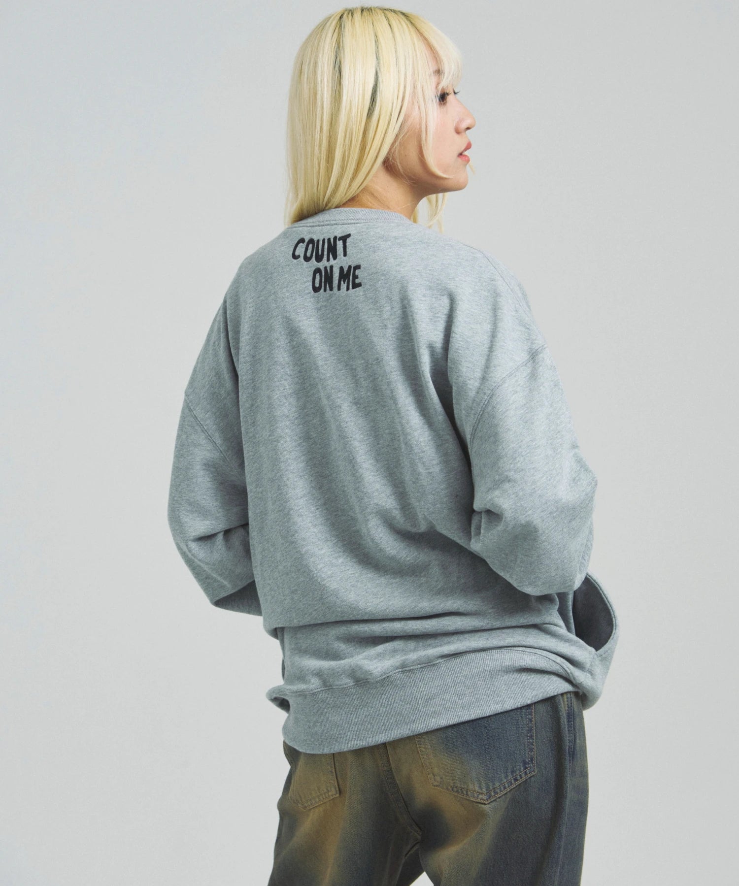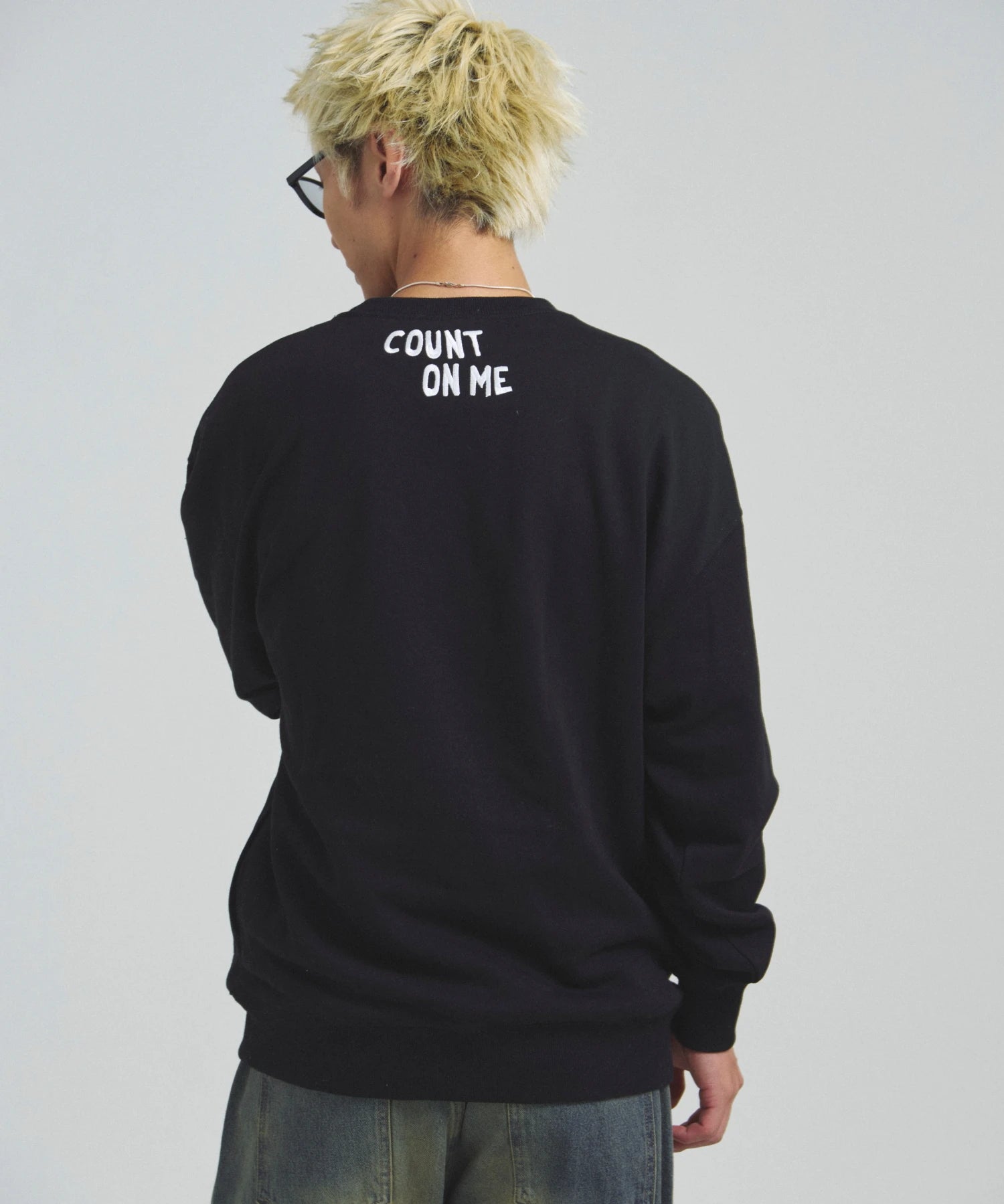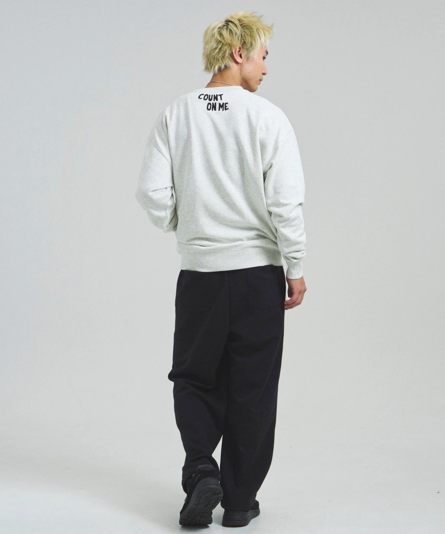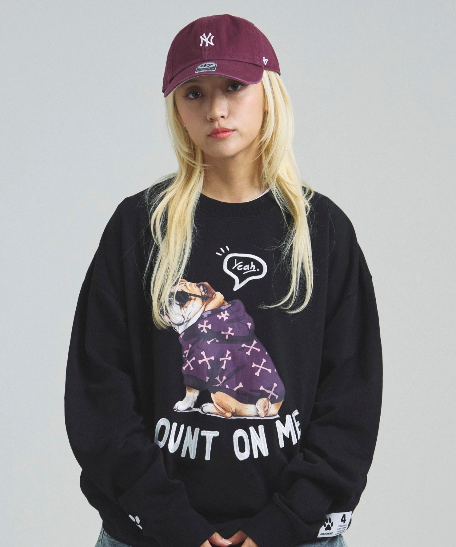 愛らしい犬と猫のグラフィックをあしらったクルースウェット。フロントはユーモアのある大判グラフィックを施し、存在感抜群の仕上がりになっています。背面首元にはシンプルなロゴ刺繍を配置。