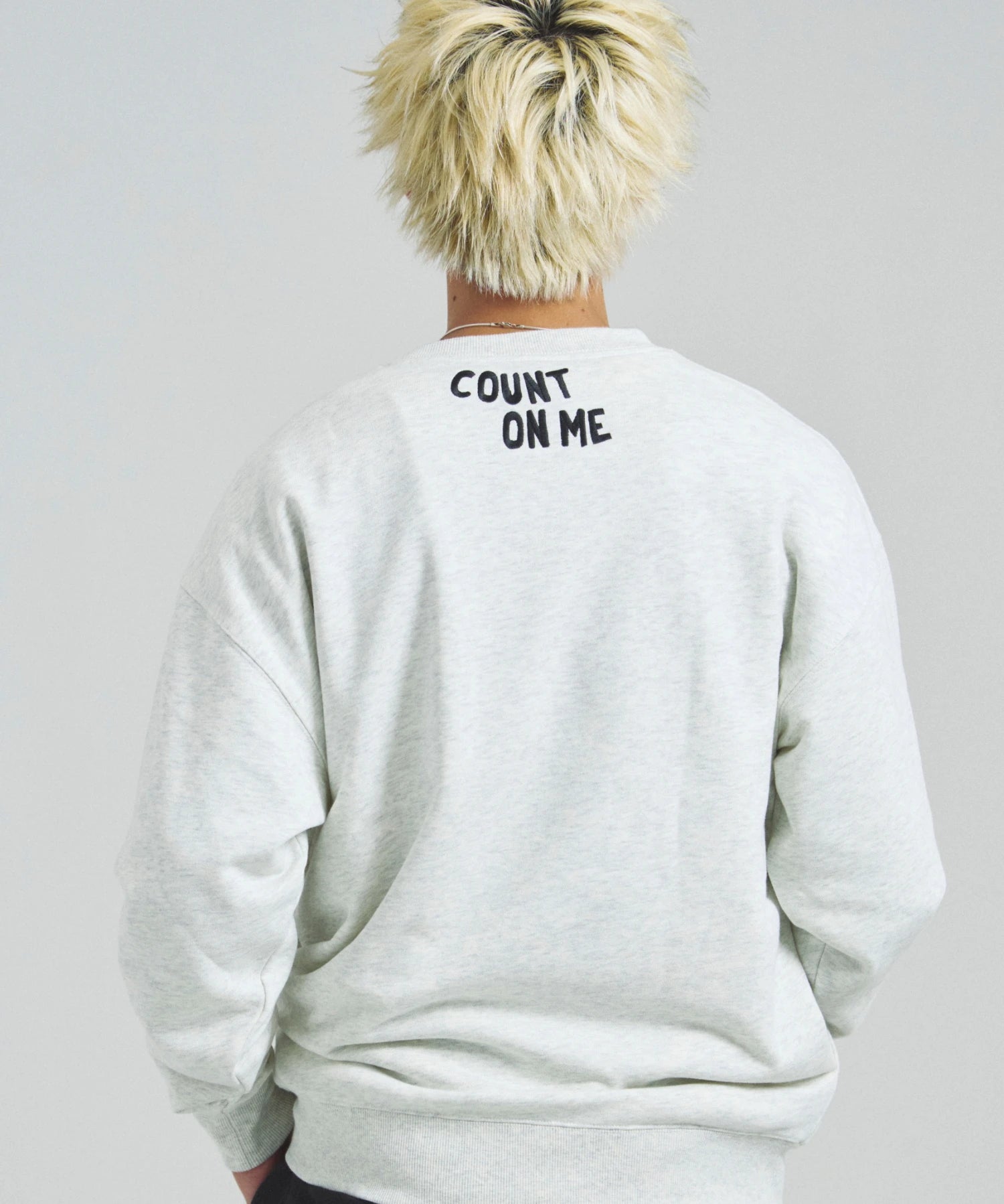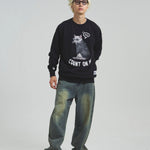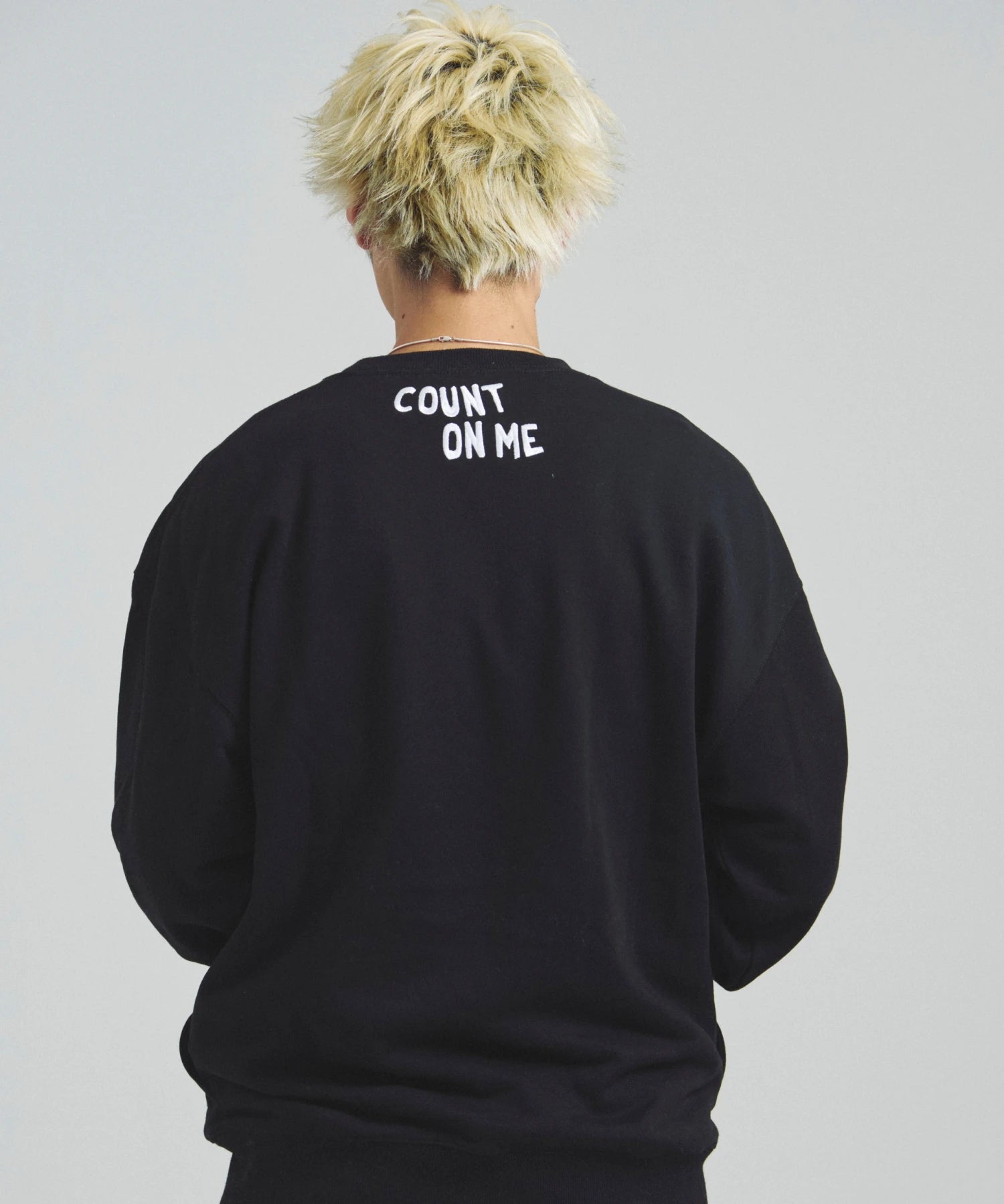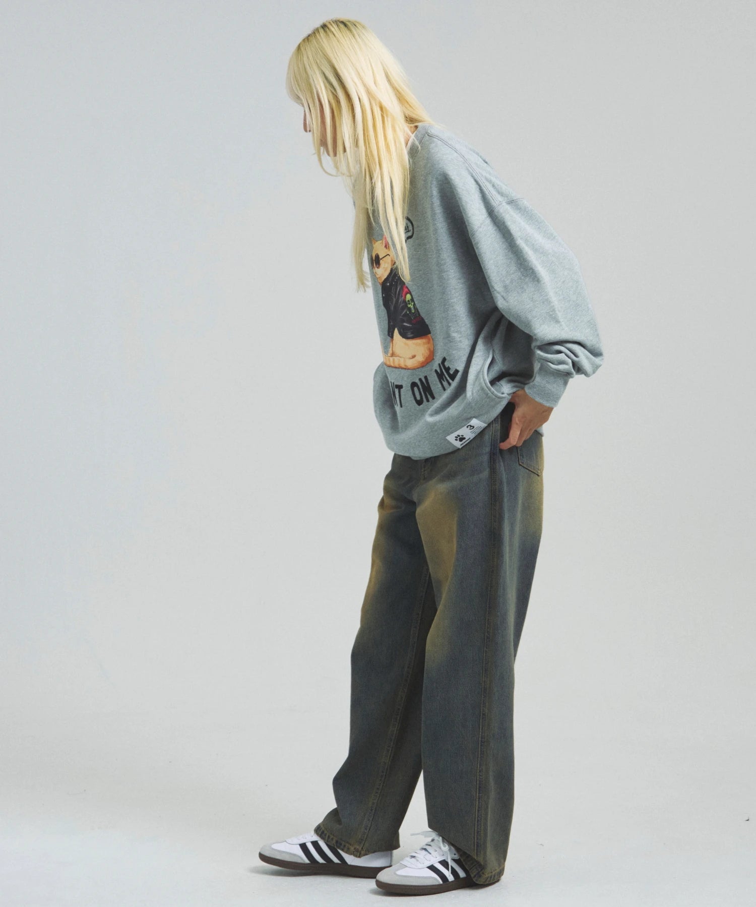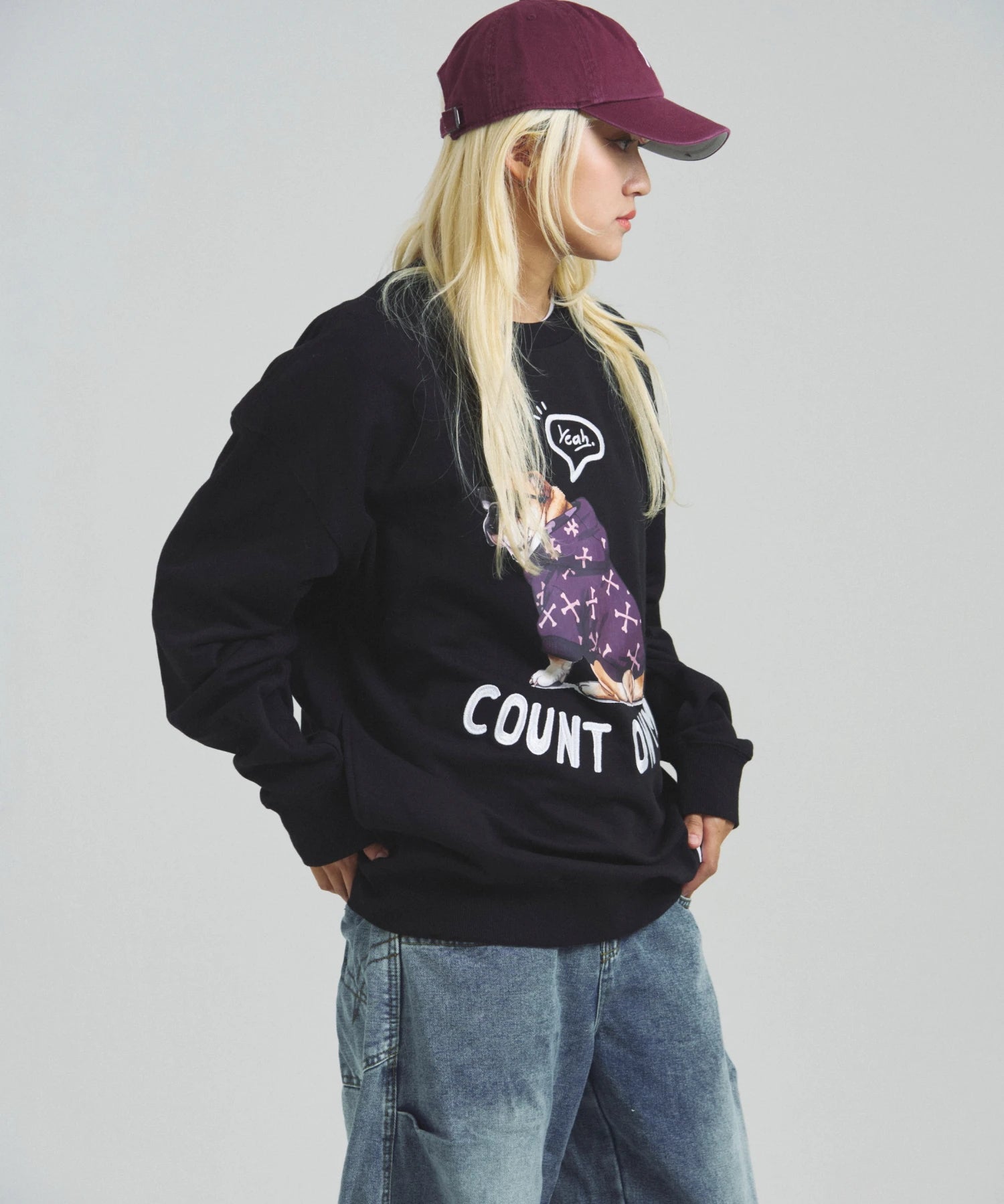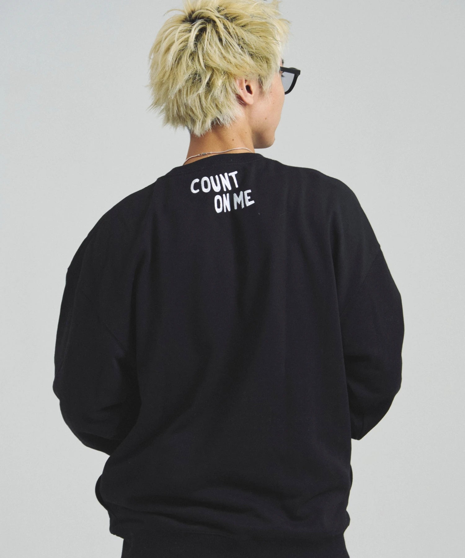 愛らしい犬と猫のグラフィックをあしらったクルースウェット。フロントはユーモアのある大判グラフィックを施し、存在感抜群の仕上がりになっています。背面首元にはシンプルなロゴ刺繍を配置。
