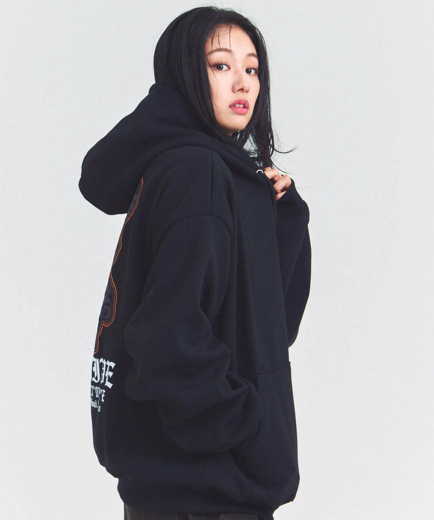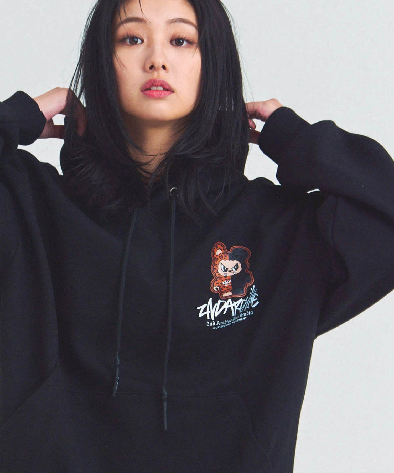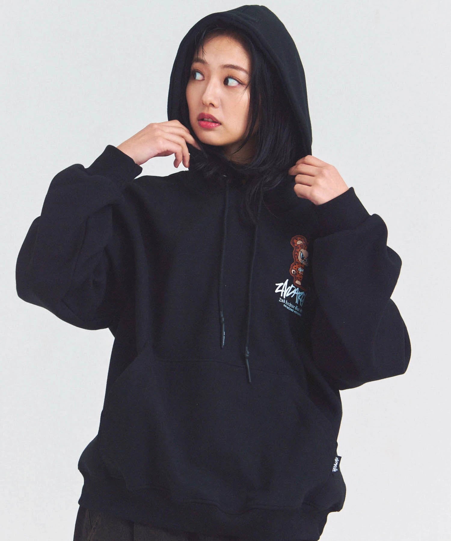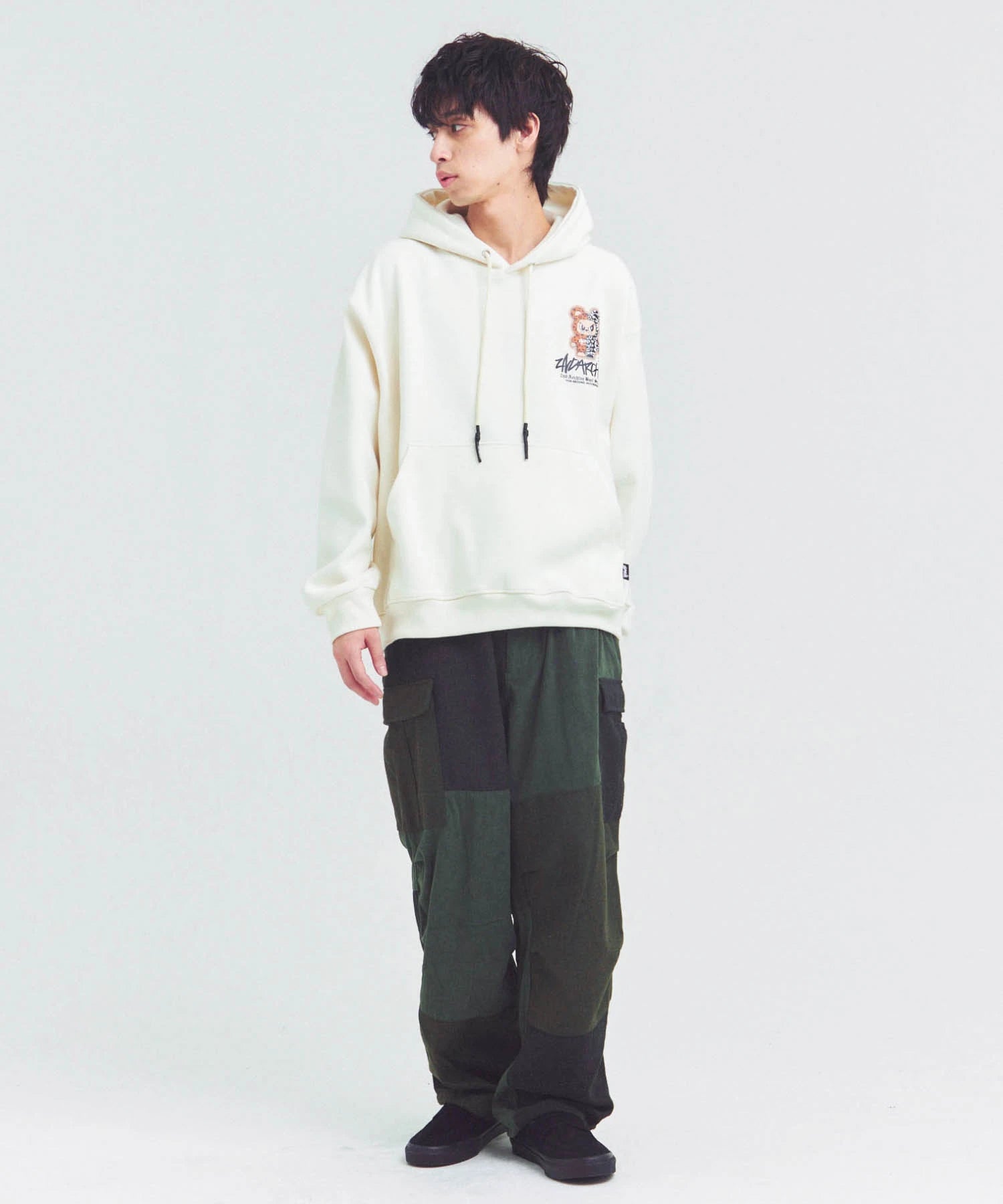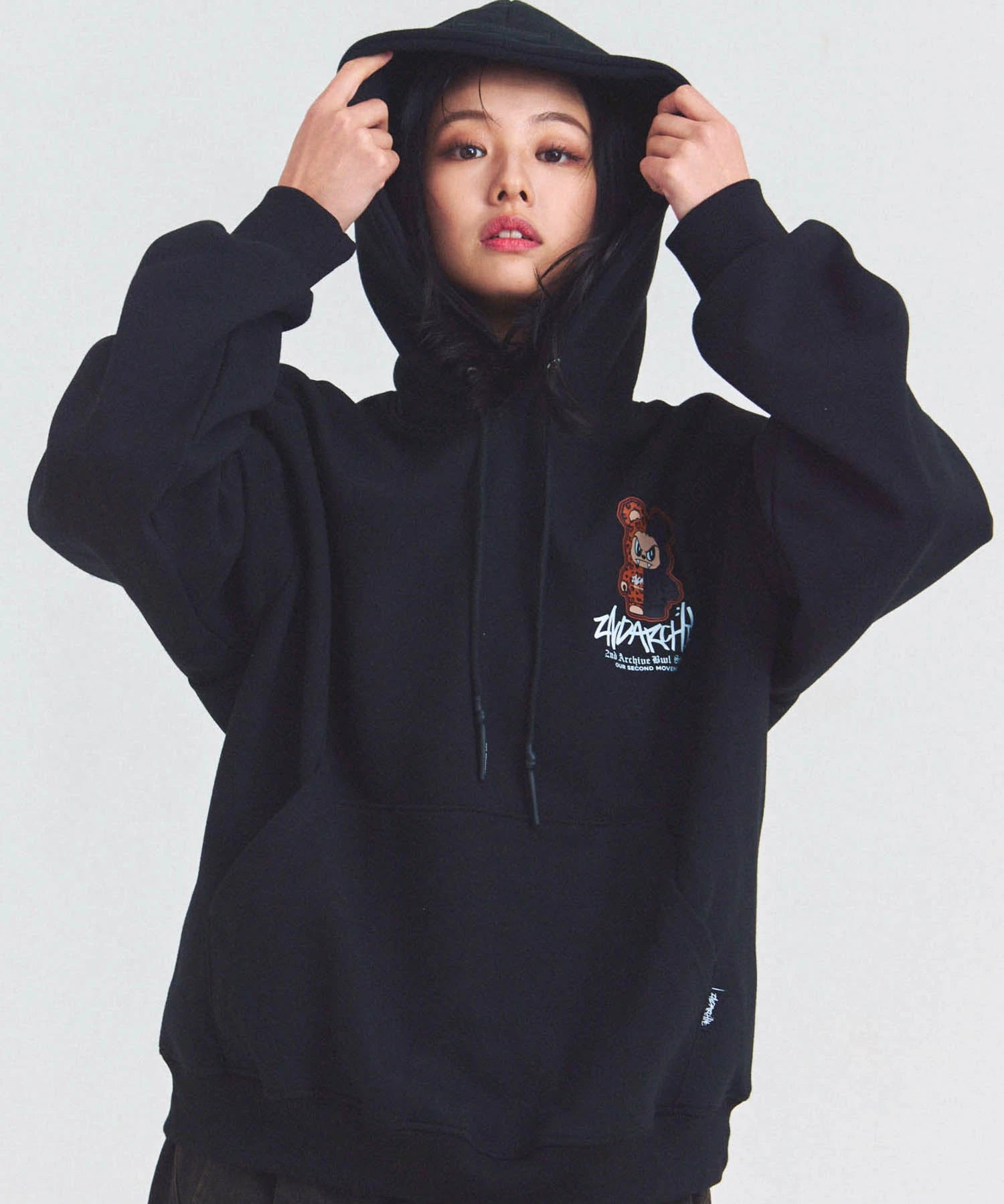 韓国発ストリートブランドらしい大胆なグラフィックをフロントに配したプルオーバーパーカー。