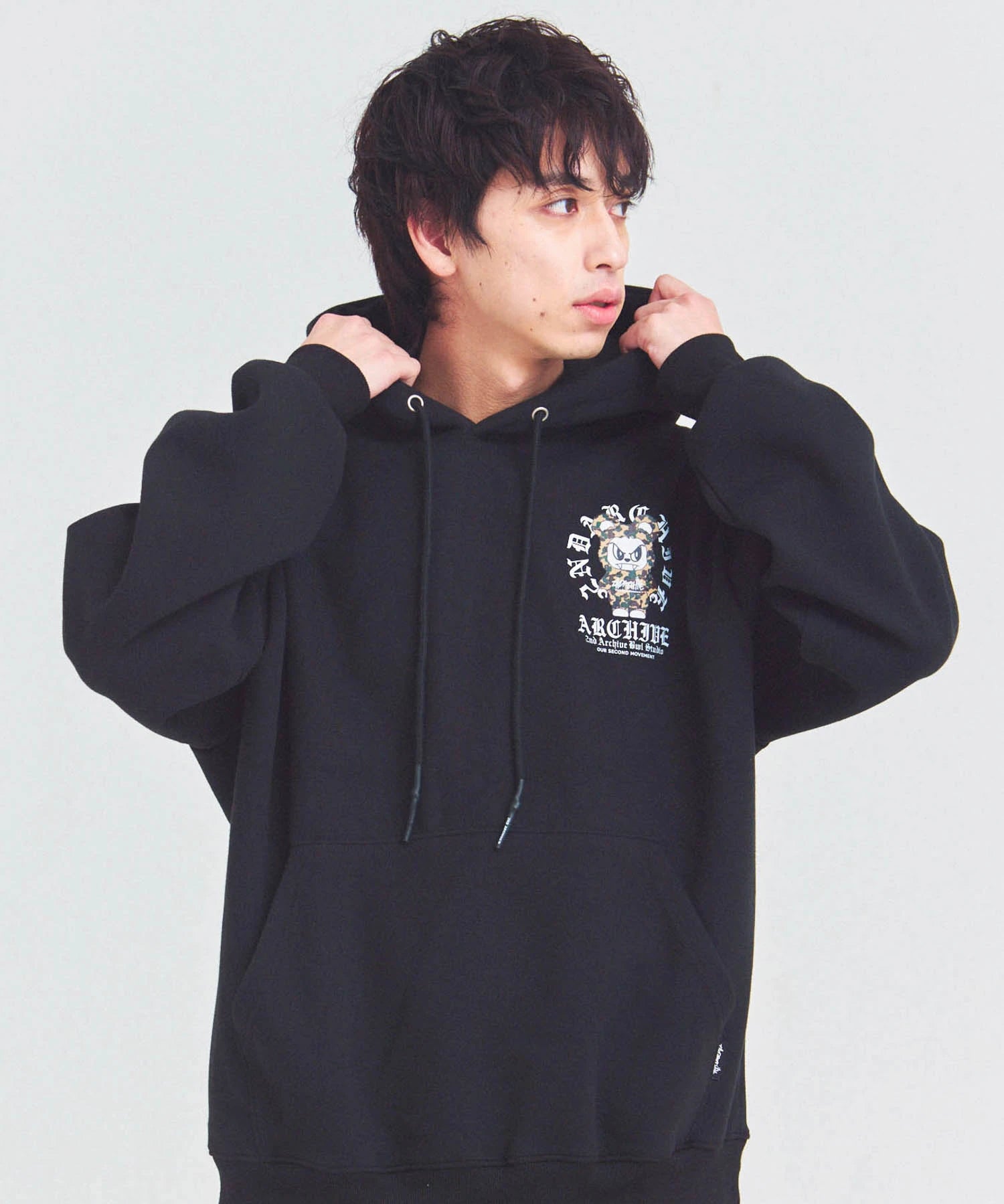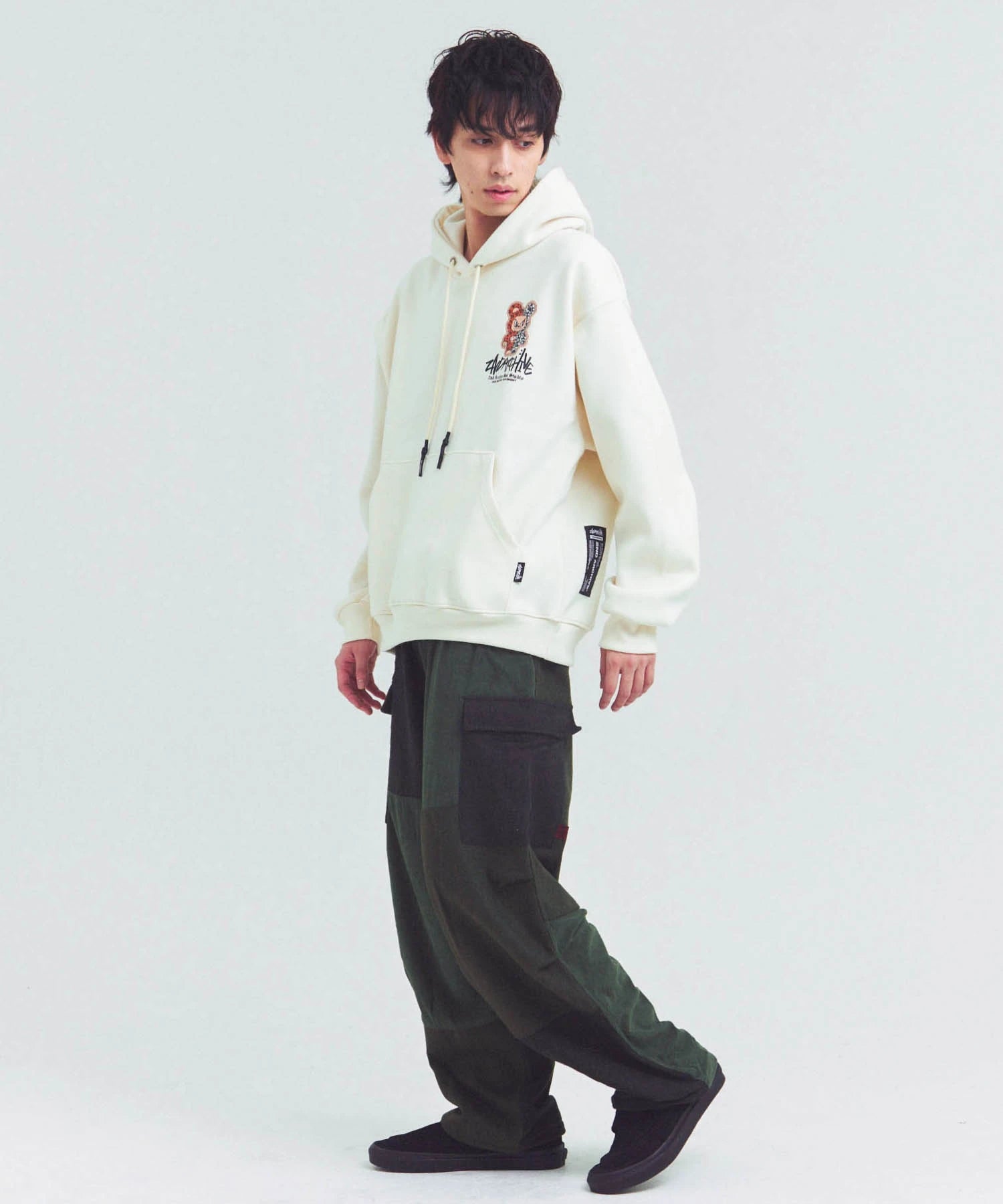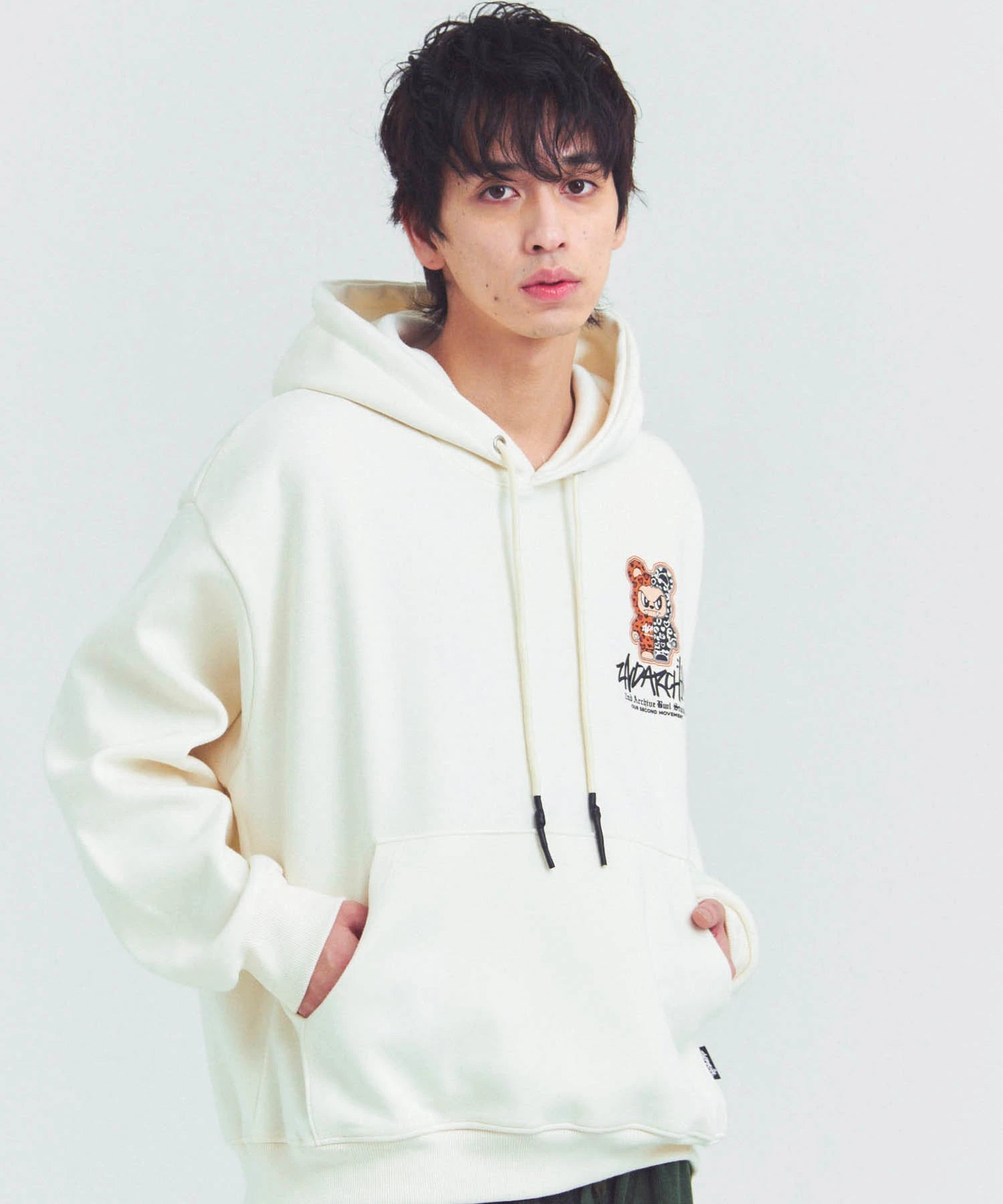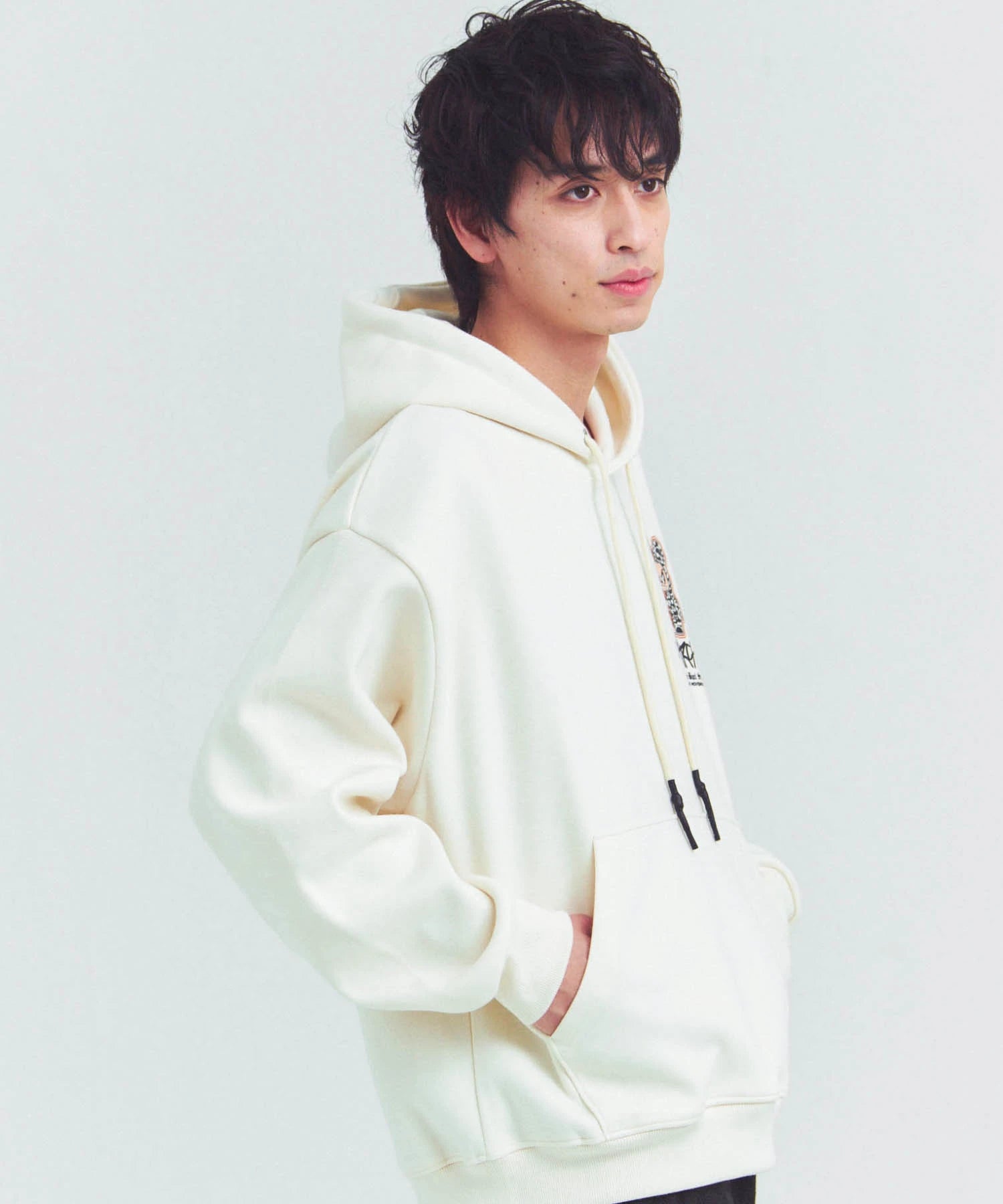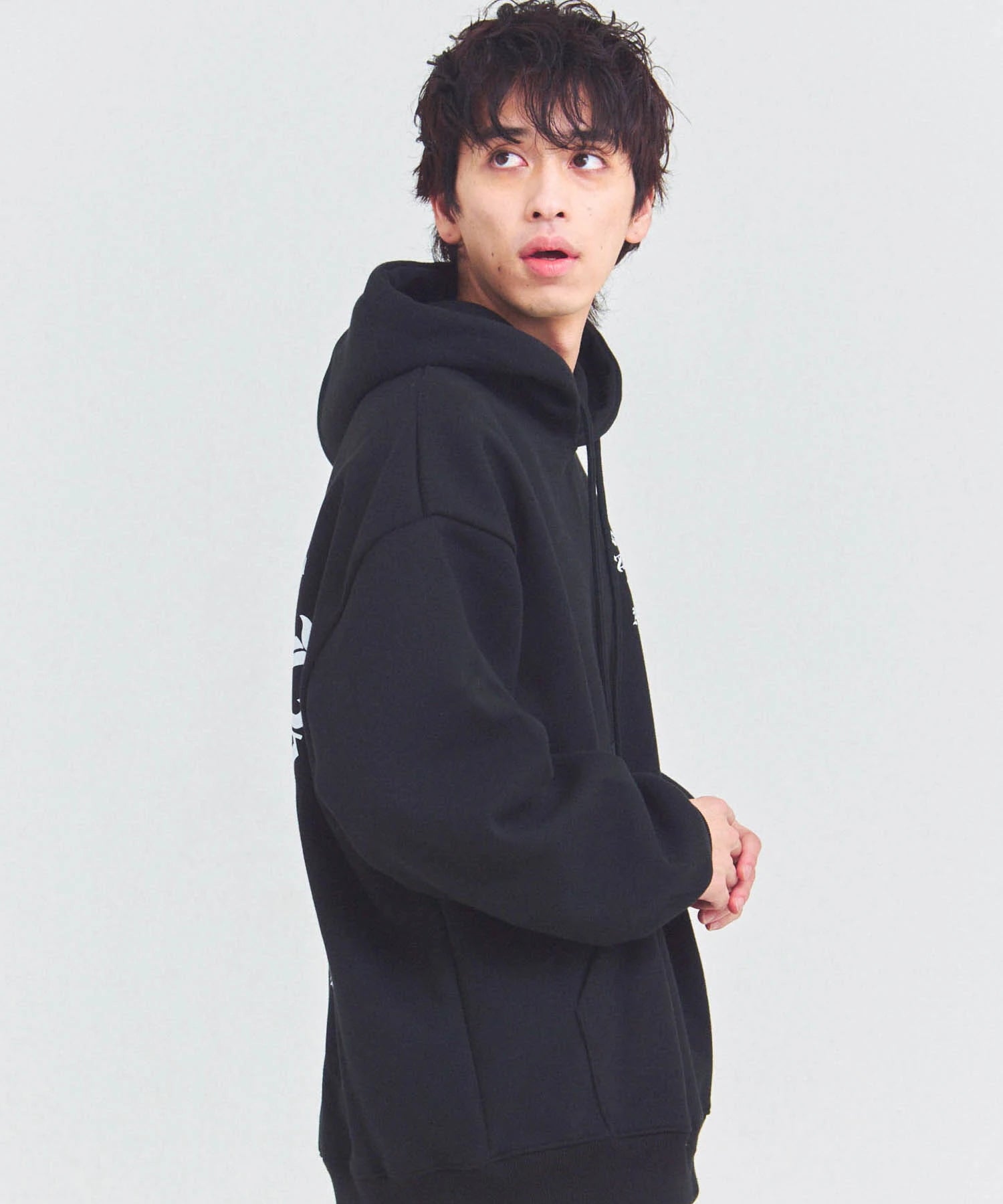韓国発ストリートブランドらしい大胆なグラフィックをフロントに配したプルオーバーパーカー。