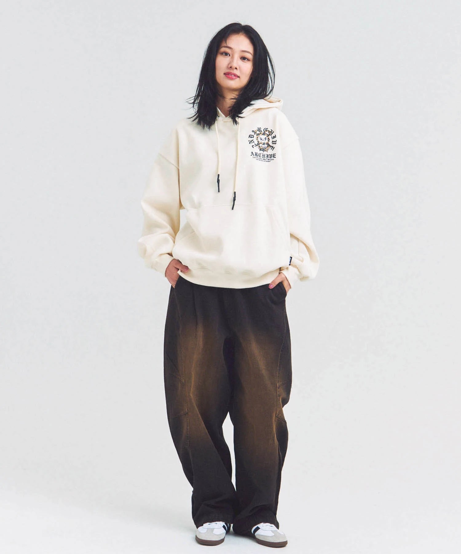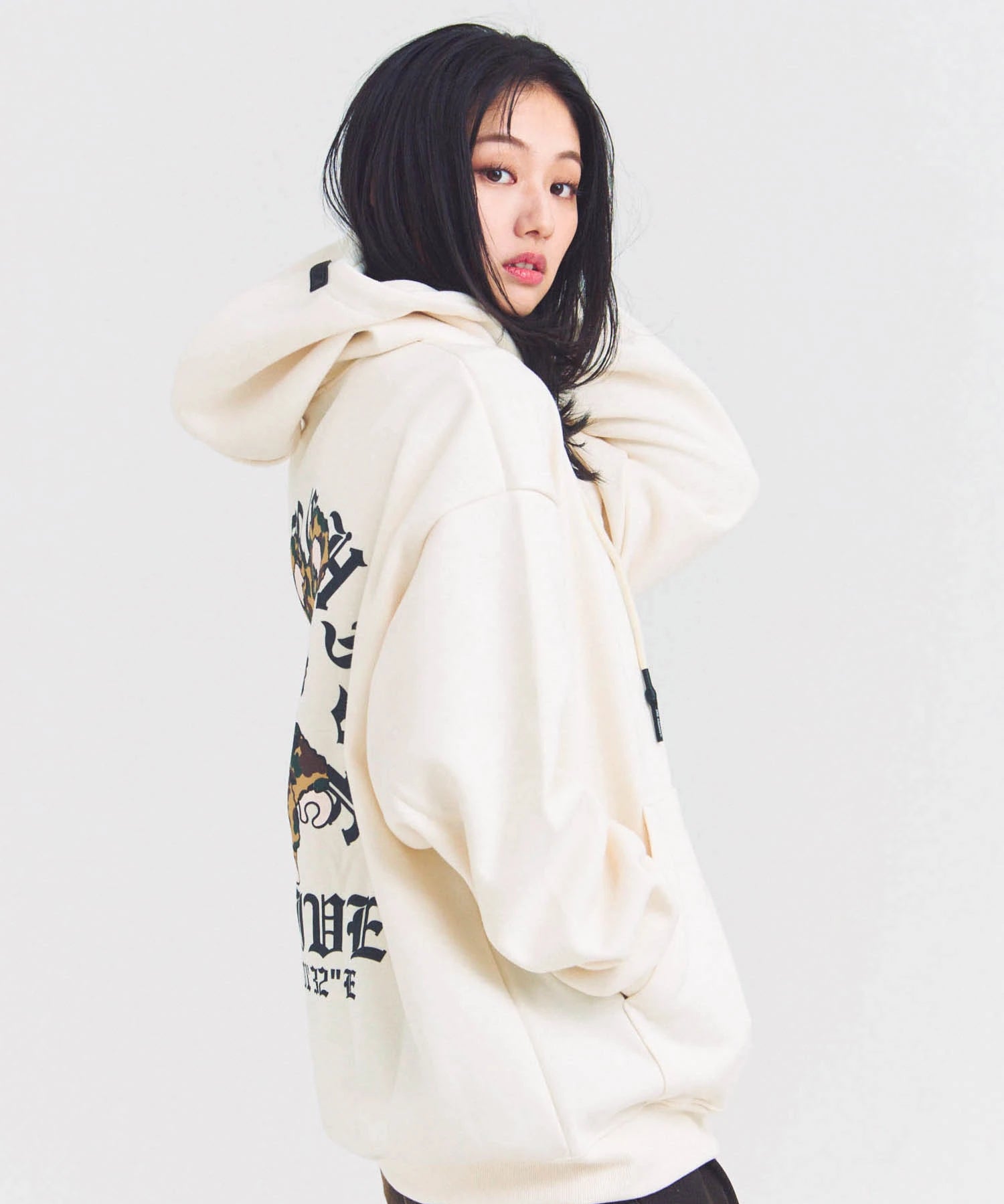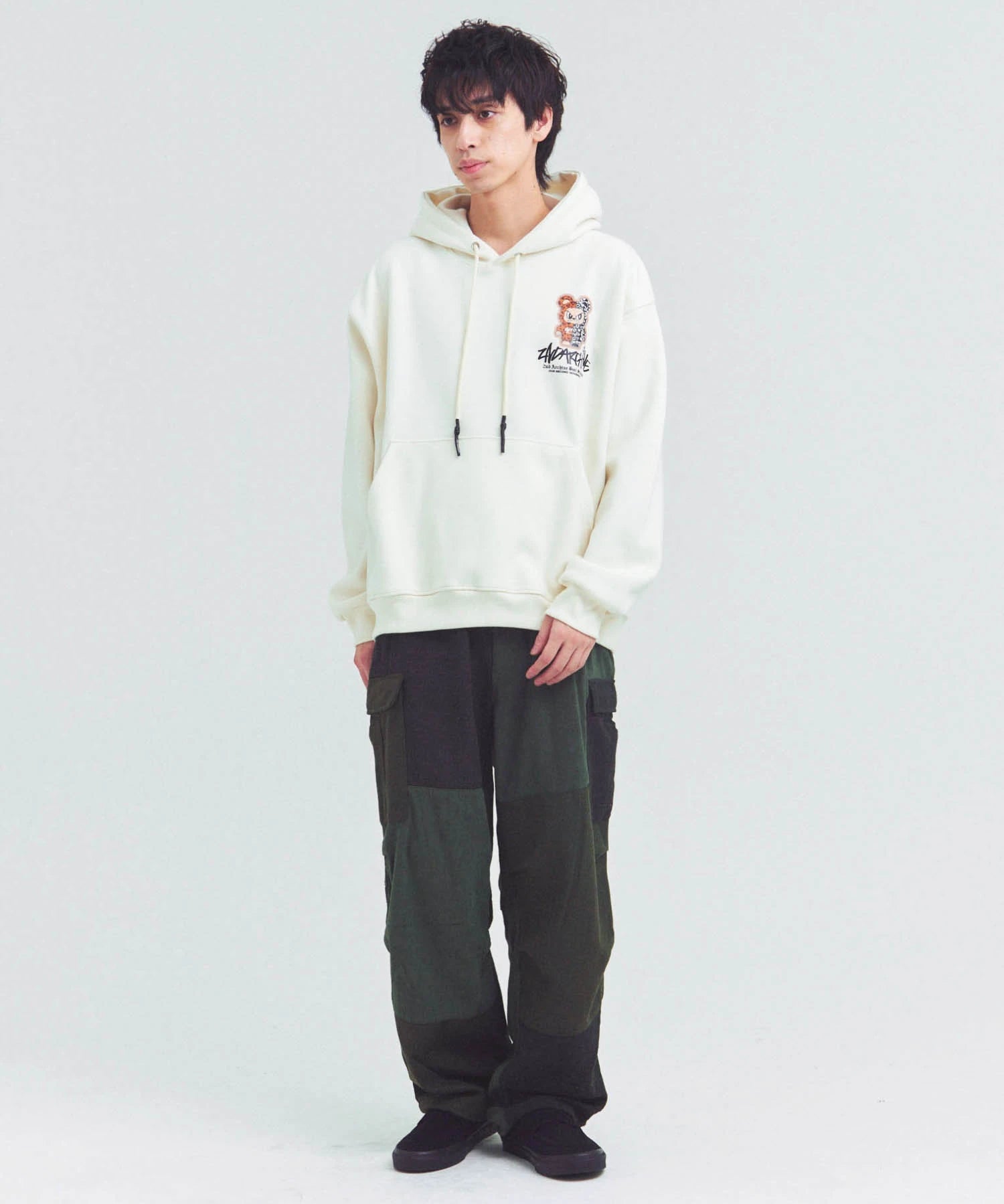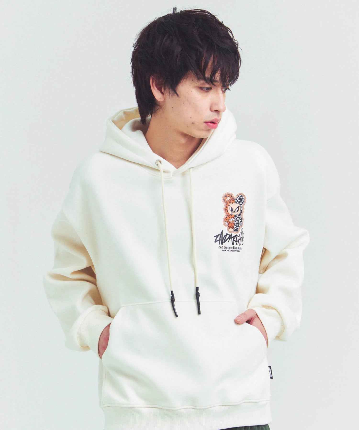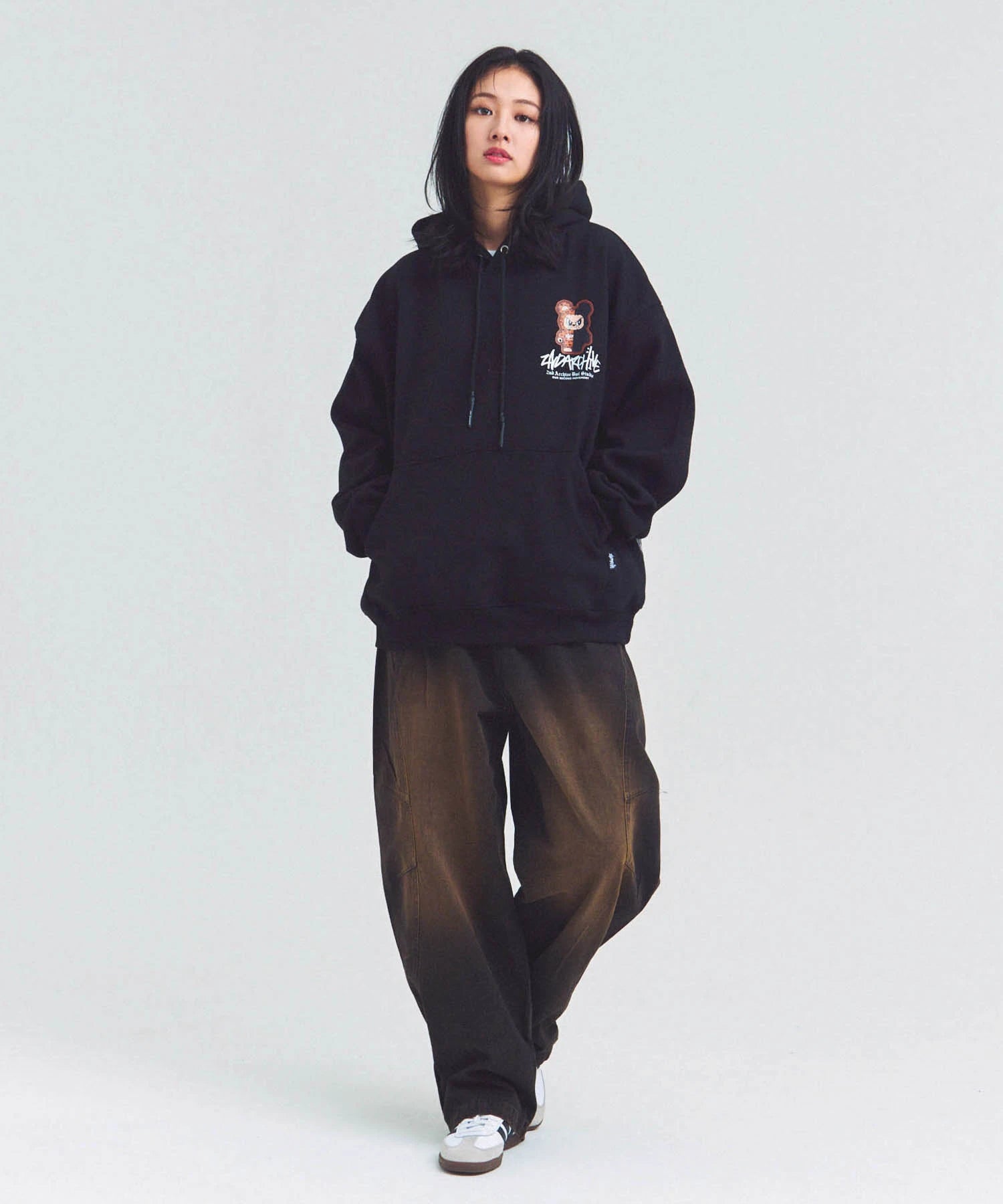 韓国発ストリートブランドらしい大胆なグラフィックをフロントに配したプルオーバーパーカー。